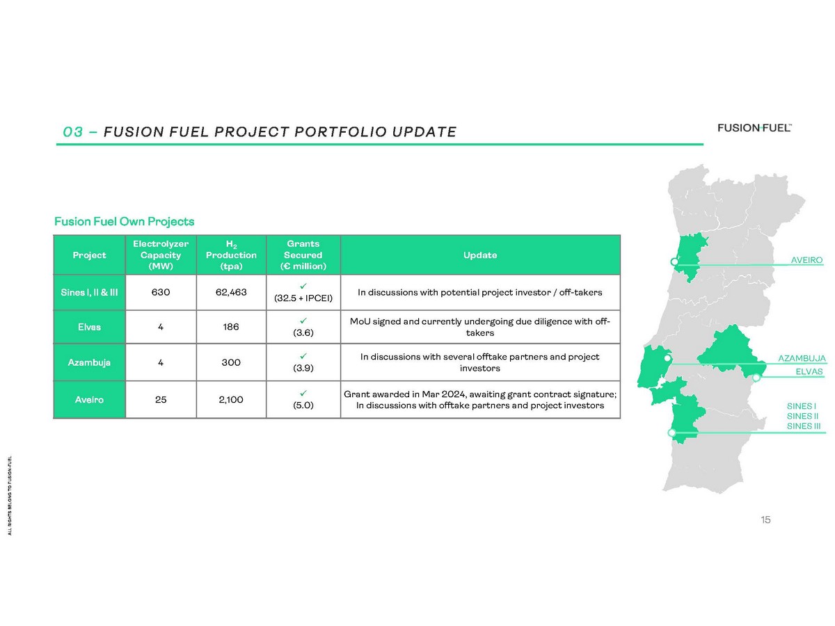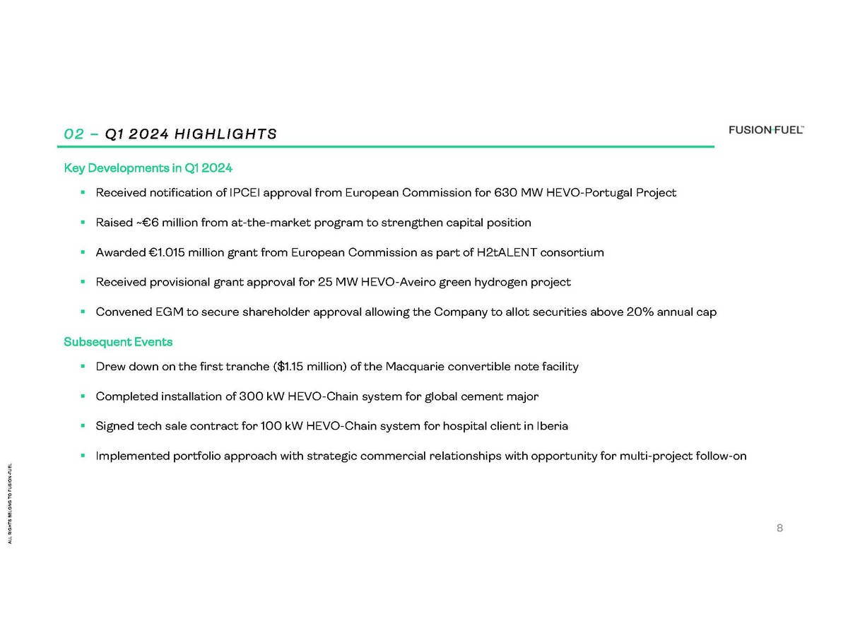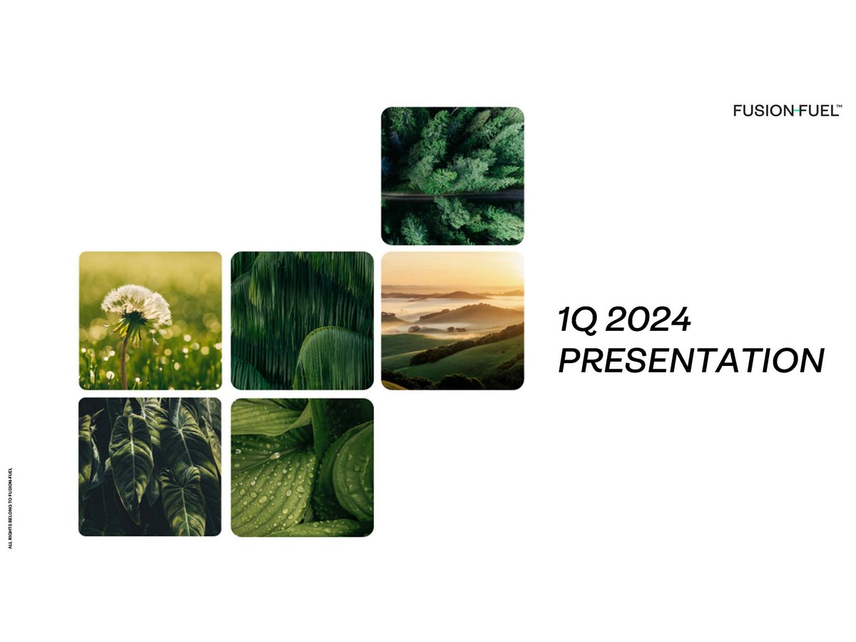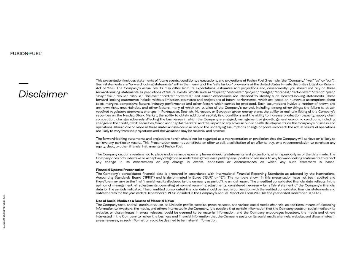 ALL RIGHTS BELONG TO FUSION - FUEL — Disclaimer This presentation includes statements of future events, conditions, expectations, and projections of Fusion Fuel Green plc (the “Company,” "we,” “us” or “our”) . Such statements are “forward looking statements” within the meaning of the “safe harbor” provisions of the United States Private Securities Litigation Reform Act of 1995 . The Company’s actual results may differ from its expectations, estimates and projections and, consequently, you should not rely on these forward - looking statements as predictions of future events . Words such as “expect,” “estimate,” “project,” “budget,” “forecast,” “anticipate,” “intend,” “plan,” “may,” “will,” “could,” “should,” “believe,” “predict,” “potential,” and similar expressions are intended to identify such forward - looking statements . These forward - looking statements include, without limitation, estimates and projections of future performance, which are based on numerous assumptions about sales, margins, competitive factors, industry performance and other factors which cannot be predicted . Such assumptions involve a number of known and unknown risks, uncertainties, and other factors, many of which are outside of the Company’s control, including, among other things : the failure to obtain required regulatory approvals ; changes in Portuguese, Spanish, Moroccan, or European green energy plans ; the ability to maintain listing of the Company’s securities on the Nasdaq Stock Market ; the ability to obtain additional capital ; field conditions and the ability to increase production capacity ; supply chain competition ; changes adversely affecting the businesses in which the Company is engaged ; management of growth ; general economic conditions, including changes in the credit, debit, securities, financial or capital markets ; and the impact of any adverse public health developments on the Company’s business and operations . Should one or more of these material risks occur or should the underlying assumptions change or prove incorrect, the actual results of operations are likely to vary from the projections and the variations may be material and adverse . The forward - looking statements and projections herein should not be regarded as a representation or prediction that the Company will achieve or is likely to achieve any particular results . This Presentation does not constitute an offer to sell, a solicitation of an offer to buy, or a recommendation to purchase any equity, debt, or other financial instruments of Fusion Fuel . The Company cautions readers not to place undue reliance upon any forward - looking statements and projections, which speak only as of the date made . The Company does not undertake or accept any obligation or undertaking to release publicly any updates or revisions to any forward - looking statements to reflect any change in its expectations or any change in events, conditions or circumstances on which any such statement is based . Financial Update Presentation The Company’s consolidated financial data is prepared in accordance with International Financial Reporting Standards as adopted by the International Accounting Standards Board (“IFRS”) and is denominated in Euros (“EUR” or “€”) . The numbers shown in this presentation have not been audited and therefore may vary to the final financial results disclosed by the company as part of the annual report . The unaudited consolidated financial data reflects, in the opinion of management, all adjustments, consisting of normal recurring adjustments, considered necessary for a fair statement of the Company's financial data for the periods indicated . The unaudited consolidated financial data should be read in conjunction with the audited consolidated financial statements and notes thereto for the year ended December 31 , 2023 included in the Company's Annual Report on Form 20 - F for the year ended December 31 , 2023 . Use of Social Media as a Source of Material News The Company uses, and will continue to use, its LinkedIn profile, website, press releases, and various social media channels, as additional means of disclosing information to investors, the media, and others interested in the Company . It is possible that certain information that the Company posts on social media or its website, or disseminates in press releases, could be deemed to be material information, and the Company encourages investors, the media and others interested in the Company to review the business and financial information that the Company posts on its social media channels, website, and disseminates in press releases, as such information could be deemed to be material information .