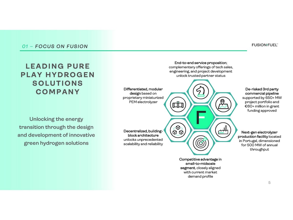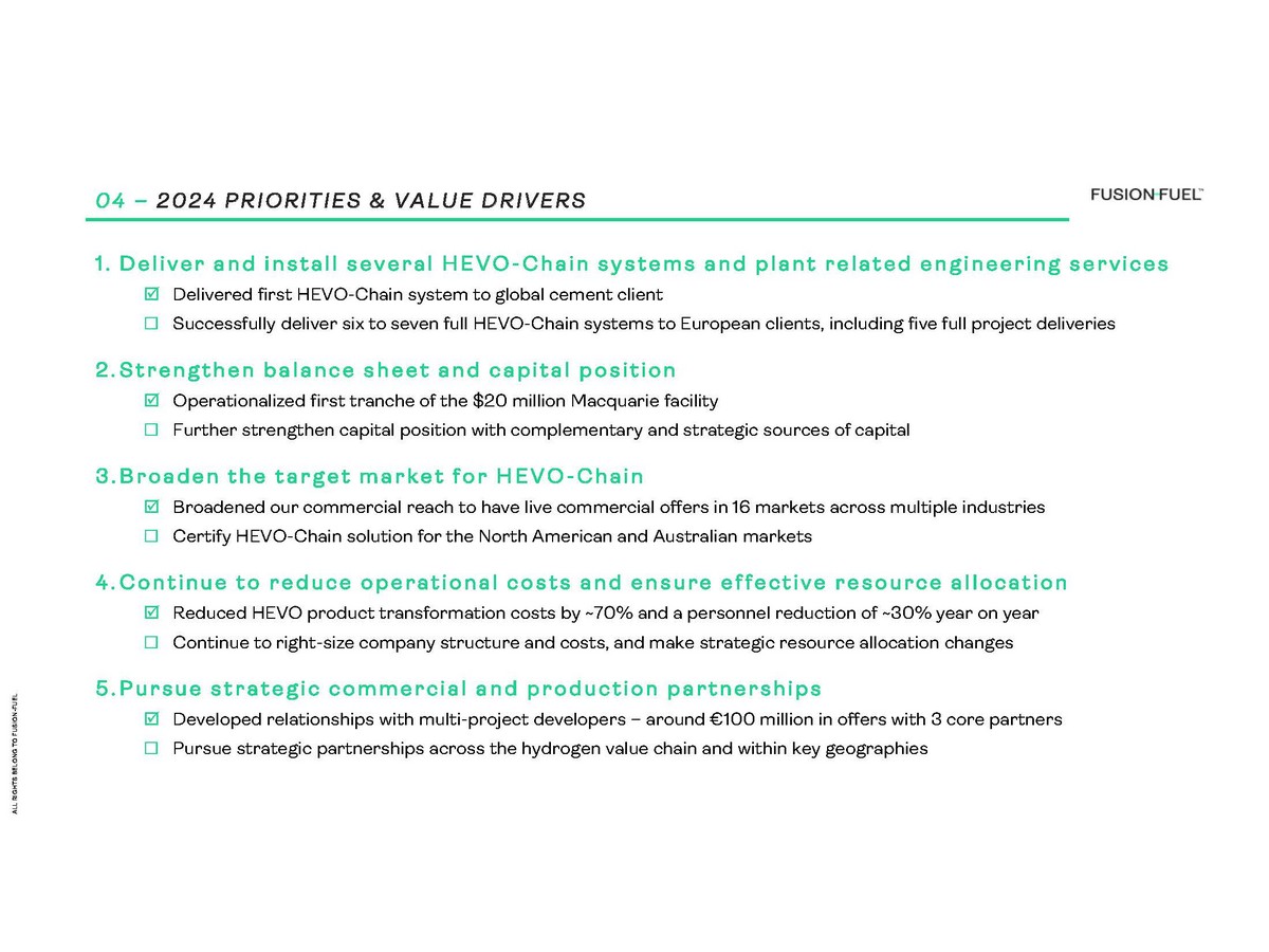 ALL RIGHTS BELONG TO FUSION - FUEL 04 – 2024 PR IORITIES & VALUE DRIVERS 1. D e l i v er a n d i n s ta l l s e v e ral H E V O - C h a in s y s te ms a n d p l a n t re l a te d e n g i n e e r in g s e r v i c e s  Delivered first HEVO - Chain system to global cement client □ Successfully deliver six to seven full HEVO - Chain systems to European clients, including five full project deliveries 2 . S tre n g th e n b a l a nc e s h e e t a n d c a pita l p o s i t io n  Operationalized first tranche of the $20 million Macquarie facility □ Further strengthen capital position with complementary and strategic sources of capital 3 . B ro a de n th e ta rg e t m a rke t f o r H E V O - C h a i n  Broadened our commercial reach to have live commercial offers in 16 markets across multiple industries □ Certify HEVO - Chain solution for the North American and Australian markets 4. C o n t inu e to re d u c e o p e rati o n a l c o s ts a n d e n s u re e f f e ctiv e re so u rc e a l l o c a t io n  Reduced HEVO product transformation costs by ~70% and a personnel reduction of ~30% year on year □ Continue to right - size company structure and costs, and make strategic resource allocation changes 5 . P u rsu e s tra te g i c c o m m e rci a l a n d p ro d u c t i o n p a rtn e rsh ip s  Developed relationships with multi - project developers – around €100 million in offers with 3 core partners □ Pursue strategic partnerships across the hydrogen value chain and within key geographies
