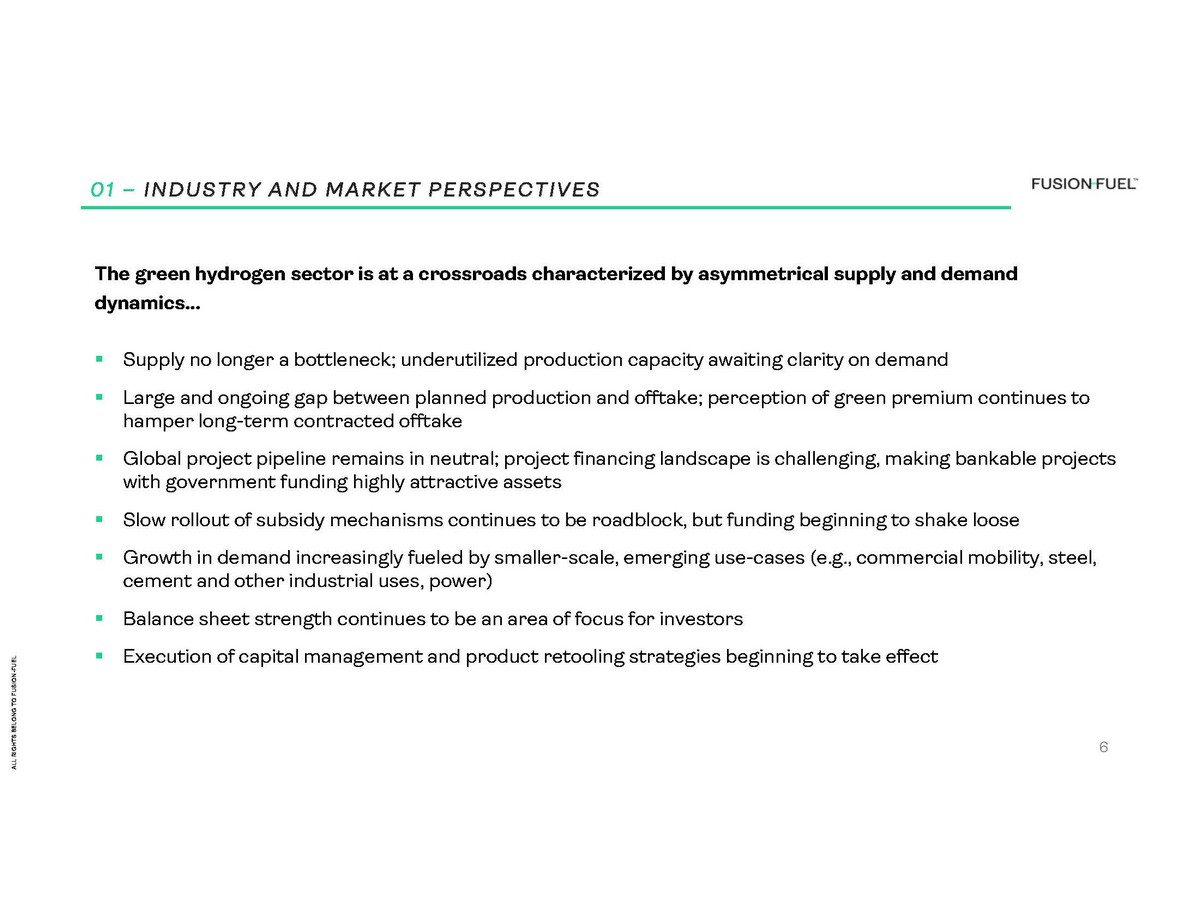 ALL RIGHTS BELONG TO FUSION - FUEL 6 01 – INDUSTRY AND MARKET PERSPECTIVES The green hydrogen sector is at a crossroads characterized by asymmetrical supply and demand dynamics... ▪ Supply no longer a bottleneck; underutilized production capacity awaiting clarity on demand ▪ Large and ongoing gap between planned production and offtake; perception of green premium continues to hamper long - term contracted offtake ▪ Global project pipeline remains in neutral; project financing landscape is challenging, making bankable projects with government funding highly attractive assets ▪ Slow rollout of subsidy mechanisms continues to be roadblock, but funding beginning to shake loose ▪ Growth in demand increasingly fueled by smaller - scale, emerging use - cases (e.g., commercial mobility, steel, cement and other industrial uses, power) ▪ Balance sheet strength continues to be an area of focus for investors ▪ Execution of capital management and product retooling strategies beginning to take effect