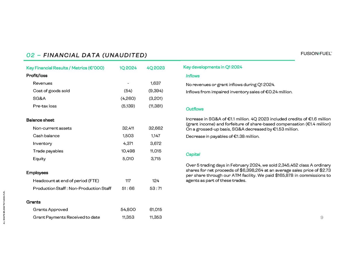 ALL RIGHTS BELONG TO FUSION - FUEL 02 – F INANCIAL DATA ( U NAUDITED) Key Financial Results / Metrics (€’000) 1Q 2024 4Q 2023 Profit/loss 1,637 - Revenues (9,394) (54) Cost of goods sold (3,201) (4,260) SG&A (11,381) (5,139) Pre - tax loss Balance sheet 32,662 32,411 Non - current assets 1,147 1,503 Cash balance 3,672 4,371 Inventory 11,015 10,498 Trade payables 3,715 5,010 Equity Employees 124 53 : 71 117 51 : 66 Headcount at end of period (FTE) Production Staff : Non - Production Staff Grants 61,015 54,800 Grants Approved 11,353 11,353 Grant Payments Received to date Key developments in Q1 2024 Inflows No revenues or grant inflows during Q1 2024. Inflows from impaired inventory sales of €0.24 million. Outflows Increase in SG&A of € 1 . 1 million . 4 Q 2023 included credits of € 1 . 6 million (grant income) and forfeiture of share - based compensation (€ 1 . 4 million) On a grossed - up basis, SG&A decreased by € 1 . 53 million . Decrease in payables of € 1 . 38 million . Capital Over 5 trading days in February 2024 , we sold 2 , 345 , 452 class A ordinary shares for net proceeds of $ 6 , 398 , 264 at an average sales price of $ 2 . 73 per share through our ATM facility . We paid $ 165 , 878 in commissions to agents as part of these trades . 9