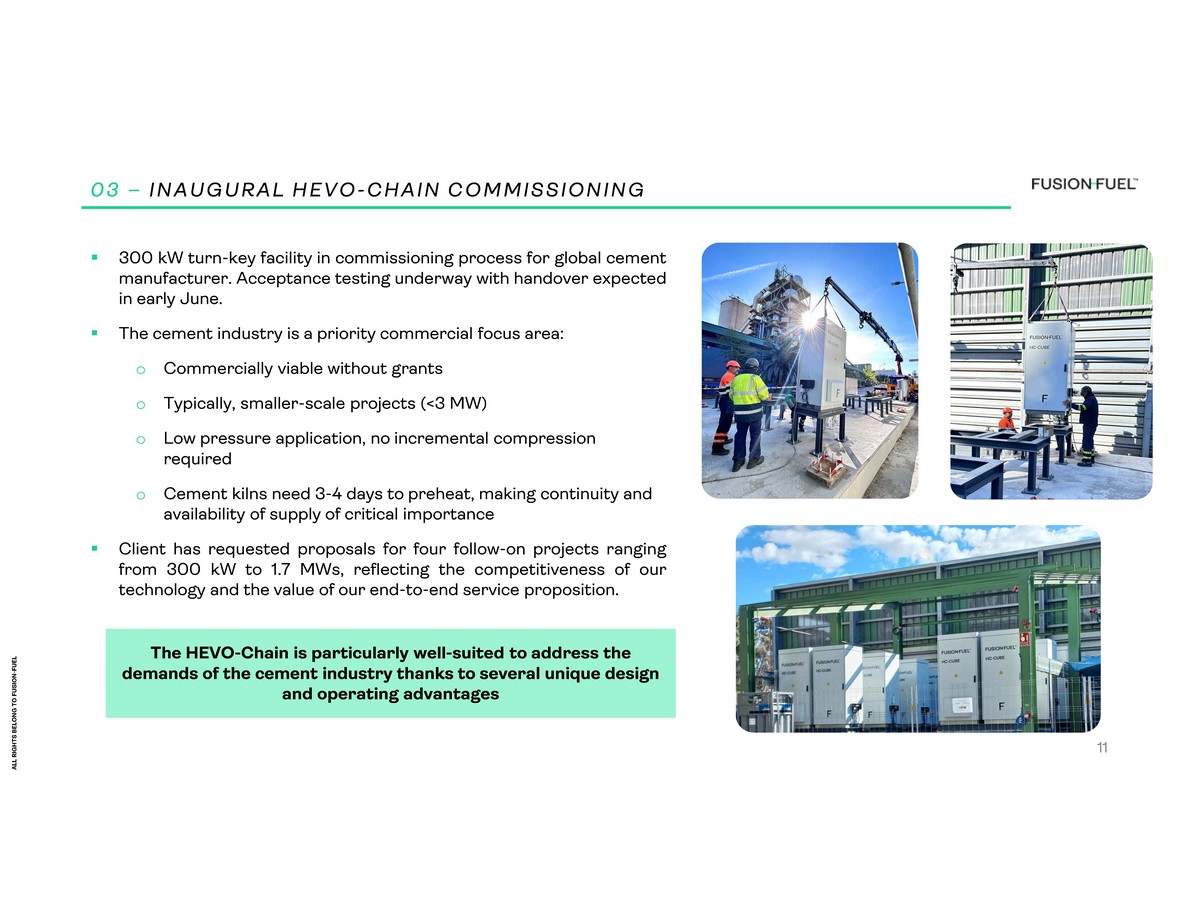 ALL RIGHTS BELONG TO FUSION - FUEL 03 – INAUGURAL HEVO - CHAIN COMMISSIONING ▪ 300 kW turn - key facility in commissioning process for global cement manufacturer . Acceptance testing underway with handover expected in early June . ▪ The cement industry is a priority commercial focus area: o Commercially viable without grants o Typically, smaller - scale projects (<3 MW) o Low pressure application, no incremental compression required o Cement kilns need 3 - 4 days to preheat, making continuity and availability of supply of critical importance ▪ Client has requested proposals for four follow - on projects ranging from 300 kW to 1 . 7 MWs, reflecting the competitiveness of our technology and the value of our end - to - end service proposition . 11 The HEVO - Chain is particularly well - suited to address the demands of the cement industry thanks to several unique design and operating advantages