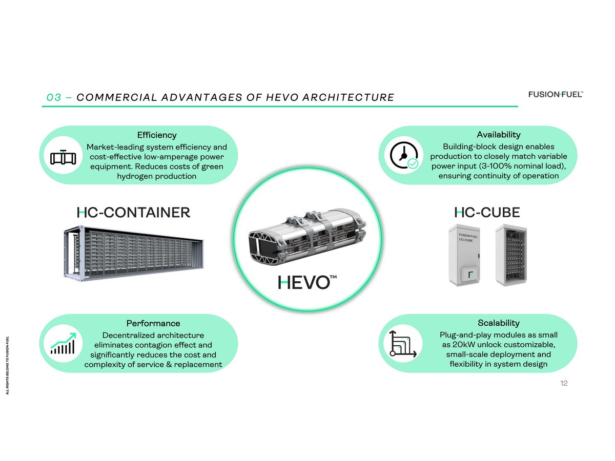 ALL RIGHTS BELONG TO FUSION - FUEL 12 03 – COMMERCIAL ADVANTAGES OF HEV O AR CHITECTURE Efficiency Market - leading system efficiency and cost - effective low - amperage power equipment. Reduces costs of green hydrogen production Performance Decentralized architecture eliminates contagion effect and significantly reduces the cost and complexity of service & replacement Scalability Plug - and - play modules as small as 20kW unlock customizable, small - scale deployment and flexibility in system design Availability Building - block design enables production to closely match variable power input (3 - 100% nominal load), ensuring continuity of operation
