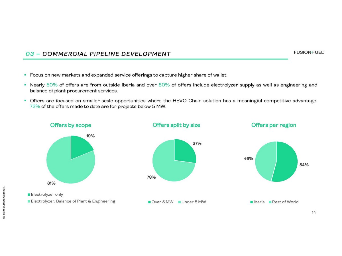 ALL RIGHTS BELONG TO FUSION - FUEL Over the last six months we have significantly expanded our commercial efforts outside the Iberian market 13 03 – COMMERCIAL OFFERS MARKET MAP 6.5 MW 6 MW 8 MW 9 7 9 190 MW 1 1 12.5 MW 13 6 74 MW <5 MW <5 MW <5 MW <5 MW 5 MW 2 <5 MW 20 MW 1 <5 MW 5 - 10 MW >10 MW Project Size Note: market map excludes Fusion Fuel Ʋ s company - owned project portfolio and includes only third - party offers made. <5 MW <5 MW <5 MW