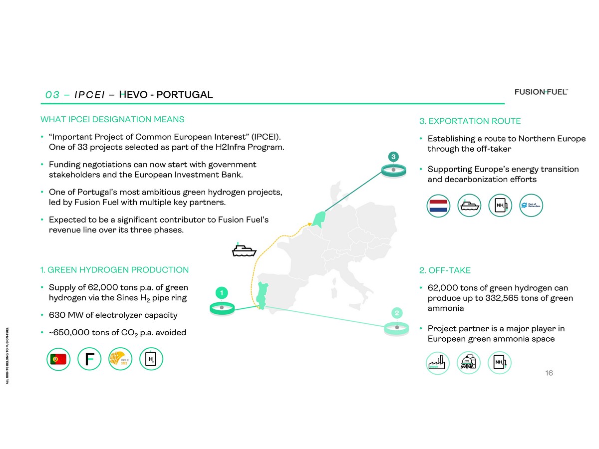 ALL RIGHTS BELONG TO FUSION - FUEL WHAT IPCEI DESIGNATION MEANS • “Important Project of Common European Interest” (IPCEI). One of 33 projects selected as part of the H2Infra Program. • Funding negotiations can now start with government stakeholders and the European Investment Bank. • One of Portugal’s most ambitious green hydrogen projects, led by Fusion Fuel with multiple key partners. • Expected to be a significant contributor to Fusion Fuel’s revenue line over its three phases. 1. GREEN HYDROGEN PRODUCTION • Supply of 62,000 tons p.a. of green 2 hydrogen via the Sines H pipe ring 2 • 630 MW of electrolyzer capacity • ~650,000 tons of CO p.a. avoided 2. OFF - TAKE • 62,000 tons of green hydrogen can produce up to 332,565 tons of green ammonia • Project partner is a major player in European green ammonia space 3. EXPORTATION ROUTE • Establishing a route to Northern Europe through the off - taker • Supporting Europe’s energy transition and decarbonization efforts 1 2 3 03 – IPCEI – 16
