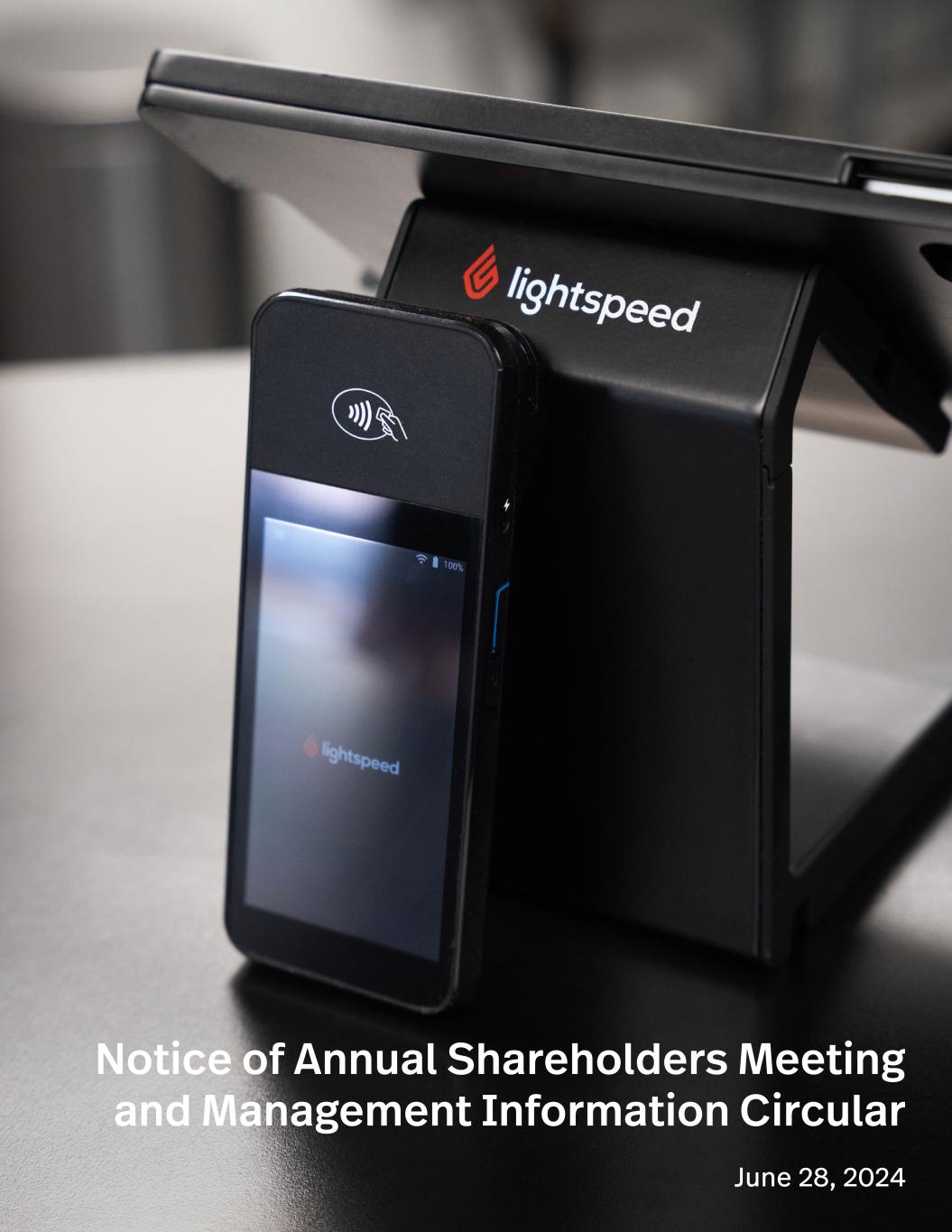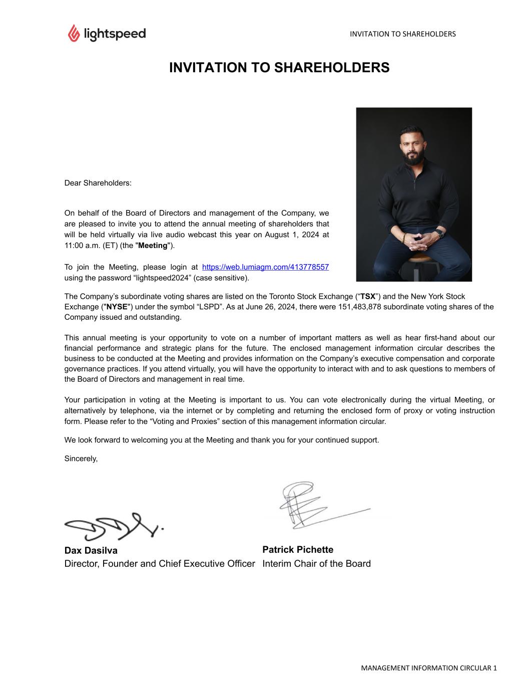 INVITATION TO SHAREHOLDERS Dear Shareholders: On behalf of the Board of Directors and management of the Company, we are pleased to invite you to attend the annual meeting of shareholders that will be held virtually via live audio webcast this year on August 1, 2024 at 11:00 a.m. (ET) (the "Meeting"). To join the Meeting, please login at https://web.lumiagm.com/413778557 using the password “lightspeed2024” (case sensitive). The Company’s subordinate voting shares are listed on the Toronto Stock Exchange (“TSX”) and the New York Stock Exchange ("NYSE") under the symbol “LSPD”. As at June 26, 2024, there were 151,483,878 subordinate voting shares of the Company issued and outstanding. This annual meeting is your opportunity to vote on a number of important matters as well as hear first-hand about our financial performance and strategic plans for the future. The enclosed management information circular describes the business to be conducted at the Meeting and provides information on the Company’s executive compensation and corporate governance practices. If you attend virtually, you will have the opportunity to interact with and to ask questions to members of the Board of Directors and management in real time. Your participation in voting at the Meeting is important to us. You can vote electronically during the virtual Meeting, or alternatively by telephone, via the internet or by completing and returning the enclosed form of proxy or voting instruction form. Please refer to the “Voting and Proxies” section of this management information circular. We look forward to welcoming you at the Meeting and thank you for your continued support. Sincerely, Dax Dasilva Director, Founder and Chief Executive Officer Patrick Pichette Interim Chair of the Board INVITATION TO SHAREHOLDERS MANAGEMENT INFORMATION CIRCULAR 1