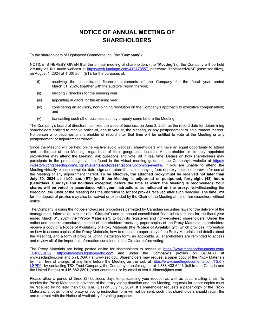 NOTICE OF ANNUAL MEETING OF SHAREHOLDERS To the shareholders of Lightspeed Commerce Inc. (the “Company”): NOTICE IS HEREBY GIVEN that the annual meeting of shareholders (the “Meeting”) of the Company will be held virtually via live audio webcast at https://web.lumiagm.com/413778557, password “lightspeed2024” (case sensitive), on August 1, 2024 at 11:00 a.m. (ET), for the purposes of: (i) receiving the consolidated financial statements of the Company for the fiscal year ended March 31, 2024, together with the auditors’ report thereon; (ii) electing 7 directors for the ensuing year; (iii) appointing auditors for the ensuing year; (iv) considering an advisory, non-binding resolution on the Company's approach to executive compensation; and (v) transacting such other business as may properly come before the Meeting. The Company’s board of directors has fixed the close of business on June 3, 2024 as the record date for determining shareholders entitled to receive notice of, and to vote at, the Meeting, or any postponement or adjournment thereof. No person who becomes a shareholder of record after that time will be entitled to vote at the Meeting or any postponement or adjournment thereof. Since the Meeting will be held online via live audio webcast, shareholders will have an equal opportunity to attend and participate at the Meeting, regardless of their geographic location. A shareholder or its duly appointed proxyholder may attend the Meeting, ask questions and vote, all in real time. Details on how shareholders may participate in the proceedings can be found in the virtual meeting guide on the Company's website at https:// investors.lightspeedhq.com/English/events-and-presentations/upcoming-events/. If you are unable to attend the Meeting virtually, please complete, date, sign and return the accompanying form of proxy enclosed herewith for use at the Meeting or any adjournment thereof. To be effective, the attached proxy must be received not later than July 30, 2024 at 11:00 a.m. (ET) (or, if the Meeting is adjourned or postponed, forty-eight (48) hours (Saturdays, Sundays and holidays excepted) before the time at which the Meeting is reconvened). Your shares will be voted in accordance with your instructions as indicated on the proxy. Notwithstanding the foregoing, the Chair of the Meeting has the discretion to accept proxies received after such deadline. The time limit for the deposit of proxies may also be waived or extended by the Chair of the Meeting at his or her discretion, without notice. The Company is using the notice-and-access procedures permitted by Canadian securities laws for the delivery of the management information circular (the "Circular") and its annual consolidated financial statements for the fiscal year ended March 31, 2024 (the “Proxy Materials”), to both its registered and non-registered shareholders. Under the notice-and-access procedures, instead of shareholders receiving paper copies of the Proxy Materials, shareholders receive a copy of a Notice of Availability of Proxy Materials (the “Notice of Availability”) (which provides information on how to access copies of the Proxy Materials, how to request a paper copy of the Proxy Materials and details about the Meeting), and a form of proxy or voting instruction form, as applicable. All shareholders are reminded to access and review all of the important information contained in the Circular before voting. The Proxy Materials are being posted online for shareholders to access at https://www.meetingdocuments.com/ TSXT/LSPD/, https://investors.lightspeedhq.com and under the Company's profiles on SEDAR+ at www.sedarplus.com and on EDGAR at www.sec.gov. Shareholders may request a paper copy of the Proxy Materials by mail, free of charge, at any time before the Meeting on the web at https://www.meetingdocuments.com/TSXT/ LSPD/, by contacting TSX Trust Company, the Company' transfer agent, at 1-888-433-6443 (toll free in Canada and the United States) or 416-682-3801 (other countries), or by email at tsxt-fulfilment@tmx.com. Please allow a period of three (3) business days for processing your request as well as usual mailing times. To receive the Proxy Materials in advance of the proxy voting deadline and the Meeting, requests for paper copies must be received by no later than 5:00 p.m. (ET) on July 17, 2024. If a shareholder requests a paper copy of the Proxy Materials, another form of proxy or voting instruction form will not be sent, such that shareholders should retain the one received with the Notice of Availability for voting purposes.