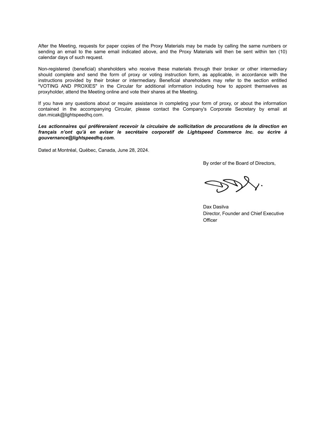 After the Meeting, requests for paper copies of the Proxy Materials may be made by calling the same numbers or sending an email to the same email indicated above, and the Proxy Materials will then be sent within ten (10) calendar days of such request. Non-registered (beneficial) shareholders who receive these materials through their broker or other intermediary should complete and send the form of proxy or voting instruction form, as applicable, in accordance with the instructions provided by their broker or intermediary. Beneficial shareholders may refer to the section entitled "VOTING AND PROXIES" in the Circular for additional information including how to appoint themselves as proxyholder, attend the Meeting online and vote their shares at the Meeting. If you have any questions about or require assistance in completing your form of proxy, or about the information contained in the accompanying Circular, please contact the Company's Corporate Secretary by email at dan.micak@lightspeedhq.com. Les actionnaires qui préféreraient recevoir la circulaire de sollicitation de procurations de la direction en français n’ont qu’à en aviser le secrétaire corporatif de Lightspeed Commerce Inc. ou écrire à gouvernance@lightspeedhq.com. Dated at Montréal, Québec, Canada, June 28, 2024. By order of the Board of Directors, Dax Dasilva Director, Founder and Chief Executive Officer