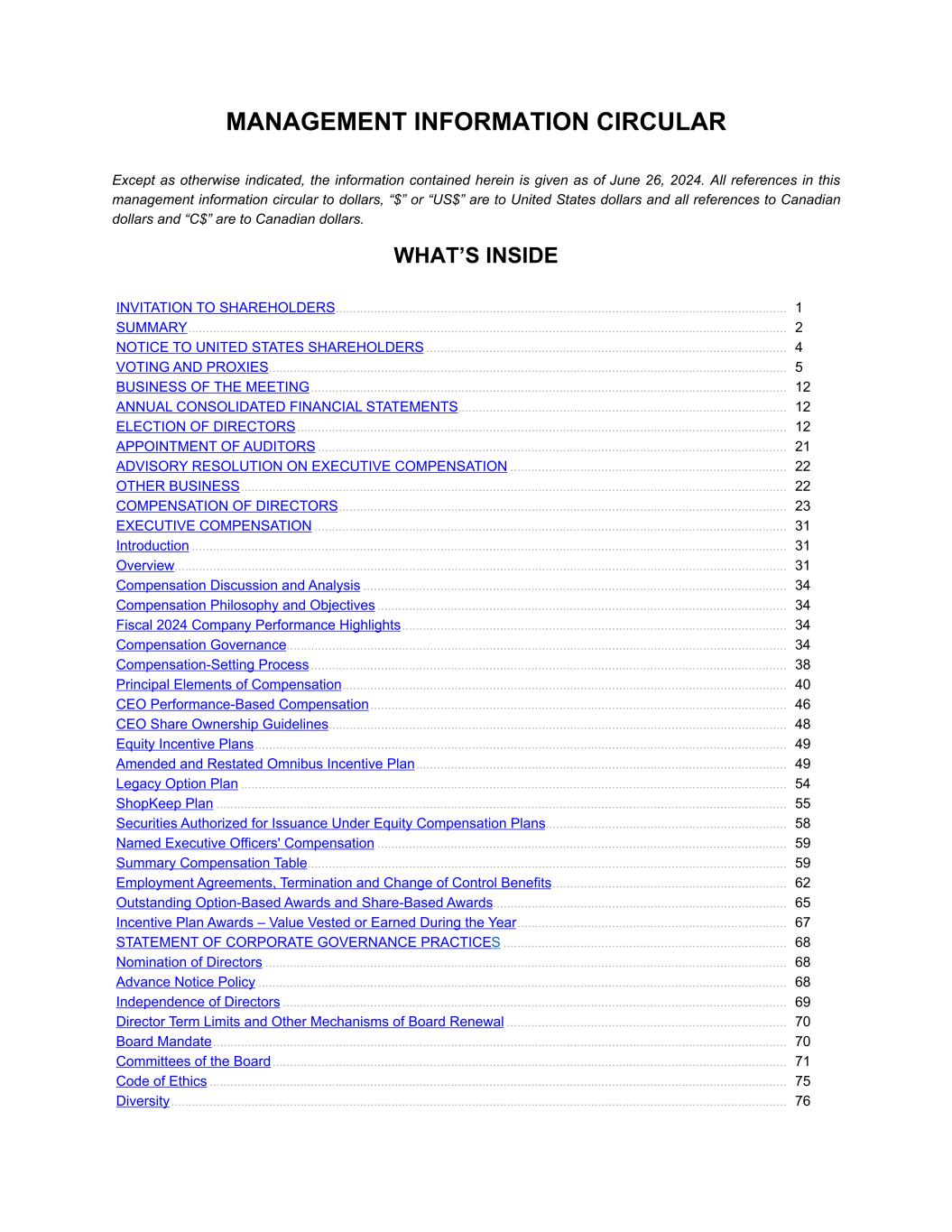 MANAGEMENT INFORMATION CIRCULAR Except as otherwise indicated, the information contained herein is given as of June 26, 2024. All references in this management information circular to dollars, “$” or “US$” are to United States dollars and all references to Canadian dollars and “C$” are to Canadian dollars. WHAT’S INSIDE INVITATION TO SHAREHOLDERS ................................................................................................................................. 1 SUMMARY ........................................................................................................................................................................... 2 NOTICE TO UNITED STATES SHAREHOLDERS ....................................................................................................... 4 VOTING AND PROXIES .................................................................................................................................................... 5 BUSINESS OF THE MEETING ........................................................................................................................................ 12 ANNUAL CONSOLIDATED FINANCIAL STATEMENTS .............................................................................................. 12 ELECTION OF DIRECTORS ............................................................................................................................................ 12 APPOINTMENT OF AUDITORS ...................................................................................................................................... 21 ADVISORY RESOLUTION ON EXECUTIVE COMPENSATION ............................................................................... 22 OTHER BUSINESS ............................................................................................................................................................ 22 COMPENSATION OF DIRECTORS ................................................................................................................................ 23 EXECUTIVE COMPENSATION ....................................................................................................................................... 31 Introduction .......................................................................................................................................................................... 31 Overview ............................................................................................................................................................................... 31 Compensation Discussion and Analysis ......................................................................................................................... 34 Compensation Philosophy and Objectives ..................................................................................................................... 34 Fiscal 2024 Company Performance Highlights .............................................................................................................. 34 Compensation Governance ............................................................................................................................................... 34 Compensation-Setting Process ........................................................................................................................................ 38 Principal Elements of Compensation ............................................................................................................................... 40 CEO Performance-Based Compensation ....................................................................................................................... 46 CEO Share Ownership Guidelines ................................................................................................................................... 48 Equity Incentive Plans ........................................................................................................................................................ 49 Amended and Restated Omnibus Incentive Plan .......................................................................................................... 49 Legacy Option Plan ............................................................................................................................................................ 54 ShopKeep Plan ................................................................................................................................................................... 55 Securities Authorized for Issuance Under Equity Compensation Plans ..................................................................... 58 Named Executive Officers' Compensation ..................................................................................................................... 59 Summary Compensation Table ......................................................................................................................................... 59 Employment Agreements, Termination and Change of Control Benefits ................................................................... 62 Outstanding Option-Based Awards and Share-Based Awards .................................................................................... 65 Incentive Plan Awards – Value Vested or Earned During the Year ............................................................................. 67 STATEMENT OF CORPORATE GOVERNANCE PRACTICES ................................................................................. 68 Nomination of Directors ..................................................................................................................................................... 68 Advance Notice Policy ....................................................................................................................................................... 68 I