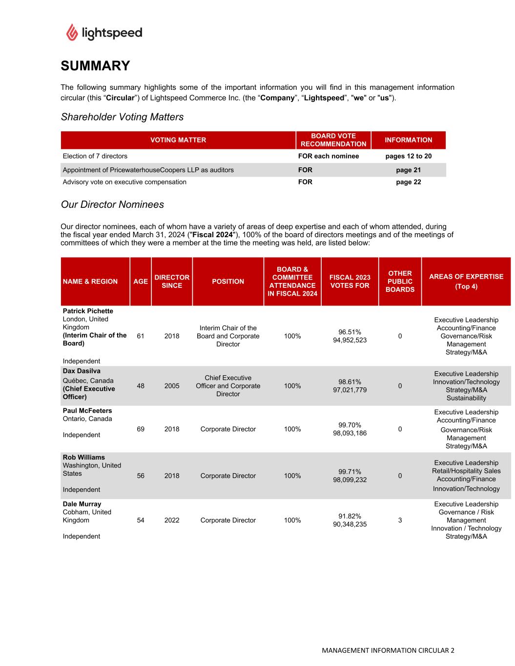 SUMMARY The following summary highlights some of the important information you will find in this management information circular (this “Circular”) of Lightspeed Commerce Inc. (the “Company”, “Lightspeed”, "we" or "us"). Shareholder Voting Matters VOTING MATTER BOARD VOTE RECOMMENDATION INFORMATION Election of 7 directors FOR each nominee pages 12 to 20 Appointment of PricewaterhouseCoopers LLP as auditors FOR page 21 Advisory vote on executive compensation FOR page 22 Our Director Nominees Our director nominees, each of whom have a variety of areas of deep expertise and each of whom attended, during the fiscal year ended March 31, 2024 ("Fiscal 2024"), 100% of the board of directors meetings and of the meetings of committees of which they were a member at the time the meeting was held, are listed below: NAME & REGION AGE DIRECTOR SINCE POSITION BOARD & COMMITTEE ATTENDANCE IN FISCAL 2024 FISCAL 2023 VOTES FOR OTHER PUBLIC BOARDS AREAS OF EXPERTISE (Top 4) Patrick Pichette London, United Kingdom (Interim Chair of the Board) Independent 61 2018 Interim Chair of the Board and Corporate Director 100% 96.51% 94,952,523 0 Executive Leadership Accounting/Finance Governance/Risk Management Strategy/M&A Dax Dasilva Québec, Canada (Chief Executive Officer) 48 2005 Chief Executive Officer and Corporate Director 100% 98.61% 97,021,779 0 Executive Leadership Innovation/Technology Strategy/M&A Sustainability Paul McFeeters Ontario, Canada Independent 69 2018 Corporate Director 100% 99.70% 98,093,186 0 Executive Leadership Accounting/Finance Governance/Risk Management Strategy/M&A Rob Williams Washington, United States Independent 56 2018 Corporate Director 100% 99.71% 98,099,232 0 Executive Leadership Retail/Hospitality Sales Accounting/Finance Innovation/Technology Dale Murray Cobham, United Kingdom Independent 54 2022 Corporate Director 100% 91.82% 90,348,235 3 Executive Leadership Governance / Risk Management Innovation / Technology Strategy/M&A MANAGEMENT INFORMATION CIRCULAR 2