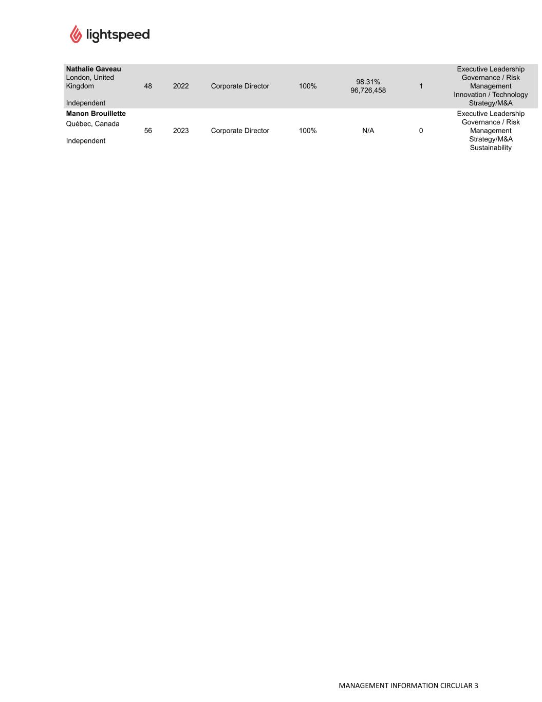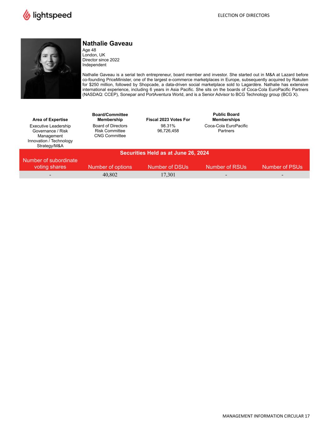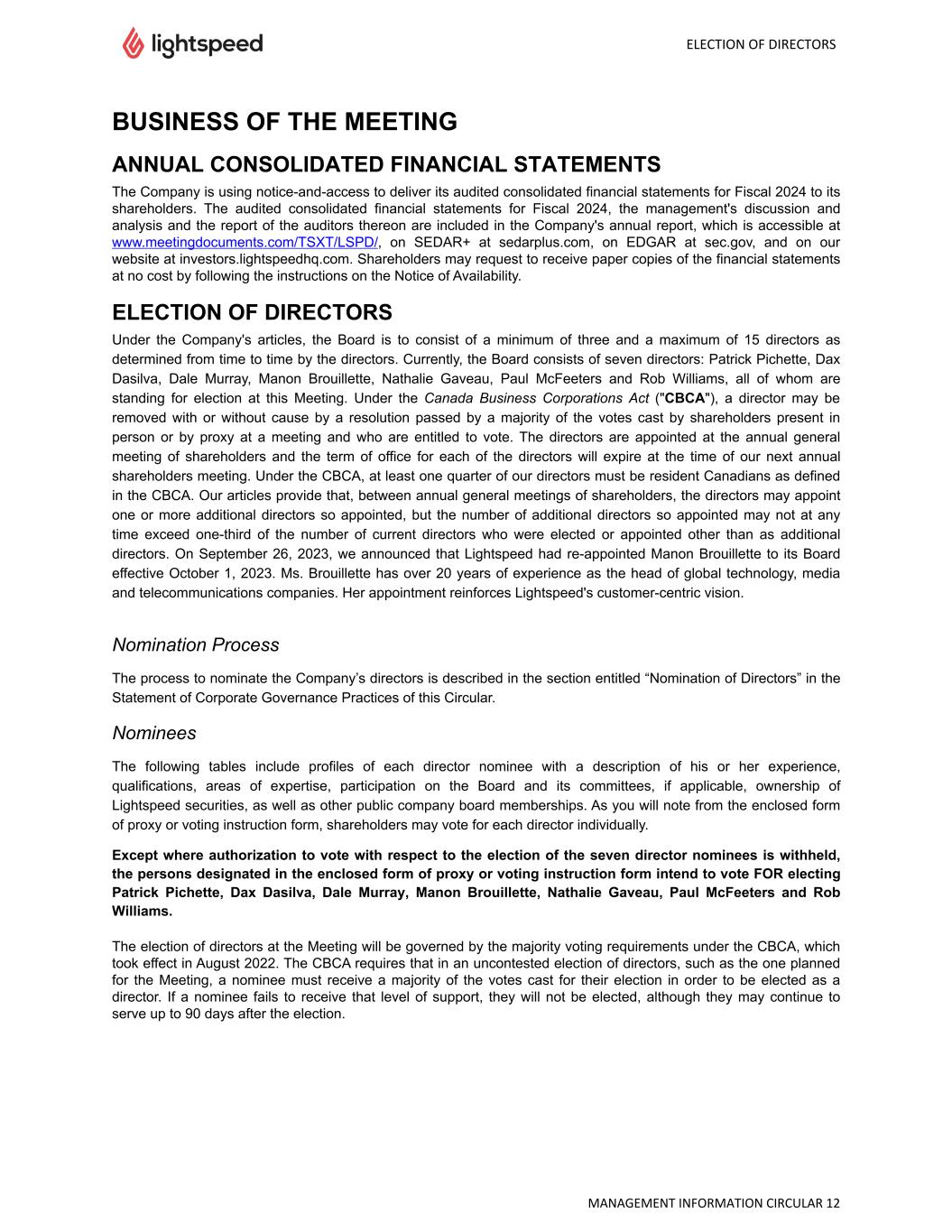 BUSINESS OF THE MEETING ANNUAL CONSOLIDATED FINANCIAL STATEMENTS The Company is using notice-and-access to deliver its audited consolidated financial statements for Fiscal 2024 to its shareholders. The audited consolidated financial statements for Fiscal 2024, the management's discussion and analysis and the report of the auditors thereon are included in the Company's annual report, which is accessible at www.meetingdocuments.com/TSXT/LSPD/, on SEDAR+ at sedarplus.com, on EDGAR at sec.gov, and on our website at investors.lightspeedhq.com. Shareholders may request to receive paper copies of the financial statements at no cost by following the instructions on the Notice of Availability. ELECTION OF DIRECTORS Under the Company's articles, the Board is to consist of a minimum of three and a maximum of 15 directors as determined from time to time by the directors. Currently, the Board consists of seven directors: Patrick Pichette, Dax Dasilva, Dale Murray, Manon Brouillette, Nathalie Gaveau, Paul McFeeters and Rob Williams, all of whom are standing for election at this Meeting. Under the Canada Business Corporations Act ("CBCA"), a director may be removed with or without cause by a resolution passed by a majority of the votes cast by shareholders present in person or by proxy at a meeting and who are entitled to vote. The directors are appointed at the annual general meeting of shareholders and the term of office for each of the directors will expire at the time of our next annual shareholders meeting. Under the CBCA, at least one quarter of our directors must be resident Canadians as defined in the CBCA. Our articles provide that, between annual general meetings of shareholders, the directors may appoint one or more additional directors so appointed, but the number of additional directors so appointed may not at any time exceed one-third of the number of current directors who were elected or appointed other than as additional directors. On September 26, 2023, we announced that Lightspeed had re-appointed Manon Brouillette to its Board effective October 1, 2023. Ms. Brouillette has over 20 years of experience as the head of global technology, media and telecommunications companies. Her appointment reinforces Lightspeed's customer-centric vision. Nomination Process The process to nominate the Company’s directors is described in the section entitled “Nomination of Directors” in the Statement of Corporate Governance Practices of this Circular. Nominees The following tables include profiles of each director nominee with a description of his or her experience, qualifications, areas of expertise, participation on the Board and its committees, if applicable, ownership of Lightspeed securities, as well as other public company board memberships. As you will note from the enclosed form of proxy or voting instruction form, shareholders may vote for each director individually. Except where authorization to vote with respect to the election of the seven director nominees is withheld, the persons designated in the enclosed form of proxy or voting instruction form intend to vote FOR electing Patrick Pichette, Dax Dasilva, Dale Murray, Manon Brouillette, Nathalie Gaveau, Paul McFeeters and Rob Williams. The election of directors at the Meeting will be governed by the majority voting requirements under the CBCA, which took effect in August 2022. The CBCA requires that in an uncontested election of directors, such as the one planned for the Meeting, a nominee must receive a majority of the votes cast for their election in order to be elected as a director. If a nominee fails to receive that level of support, they will not be elected, although they may continue to serve up to 90 days after the election. ELECTION OF DIRECTORS MANAGEMENT INFORMATION CIRCULAR 12
