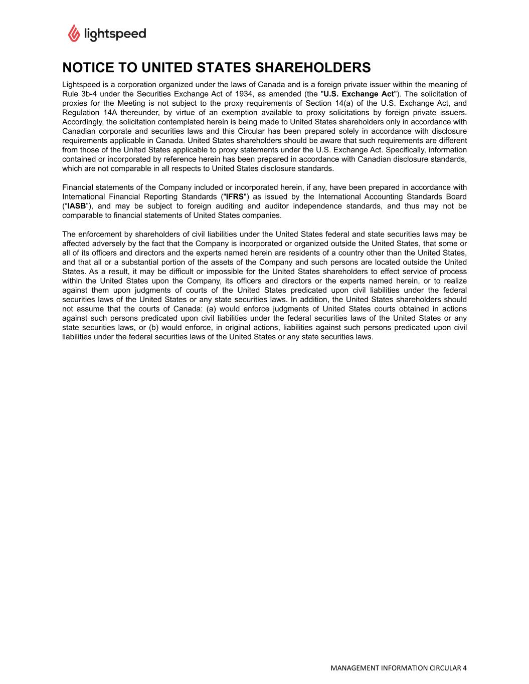 NOTICE TO UNITED STATES SHAREHOLDERS Lightspeed is a corporation organized under the laws of Canada and is a foreign private issuer within the meaning of Rule 3b-4 under the Securities Exchange Act of 1934, as amended (the "U.S. Exchange Act"). The solicitation of proxies for the Meeting is not subject to the proxy requirements of Section 14(a) of the U.S. Exchange Act, and Regulation 14A thereunder, by virtue of an exemption available to proxy solicitations by foreign private issuers. Accordingly, the solicitation contemplated herein is being made to United States shareholders only in accordance with Canadian corporate and securities laws and this Circular has been prepared solely in accordance with disclosure requirements applicable in Canada. United States shareholders should be aware that such requirements are different from those of the United States applicable to proxy statements under the U.S. Exchange Act. Specifically, information contained or incorporated by reference herein has been prepared in accordance with Canadian disclosure standards, which are not comparable in all respects to United States disclosure standards. Financial statements of the Company included or incorporated herein, if any, have been prepared in accordance with International Financial Reporting Standards ("IFRS") as issued by the International Accounting Standards Board (“IASB”), and may be subject to foreign auditing and auditor independence standards, and thus may not be comparable to financial statements of United States companies. The enforcement by shareholders of civil liabilities under the United States federal and state securities laws may be affected adversely by the fact that the Company is incorporated or organized outside the United States, that some or all of its officers and directors and the experts named herein are residents of a country other than the United States, and that all or a substantial portion of the assets of the Company and such persons are located outside the United States. As a result, it may be difficult or impossible for the United States shareholders to effect service of process within the United States upon the Company, its officers and directors or the experts named herein, or to realize against them upon judgments of courts of the United States predicated upon civil liabilities under the federal securities laws of the United States or any state securities laws. In addition, the United States shareholders should not assume that the courts of Canada: (a) would enforce judgments of United States courts obtained in actions against such persons predicated upon civil liabilities under the federal securities laws of the United States or any state securities laws, or (b) would enforce, in original actions, liabilities against such persons predicated upon civil liabilities under the federal securities laws of the United States or any state securities laws. MANAGEMENT INFORMATION CIRCULAR 4