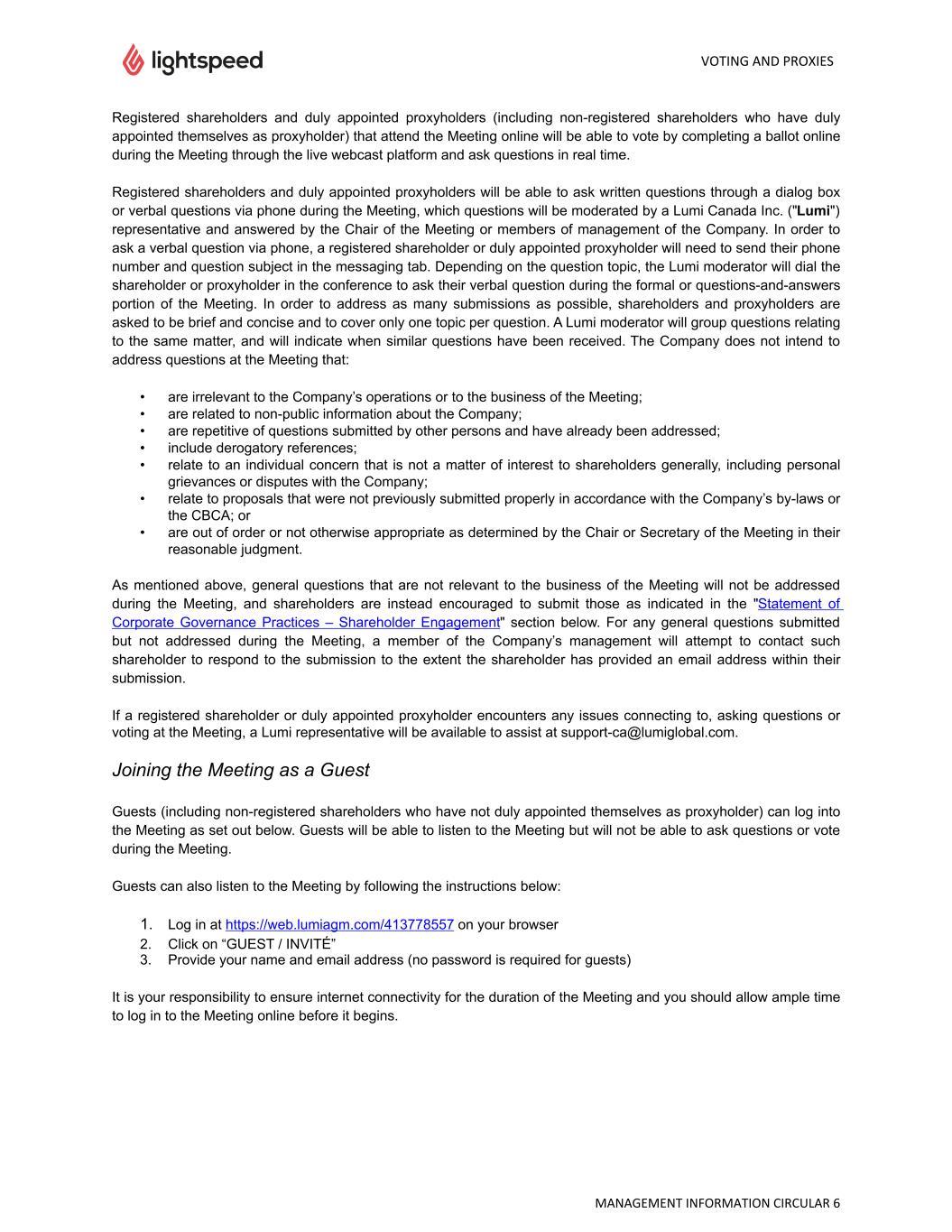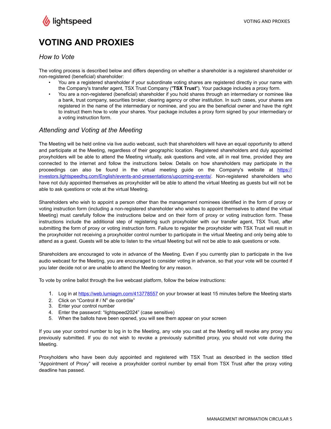 VOTING AND PROXIES How to Vote The voting process is described below and differs depending on whether a shareholder is a registered shareholder or non-registered (beneficial) shareholder: • You are a registered shareholder if your subordinate voting shares are registered directly in your name with the Company's transfer agent, TSX Trust Company ("TSX Trust"). Your package includes a proxy form. • You are a non-registered (beneficial) shareholder if you hold shares through an intermediary or nominee like a bank, trust company, securities broker, clearing agency or other institution. In such cases, your shares are registered in the name of the intermediary or nominee, and you are the beneficial owner and have the right to instruct them how to vote your shares. Your package includes a proxy form signed by your intermediary or a voting instruction form. Attending and Voting at the Meeting The Meeting will be held online via live audio webcast, such that shareholders will have an equal opportunity to attend and participate at the Meeting, regardless of their geographic location. Registered shareholders and duly appointed proxyholders will be able to attend the Meeting virtually, ask questions and vote, all in real time, provided they are connected to the internet and follow the instructions below. Details on how shareholders may participate in the proceedings can also be found in the virtual meeting guide on the Company's website at https:// investors.lightspeedhq.com/English/events-and-presentations/upcoming-events/. Non-registered shareholders who have not duly appointed themselves as proxyholder will be able to attend the virtual Meeting as guests but will not be able to ask questions or vote at the virtual Meeting. Shareholders who wish to appoint a person other than the management nominees identified in the form of proxy or voting instruction form (including a non-registered shareholder who wishes to appoint themselves to attend the virtual Meeting) must carefully follow the instructions below and on their form of proxy or voting instruction form. These instructions include the additional step of registering such proxyholder with our transfer agent, TSX Trust, after submitting the form of proxy or voting instruction form. Failure to register the proxyholder with TSX Trust will result in the proxyholder not receiving a proxyholder control number to participate in the virtual Meeting and only being able to attend as a guest. Guests will be able to listen to the virtual Meeting but will not be able to ask questions or vote. Shareholders are encouraged to vote in advance of the Meeting. Even if you currently plan to participate in the live audio webcast for the Meeting, you are encouraged to consider voting in advance, so that your vote will be counted if you later decide not or are unable to attend the Meeting for any reason. To vote by online ballot through the live webcast platform, follow the below instructions: 1. Log in at https://web.lumiagm.com/413778557 on your browser at least 15 minutes before the Meeting starts 2. Click on “Control # / No de contrôle” 3. Enter your control number 4. Enter the password: “lightspeed2024” (case sensitive) 5. When the ballots have been opened, you will see them appear on your screen If you use your control number to log in to the Meeting, any vote you cast at the Meeting will revoke any proxy you previously submitted. If you do not wish to revoke a previously submitted proxy, you should not vote during the Meeting. Proxyholders who have been duly appointed and registered with TSX Trust as described in the section titled “Appointment of Proxy” will receive a proxyholder control number by email from TSX Trust after the proxy voting deadline has passed. VOTING AND PROXIES MANAGEMENT INFORMATION CIRCULAR 5