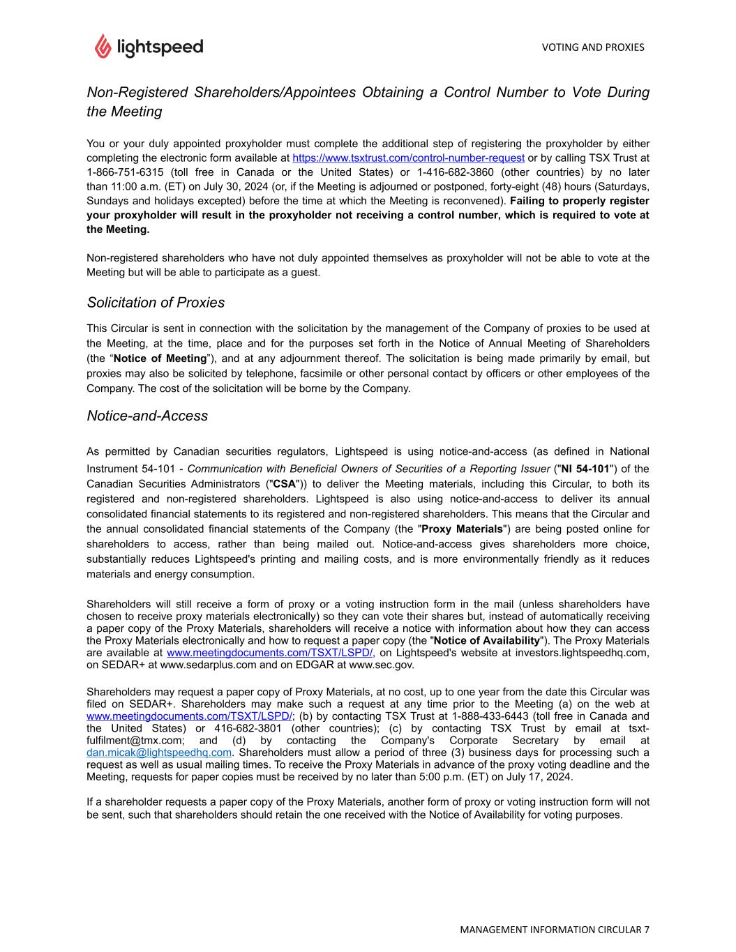 Non-Registered Shareholders/Appointees Obtaining a Control Number to Vote During the Meeting You or your duly appointed proxyholder must complete the additional step of registering the proxyholder by either completing the electronic form available at https://www.tsxtrust.com/control-number-request or by calling TSX Trust at 1-866-751-6315 (toll free in Canada or the United States) or 1-416-682-3860 (other countries) by no later than 11:00 a.m. (ET) on July 30, 2024 (or, if the Meeting is adjourned or postponed, forty-eight (48) hours (Saturdays, Sundays and holidays excepted) before the time at which the Meeting is reconvened). Failing to properly register your proxyholder will result in the proxyholder not receiving a control number, which is required to vote at the Meeting. Non-registered shareholders who have not duly appointed themselves as proxyholder will not be able to vote at the Meeting but will be able to participate as a guest. Solicitation of Proxies This Circular is sent in connection with the solicitation by the management of the Company of proxies to be used at the Meeting, at the time, place and for the purposes set forth in the Notice of Annual Meeting of Shareholders (the “Notice of Meeting”), and at any adjournment thereof. The solicitation is being made primarily by email, but proxies may also be solicited by telephone, facsimile or other personal contact by officers or other employees of the Company. The cost of the solicitation will be borne by the Company. Notice-and-Access As permitted by Canadian securities regulators, Lightspeed is using notice-and-access (as defined in National Instrument 54-101 - Communication with Beneficial Owners of Securities of a Reporting Issuer ("NI 54-101") of the Canadian Securities Administrators ("CSA")) to deliver the Meeting materials, including this Circular, to both its registered and non-registered shareholders. Lightspeed is also using notice-and-access to deliver its annual consolidated financial statements to its registered and non-registered shareholders. This means that the Circular and the annual consolidated financial statements of the Company (the "Proxy Materials") are being posted online for shareholders to access, rather than being mailed out. Notice-and-access gives shareholders more choice, substantially reduces Lightspeed's printing and mailing costs, and is more environmentally friendly as it reduces materials and energy consumption. Shareholders will still receive a form of proxy or a voting instruction form in the mail (unless shareholders have chosen to receive proxy materials electronically) so they can vote their shares but, instead of automatically receiving a paper copy of the Proxy Materials, shareholders will receive a notice with information about how they can access the Proxy Materials electronically and how to request a paper copy (the "Notice of Availability"). The Proxy Materials are available at www.meetingdocuments.com/TSXT/LSPD/, on Lightspeed's website at investors.lightspeedhq.com, on SEDAR+ at www.sedarplus.com and on EDGAR at www.sec.gov. Shareholders may request a paper copy of Proxy Materials, at no cost, up to one year from the date this Circular was filed on SEDAR+. Shareholders may make such a request at any time prior to the Meeting (a) on the web at www.meetingdocuments.com/TSXT/LSPD/; (b) by contacting TSX Trust at 1-888-433-6443 (toll free in Canada and the United States) or 416-682-3801 (other countries); (c) by contacting TSX Trust by email at tsxt- fulfilment@tmx.com; and (d) by contacting the Company's Corporate Secretary by email at dan.micak@lightspeedhq.com. Shareholders must allow a period of three (3) business days for processing such a request as well as usual mailing times. To receive the Proxy Materials in advance of the proxy voting deadline and the Meeting, requests for paper copies must be received by no later than 5:00 p.m. (ET) on July 17, 2024. If a shareholder requests a paper copy of the Proxy Materials, another form of proxy or voting instruction form will not be sent, such that shareholders should retain the one received with the Notice of Availability for voting purposes. VOTING AND PROXIES MANAGEMENT INFORMATION CIRCULAR 7