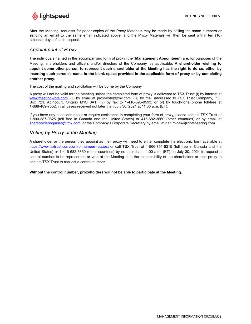 After the Meeting, requests for paper copies of the Proxy Materials may be made by calling the same numbers or sending an email to the same email indicated above, and the Proxy Materials will then be sent within ten (10) calendar days of such request. Appointment of Proxy The individuals named in the accompanying form of proxy (the "Management Appointees") are, for purposes of the Meeting, shareholders and officers and/or directors of the Company, as applicable. A shareholder wishing to appoint some other person to represent such shareholder at the Meeting has the right to do so, either by inserting such person's name in the blank space provided in the applicable form of proxy or by completing another proxy. The cost of the mailing and solicitation will be borne by the Company. A proxy will not be valid for the Meeting unless the completed form of proxy is delivered to TSX Trust: (i) by internet at www.meeting-vote.com; (ii) by email at proxyvote@tmx.com; (iii) by mail addressed to TSX Trust Company, P.O. Box 721, Agincourt, Ontario M1S 0A1; (iv) by fax to 1-416-595-9593; or (v) by touch-tone phone toll-free at 1-888-489-7352, in all cases received not later than July 30, 2024 at 11:00 a.m. (ET). If you have any questions about or require assistance in completing your form of proxy, please contact TSX Trust at 1-800-387-0825 (toll free in Canada and the United States) or 416-682-3860 (other countries) or by email at shareholderinquiries@tmx.com, or the Company's Corporate Secretary by email at dan.micak@lightspeedhq.com. Voting by Proxy at the Meeting A shareholder or the person they appoint as their proxy will need to either complete the electronic form available at https://www.tsxtrust.com/control-number-request or call TSX Trust at 1-866-751-6315 (toll free in Canada and the United States) or 1-416-682-3860 (other countries) by no later than 11:00 a.m. (ET) on July 30, 2024 to request a control number to be represented or vote at the Meeting. It is the responsibility of the shareholder or their proxy to contact TSX Trust to request a control number. Without the control number, proxyholders will not be able to participate at the Meeting. VOTING AND PROXIES MANAGEMENT INFORMATION CIRCULAR 8