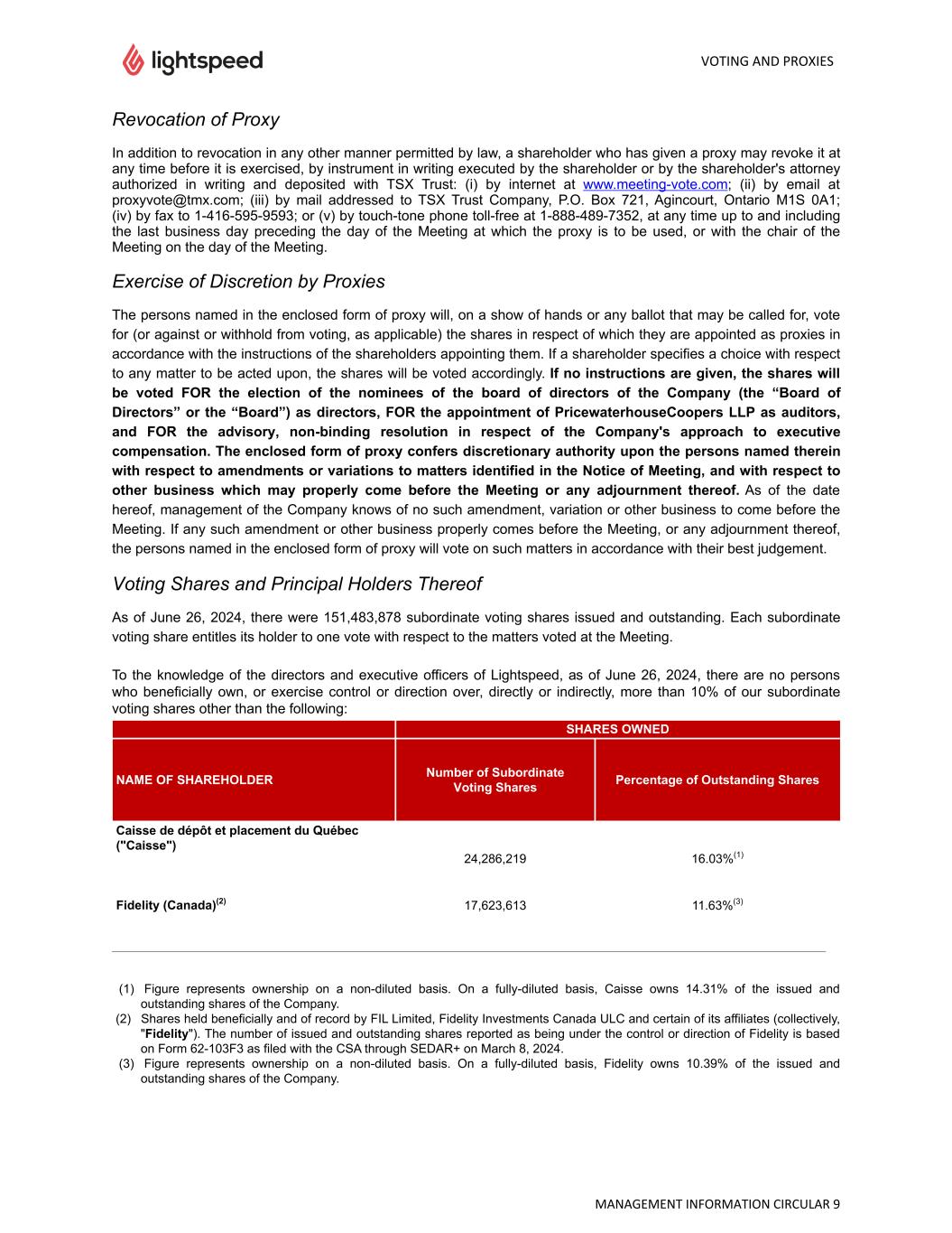 Revocation of Proxy In addition to revocation in any other manner permitted by law, a shareholder who has given a proxy may revoke it at any time before it is exercised, by instrument in writing executed by the shareholder or by the shareholder's attorney authorized in writing and deposited with TSX Trust: (i) by internet at www.meeting-vote.com; (ii) by email at proxyvote@tmx.com; (iii) by mail addressed to TSX Trust Company, P.O. Box 721, Agincourt, Ontario M1S 0A1; (iv) by fax to 1-416-595-9593; or (v) by touch-tone phone toll-free at 1-888-489-7352, at any time up to and including the last business day preceding the day of the Meeting at which the proxy is to be used, or with the chair of the Meeting on the day of the Meeting. Exercise of Discretion by Proxies The persons named in the enclosed form of proxy will, on a show of hands or any ballot that may be called for, vote for (or against or withhold from voting, as applicable) the shares in respect of which they are appointed as proxies in accordance with the instructions of the shareholders appointing them. If a shareholder specifies a choice with respect to any matter to be acted upon, the shares will be voted accordingly. If no instructions are given, the shares will be voted FOR the election of the nominees of the board of directors of the Company (the “Board of Directors” or the “Board”) as directors, FOR the appointment of PricewaterhouseCoopers LLP as auditors, and FOR the advisory, non-binding resolution in respect of the Company's approach to executive compensation. The enclosed form of proxy confers discretionary authority upon the persons named therein with respect to amendments or variations to matters identified in the Notice of Meeting, and with respect to other business which may properly come before the Meeting or any adjournment thereof. As of the date hereof, management of the Company knows of no such amendment, variation or other business to come before the Meeting. If any such amendment or other business properly comes before the Meeting, or any adjournment thereof, the persons named in the enclosed form of proxy will vote on such matters in accordance with their best judgement. Voting Shares and Principal Holders Thereof As of June 26, 2024, there were 151,483,878 subordinate voting shares issued and outstanding. Each subordinate voting share entitles its holder to one vote with respect to the matters voted at the Meeting. To the knowledge of the directors and executive officers of Lightspeed, as of June 26, 2024, there are no persons who beneficially own, or exercise control or direction over, directly or indirectly, more than 10% of our subordinate voting shares other than the following: SHARES OWNED NAME OF SHAREHOLDER Number of Subordinate Voting Shares Percentage of Outstanding Shares Caisse de dépôt et placement du Québec ("Caisse") 24,286,219 16.03%(1) Fidelity (Canada)(2) 17,623,613 11.63%(3) (1) Figure represents ownership on a non-diluted basis. On a fully-diluted basis, Caisse owns 14.31% of the issued and outstanding shares of the Company. (2) Shares held beneficially and of record by FIL Limited, Fidelity Investments Canada ULC and certain of its affiliates (collectively, "Fidelity"). The number of issued and outstanding shares reported as being under the control or direction of Fidelity is based on Form 62-103F3 as filed with the CSA through SEDAR+ on March 8, 2024. (3) Figure represents ownership on a non-diluted basis. On a fully-diluted basis, Fidelity owns 10.39% of the issued and outstanding shares of the Company. VOTING AND PROXIES MANAGEMENT INFORMATION CIRCULAR 9