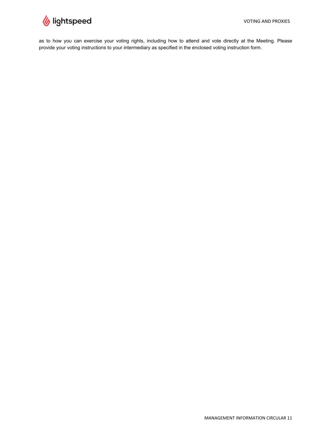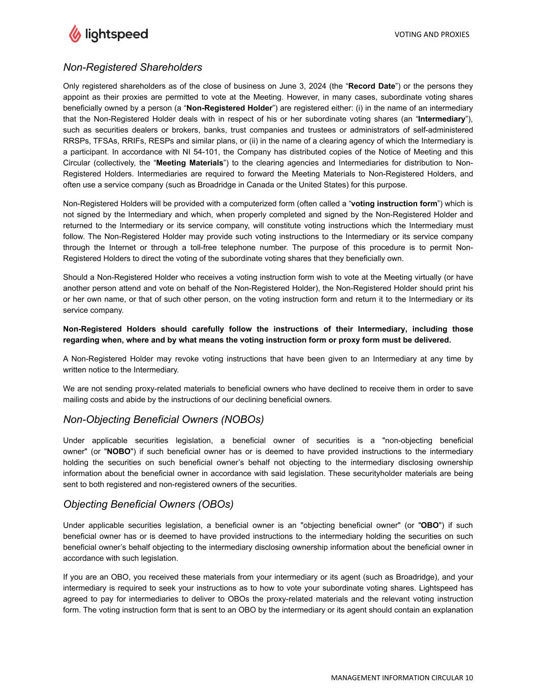 Non-Registered Shareholders Only registered shareholders as of the close of business on June 3, 2024 (the “Record Date”) or the persons they appoint as their proxies are permitted to vote at the Meeting. However, in many cases, subordinate voting shares beneficially owned by a person (a “Non-Registered Holder”) are registered either: (i) in the name of an intermediary that the Non-Registered Holder deals with in respect of his or her subordinate voting shares (an “Intermediary”), such as securities dealers or brokers, banks, trust companies and trustees or administrators of self-administered RRSPs, TFSAs, RRIFs, RESPs and similar plans, or (ii) in the name of a clearing agency of which the Intermediary is a participant. In accordance with NI 54-101, the Company has distributed copies of the Notice of Meeting and this Circular (collectively, the “Meeting Materials”) to the clearing agencies and Intermediaries for distribution to Non- Registered Holders. Intermediaries are required to forward the Meeting Materials to Non-Registered Holders, and often use a service company (such as Broadridge in Canada or the United States) for this purpose. Non-Registered Holders will be provided with a computerized form (often called a “voting instruction form”) which is not signed by the Intermediary and which, when properly completed and signed by the Non-Registered Holder and returned to the Intermediary or its service company, will constitute voting instructions which the Intermediary must follow. The Non-Registered Holder may provide such voting instructions to the Intermediary or its service company through the Internet or through a toll-free telephone number. The purpose of this procedure is to permit Non- Registered Holders to direct the voting of the subordinate voting shares that they beneficially own. Should a Non-Registered Holder who receives a voting instruction form wish to vote at the Meeting virtually (or have another person attend and vote on behalf of the Non-Registered Holder), the Non-Registered Holder should print his or her own name, or that of such other person, on the voting instruction form and return it to the Intermediary or its service company. Non-Registered Holders should carefully follow the instructions of their Intermediary, including those regarding when, where and by what means the voting instruction form or proxy form must be delivered. A Non-Registered Holder may revoke voting instructions that have been given to an Intermediary at any time by written notice to the Intermediary. We are not sending proxy-related materials to beneficial owners who have declined to receive them in order to save mailing costs and abide by the instructions of our declining beneficial owners. Non-Objecting Beneficial Owners (NOBOs) Under applicable securities legislation, a beneficial owner of securities is a "non-objecting beneficial owner" (or "NOBO") if such beneficial owner has or is deemed to have provided instructions to the intermediary holding the securities on such beneficial owner’s behalf not objecting to the intermediary disclosing ownership information about the beneficial owner in accordance with said legislation. These securityholder materials are being sent to both registered and non-registered owners of the securities. Objecting Beneficial Owners (OBOs) Under applicable securities legislation, a beneficial owner is an "objecting beneficial owner" (or "OBO") if such beneficial owner has or is deemed to have provided instructions to the intermediary holding the securities on such beneficial owner’s behalf objecting to the intermediary disclosing ownership information about the beneficial owner in accordance with such legislation. If you are an OBO, you received these materials from your intermediary or its agent (such as Broadridge), and your intermediary is required to seek your instructions as to how to vote your subordinate voting shares. Lightspeed has agreed to pay for intermediaries to deliver to OBOs the proxy-related materials and the relevant voting instruction form. The voting instruction form that is sent to an OBO by the intermediary or its agent should contain an explanation VOTING AND PROXIES MANAGEMENT INFORMATION CIRCULAR 10