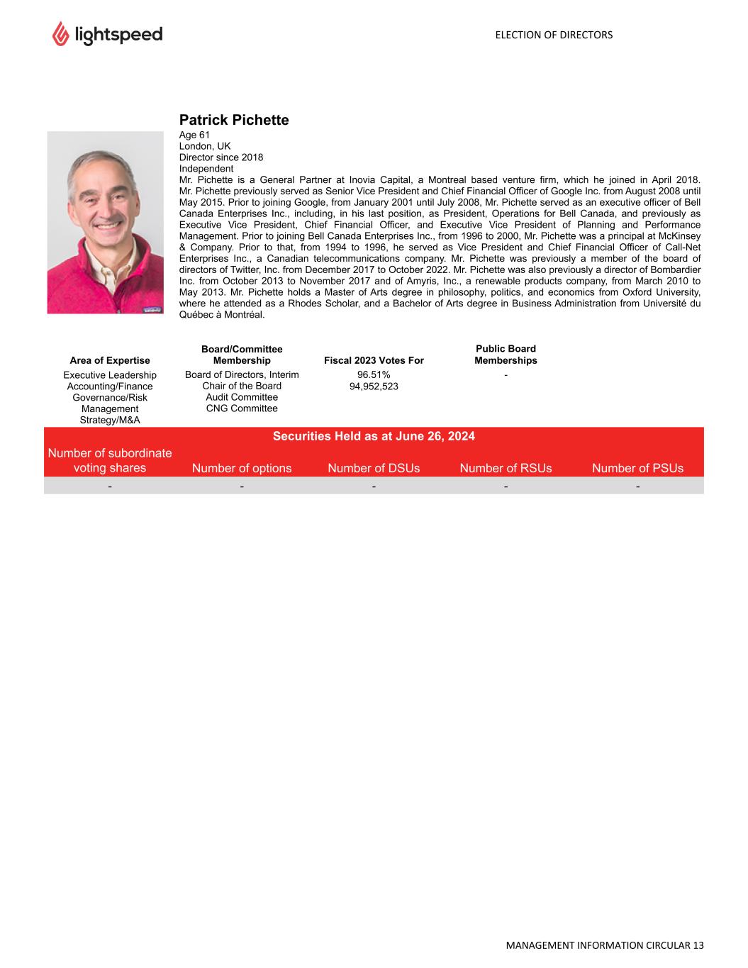 Patrick Pichette Age 61 London, UK Director since 2018 Independent Mr. Pichette is a General Partner at Inovia Capital, a Montreal based venture firm, which he joined in April 2018. Mr. Pichette previously served as Senior Vice President and Chief Financial Officer of Google Inc. from August 2008 until May 2015. Prior to joining Google, from January 2001 until July 2008, Mr. Pichette served as an executive officer of Bell Canada Enterprises Inc., including, in his last position, as President, Operations for Bell Canada, and previously as Executive Vice President, Chief Financial Officer, and Executive Vice President of Planning and Performance Management. Prior to joining Bell Canada Enterprises Inc., from 1996 to 2000, Mr. Pichette was a principal at McKinsey & Company. Prior to that, from 1994 to 1996, he served as Vice President and Chief Financial Officer of Call-Net Enterprises Inc., a Canadian telecommunications company. Mr. Pichette was previously a member of the board of directors of Twitter, Inc. from December 2017 to October 2022. Mr. Pichette was also previously a director of Bombardier Inc. from October 2013 to November 2017 and of Amyris, Inc., a renewable products company, from March 2010 to May 2013. Mr. Pichette holds a Master of Arts degree in philosophy, politics, and economics from Oxford University, where he attended as a Rhodes Scholar, and a Bachelor of Arts degree in Business Administration from Université du Québec à Montréal. Area of Expertise Board/Committee Membership Fiscal 2023 Votes For Public Board Memberships Executive Leadership Accounting/Finance Governance/Risk Management Strategy/M&A Board of Directors, Interim Chair of the Board Audit Committee CNG Committee 96.51% 94,952,523 - Securities Held as at June 26, 2024 Number of subordinate voting shares Number of options Number of DSUs Number of RSUs Number of PSUs - - - - - ELECTION OF DIRECTORS MANAGEMENT INFORMATION CIRCULAR 13