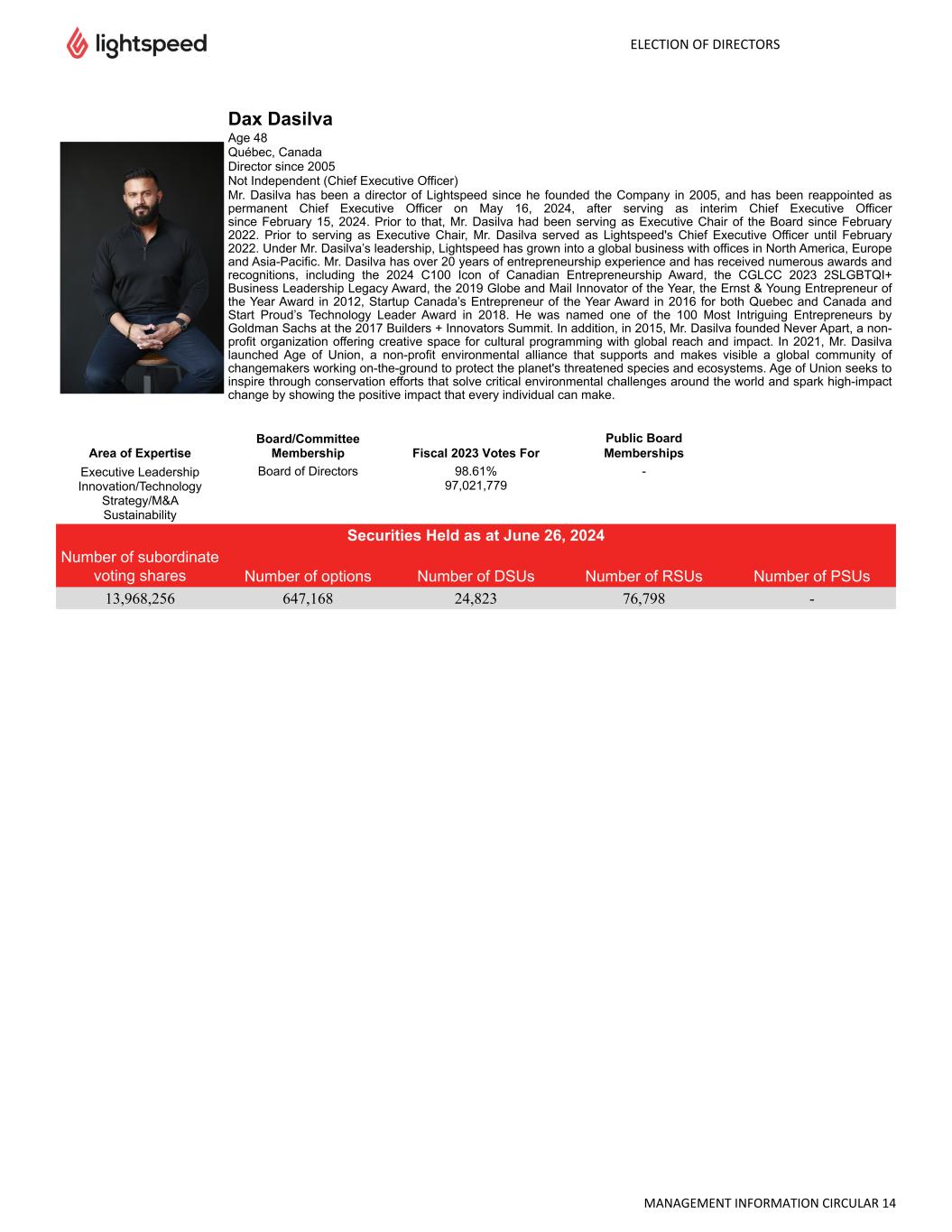 Dax Dasilva Age 48 Québec, Canada Director since 2005 Not Independent (Chief Executive Officer) Mr. Dasilva has been a director of Lightspeed since he founded the Company in 2005, and has been reappointed as permanent Chief Executive Officer on May 16, 2024, after serving as interim Chief Executive Officer since February 15, 2024. Prior to that, Mr. Dasilva had been serving as Executive Chair of the Board since February 2022. Prior to serving as Executive Chair, Mr. Dasilva served as Lightspeed's Chief Executive Officer until February 2022. Under Mr. Dasilva’s leadership, Lightspeed has grown into a global business with offices in North America, Europe and Asia-Pacific. Mr. Dasilva has over 20 years of entrepreneurship experience and has received numerous awards and recognitions, including the 2024 C100 Icon of Canadian Entrepreneurship Award, the CGLCC 2023 2SLGBTQI+ Business Leadership Legacy Award, the 2019 Globe and Mail Innovator of the Year, the Ernst & Young Entrepreneur of the Year Award in 2012, Startup Canada’s Entrepreneur of the Year Award in 2016 for both Quebec and Canada and Start Proud’s Technology Leader Award in 2018. He was named one of the 100 Most Intriguing Entrepreneurs by Goldman Sachs at the 2017 Builders + Innovators Summit. In addition, in 2015, Mr. Dasilva founded Never Apart, a non- profit organization offering creative space for cultural programming with global reach and impact. In 2021, Mr. Dasilva launched Age of Union, a non-profit environmental alliance that supports and makes visible a global community of changemakers working on-the-ground to protect the planet's threatened species and ecosystems. Age of Union seeks to inspire through conservation efforts that solve critical environmental challenges around the world and spark high-impact change by showing the positive impact that every individual can make. Area of Expertise Board/Committee Membership Fiscal 2023 Votes For Public Board Memberships Executive Leadership Innovation/Technology Strategy/M&A Sustainability Board of Directors 98.61% 97,021,779 - Securities Held as at June 26, 2024 Number of subordinate voting shares Number of options Number of DSUs Number of RSUs Number of PSUs 13,968,256 647,168 24,823 76,798 - ELECTION OF DIRECTORS MANAGEMENT INFORMATION CIRCULAR 14