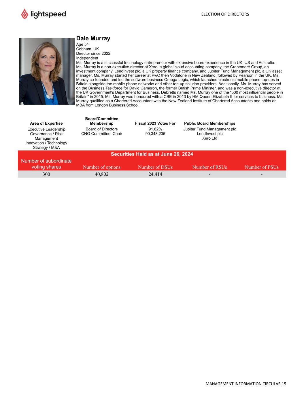 Dale Murray Age 54 Cobham, UK Director since 2022 Independent Ms. Murray is a successful technology entrepreneur with extensive board experience in the UK, US and Australia. Ms. Murray is a non-executive director at Xero, a global cloud accounting company, the Cranemere Group, an investment company, LendInvest plc, a UK property finance company, and Jupiter Fund Management plc, a UK asset manager. Ms. Murray started her career at PwC then Vodafone in New Zealand, followed by Pearson in the UK. Ms. Murray co-founded and led the software business Omega Logic, which launched electronic mobile phone top-ups in Britain alongside the mobile phone networks and other top-up solution providers. Additionally, Ms. Murray has served on the Business Taskforce for David Cameron, the former British Prime Minister, and was a non-executive director at the UK Government's Department for Business. Debretts named Ms. Murray one of the "500 most influential people in Britain" in 2015. Ms. Murray was honoured with a CBE in 2013 by HM Queen Elizabeth II for services to business. Ms. Murray qualified as a Chartered Accountant with the New Zealand Institute of Chartered Accountants and holds an MBA from London Business School. Area of Expertise Board/Committee Membership Fiscal 2023 Votes For Public Board Memberships Executive Leadership Governance / Risk Management Innovation / Technology Strategy / M&A Board of Directors CNG Committee, Chair 91.82% 90,348,235 Jupiter Fund Management plc LendInvest plc Xero Ltd Securities Held as at June 26, 2024 Number of subordinate voting shares Number of options Number of DSUs Number of RSUs Number of PSUs 300 40,802 24,414 - - ELECTION OF DIRECTORS MANAGEMENT INFORMATION CIRCULAR 15