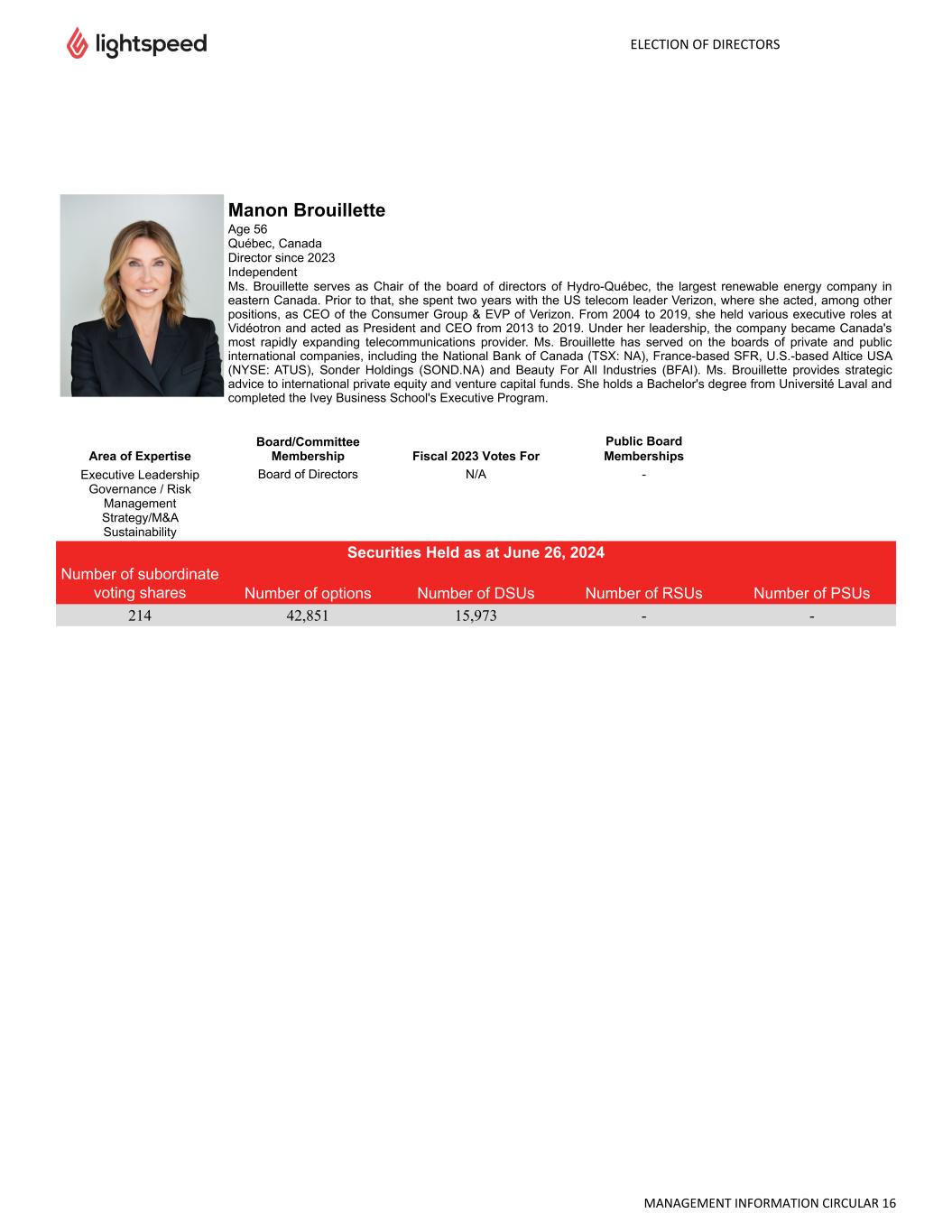 Manon Brouillette Age 56 Québec, Canada Director since 2023 Independent Ms. Brouillette serves as Chair of the board of directors of Hydro-Québec, the largest renewable energy company in eastern Canada. Prior to that, she spent two years with the US telecom leader Verizon, where she acted, among other positions, as CEO of the Consumer Group & EVP of Verizon. From 2004 to 2019, she held various executive roles at Vidéotron and acted as President and CEO from 2013 to 2019. Under her leadership, the company became Canada's most rapidly expanding telecommunications provider. Ms. Brouillette has served on the boards of private and public international companies, including the National Bank of Canada (TSX: NA), France-based SFR, U.S.-based Altice USA (NYSE: ATUS), Sonder Holdings (SOND.NA) and Beauty For All Industries (BFAI). Ms. Brouillette provides strategic advice to international private equity and venture capital funds. She holds a Bachelor's degree from Université Laval and completed the Ivey Business School's Executive Program. Area of Expertise Board/Committee Membership Fiscal 2023 Votes For Public Board Memberships Executive Leadership Governance / Risk Management Strategy/M&A Sustainability Board of Directors N/A - Securities Held as at June 26, 2024 Number of subordinate voting shares Number of options Number of DSUs Number of RSUs Number of PSUs 214 42,851 15,973 - - ELECTION OF DIRECTORS MANAGEMENT INFORMATION CIRCULAR 16