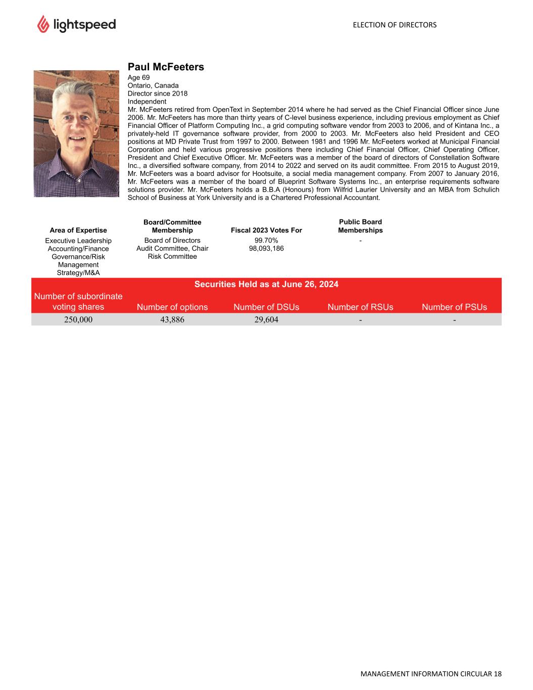 Paul McFeeters Age 69 Ontario, Canada Director since 2018 Independent Mr. McFeeters retired from OpenText in September 2014 where he had served as the Chief Financial Officer since June 2006. Mr. McFeeters has more than thirty years of C-level business experience, including previous employment as Chief Financial Officer of Platform Computing Inc., a grid computing software vendor from 2003 to 2006, and of Kintana Inc., a privately-held IT governance software provider, from 2000 to 2003. Mr. McFeeters also held President and CEO positions at MD Private Trust from 1997 to 2000. Between 1981 and 1996 Mr. McFeeters worked at Municipal Financial Corporation and held various progressive positions there including Chief Financial Officer, Chief Operating Officer, President and Chief Executive Officer. Mr. McFeeters was a member of the board of directors of Constellation Software Inc., a diversified software company, from 2014 to 2022 and served on its audit committee. From 2015 to August 2019, Mr. McFeeters was a board advisor for Hootsuite, a social media management company. From 2007 to January 2016, Mr. McFeeters was a member of the board of Blueprint Software Systems Inc., an enterprise requirements software solutions provider. Mr. McFeeters holds a B.B.A (Honours) from Wilfrid Laurier University and an MBA from Schulich School of Business at York University and is a Chartered Professional Accountant. Area of Expertise Board/Committee Membership Fiscal 2023 Votes For Public Board Memberships Executive Leadership Accounting/Finance Governance/Risk Management Strategy/M&A Board of Directors Audit Committee, Chair Risk Committee 99.70% 98,093,186 - Securities Held as at June 26, 2024 Number of subordinate voting shares Number of options Number of DSUs Number of RSUs Number of PSUs 250,000 43,886 29,604 - - ELECTION OF DIRECTORS MANAGEMENT INFORMATION CIRCULAR 18