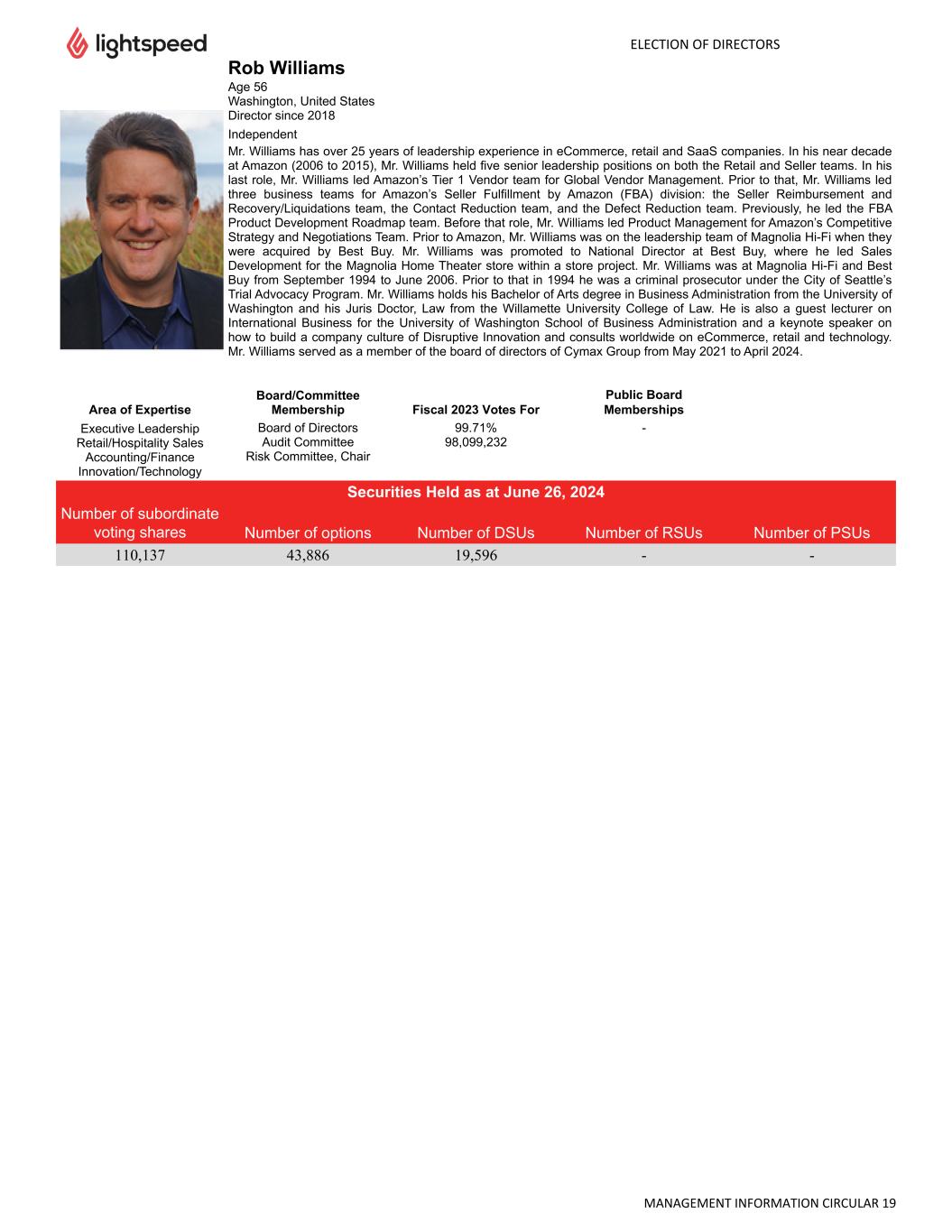 Rob Williams Age 56 Washington, United States Director since 2018 Independent Mr. Williams has over 25 years of leadership experience in eCommerce, retail and SaaS companies. In his near decade at Amazon (2006 to 2015), Mr. Williams held five senior leadership positions on both the Retail and Seller teams. In his last role, Mr. Williams led Amazon’s Tier 1 Vendor team for Global Vendor Management. Prior to that, Mr. Williams led three business teams for Amazon’s Seller Fulfillment by Amazon (FBA) division: the Seller Reimbursement and Recovery/Liquidations team, the Contact Reduction team, and the Defect Reduction team. Previously, he led the FBA Product Development Roadmap team. Before that role, Mr. Williams led Product Management for Amazon’s Competitive Strategy and Negotiations Team. Prior to Amazon, Mr. Williams was on the leadership team of Magnolia Hi-Fi when they were acquired by Best Buy. Mr. Williams was promoted to National Director at Best Buy, where he led Sales Development for the Magnolia Home Theater store within a store project. Mr. Williams was at Magnolia Hi-Fi and Best Buy from September 1994 to June 2006. Prior to that in 1994 he was a criminal prosecutor under the City of Seattle’s Trial Advocacy Program. Mr. Williams holds his Bachelor of Arts degree in Business Administration from the University of Washington and his Juris Doctor, Law from the Willamette University College of Law. He is also a guest lecturer on International Business for the University of Washington School of Business Administration and a keynote speaker on how to build a company culture of Disruptive Innovation and consults worldwide on eCommerce, retail and technology. Mr. Williams served as a member of the board of directors of Cymax Group from May 2021 to April 2024. Area of Expertise Board/Committee Membership Fiscal 2023 Votes For Public Board Memberships Executive Leadership Retail/Hospitality Sales Accounting/Finance Innovation/Technology Board of Directors Audit Committee Risk Committee, Chair 99.71% 98,099,232 - Securities Held as at June 26, 2024 Number of subordinate voting shares Number of options Number of DSUs Number of RSUs Number of PSUs 110,137 43,886 19,596 - - ELECTION OF DIRECTORS MANAGEMENT INFORMATION CIRCULAR 19