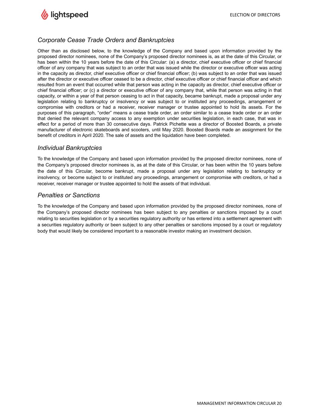 Corporate Cease Trade Orders and Bankruptcies Other than as disclosed below, to the knowledge of the Company and based upon information provided by the proposed director nominees, none of the Company’s proposed director nominees is, as at the date of this Circular, or has been within the 10 years before the date of this Circular: (a) a director, chief executive officer or chief financial officer of any company that was subject to an order that was issued while the director or executive officer was acting in the capacity as director, chief executive officer or chief financial officer; (b) was subject to an order that was issued after the director or executive officer ceased to be a director, chief executive officer or chief financial officer and which resulted from an event that occurred while that person was acting in the capacity as director, chief executive officer or chief financial officer; or (c) a director or executive officer of any company that, while that person was acting in that capacity, or within a year of that person ceasing to act in that capacity, became bankrupt, made a proposal under any legislation relating to bankruptcy or insolvency or was subject to or instituted any proceedings, arrangement or compromise with creditors or had a receiver, receiver manager or trustee appointed to hold its assets. For the purposes of this paragraph, “order” means a cease trade order, an order similar to a cease trade order or an order that denied the relevant company access to any exemption under securities legislation, in each case, that was in effect for a period of more than 30 consecutive days. Patrick Pichette was a director of Boosted Boards, a private manufacturer of electronic skateboards and scooters, until May 2020. Boosted Boards made an assignment for the benefit of creditors in April 2020. The sale of assets and the liquidation have been completed. Individual Bankruptcies To the knowledge of the Company and based upon information provided by the proposed director nominees, none of the Company’s proposed director nominees is, as at the date of this Circular, or has been within the 10 years before the date of this Circular, become bankrupt, made a proposal under any legislation relating to bankruptcy or insolvency, or become subject to or instituted any proceedings, arrangement or compromise with creditors, or had a receiver, receiver manager or trustee appointed to hold the assets of that individual. Penalties or Sanctions To the knowledge of the Company and based upon information provided by the proposed director nominees, none of the Company’s proposed director nominees has been subject to any penalties or sanctions imposed by a court relating to securities legislation or by a securities regulatory authority or has entered into a settlement agreement with a securities regulatory authority or been subject to any other penalties or sanctions imposed by a court or regulatory body that would likely be considered important to a reasonable investor making an investment decision. ELECTION OF DIRECTORS MANAGEMENT INFORMATION CIRCULAR 20