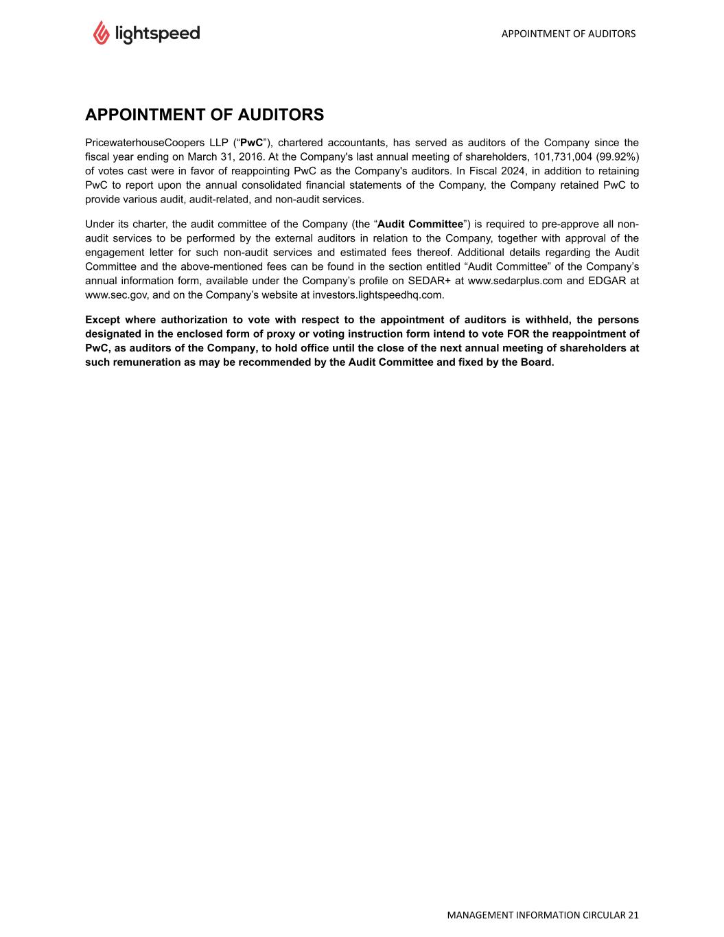 APPOINTMENT OF AUDITORS PricewaterhouseCoopers LLP (“PwC”), chartered accountants, has served as auditors of the Company since the fiscal year ending on March 31, 2016. At the Company's last annual meeting of shareholders, 101,731,004 (99.92%) of votes cast were in favor of reappointing PwC as the Company's auditors. In Fiscal 2024, in addition to retaining PwC to report upon the annual consolidated financial statements of the Company, the Company retained PwC to provide various audit, audit-related, and non-audit services. Under its charter, the audit committee of the Company (the “Audit Committee”) is required to pre-approve all non- audit services to be performed by the external auditors in relation to the Company, together with approval of the engagement letter for such non-audit services and estimated fees thereof. Additional details regarding the Audit Committee and the above-mentioned fees can be found in the section entitled “Audit Committee” of the Company’s annual information form, available under the Company’s profile on SEDAR+ at www.sedarplus.com and EDGAR at www.sec.gov, and on the Company’s website at investors.lightspeedhq.com. Except where authorization to vote with respect to the appointment of auditors is withheld, the persons designated in the enclosed form of proxy or voting instruction form intend to vote FOR the reappointment of PwC, as auditors of the Company, to hold office until the close of the next annual meeting of shareholders at such remuneration as may be recommended by the Audit Committee and fixed by the Board. APPOINTMENT OF AUDITORS MANAGEMENT INFORMATION CIRCULAR 21