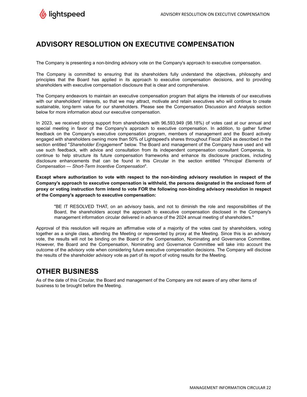 ADVISORY RESOLUTION ON EXECUTIVE COMPENSATION The Company is presenting a non-binding advisory vote on the Company's approach to executive compensation. The Company is committed to ensuring that its shareholders fully understand the objectives, philosophy and principles that the Board has applied in its approach to executive compensation decisions, and to providing shareholders with executive compensation disclosure that is clear and comprehensive. The Company endeavors to maintain an executive compensation program that aligns the interests of our executives with our shareholders' interests, so that we may attract, motivate and retain executives who will continue to create sustainable, long-term value for our shareholders. Please see the Compensation Discussion and Analysis section below for more information about our executive compensation. In 2023, we received strong support from shareholders with 96,593,949 (98.18%) of votes cast at our annual and special meeting in favor of the Company's approach to executive compensation. In addition, to gather further feedback on the Company's executive compensation program, members of management and the Board actively engaged with shareholders owning more than 50% of Lightspeed's shares throughout Fiscal 2024 as described in the section entitled "Shareholder Engagement" below. The Board and management of the Company have used and will use such feedback, with advice and consultation from its independent compensation consultant Compensia, to continue to help structure its future compensation frameworks and enhance its disclosure practices, including disclosure enhancements that can be found in this Circular in the section entitled "Principal Elements of Compensation — Short-Term Incentive Compensation". Except where authorization to vote with respect to the non-binding advisory resolution in respect of the Company's approach to executive compensation is withheld, the persons designated in the enclosed form of proxy or voting instruction form intend to vote FOR the following non-binding advisory resolution in respect of the Company's approach to executive compensation: "BE IT RESOLVED THAT, on an advisory basis, and not to diminish the role and responsibilities of the Board, the shareholders accept the approach to executive compensation disclosed in the Company's management information circular delivered in advance of the 2024 annual meeting of shareholders." Approval of this resolution will require an affirmative vote of a majority of the votes cast by shareholders, voting together as a single class, attending the Meeting or represented by proxy at the Meeting. Since this is an advisory vote, the results will not be binding on the Board or the Compensation, Nominating and Governance Committee. However, the Board and the Compensation, Nominating and Governance Committee will take into account the outcome of the advisory vote when considering future executive compensation decisions. The Company will disclose the results of the shareholder advisory vote as part of its report of voting results for the Meeting. OTHER BUSINESS As of the date of this Circular, the Board and management of the Company are not aware of any other items of business to be brought before the Meeting. ADVISORY RESOLUTION ON EXECUTIVE COMPENSATION MANAGEMENT INFORMATION CIRCULAR 22