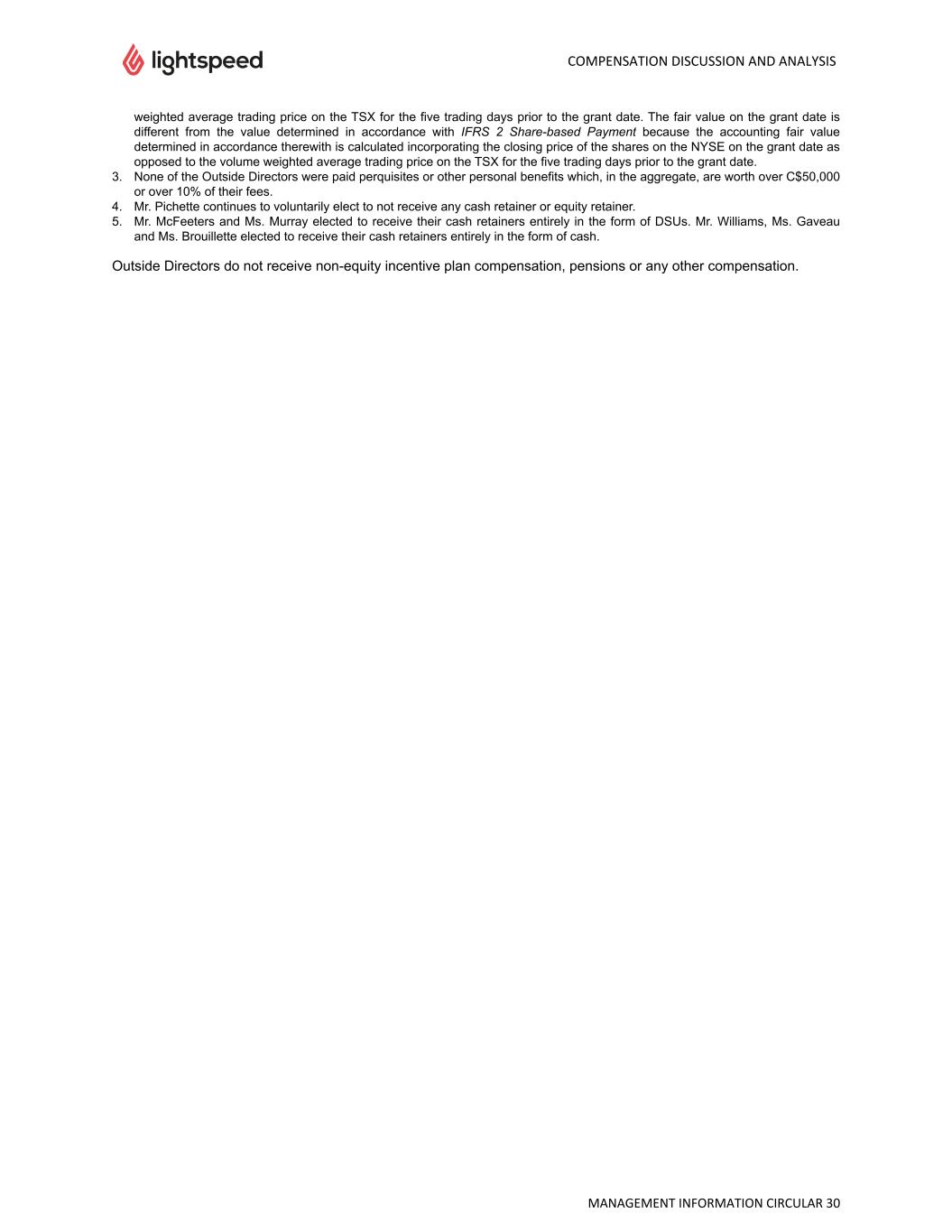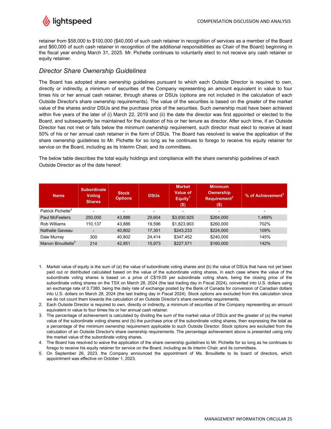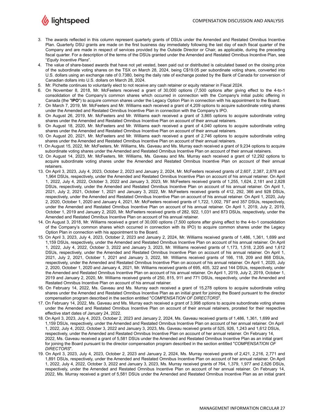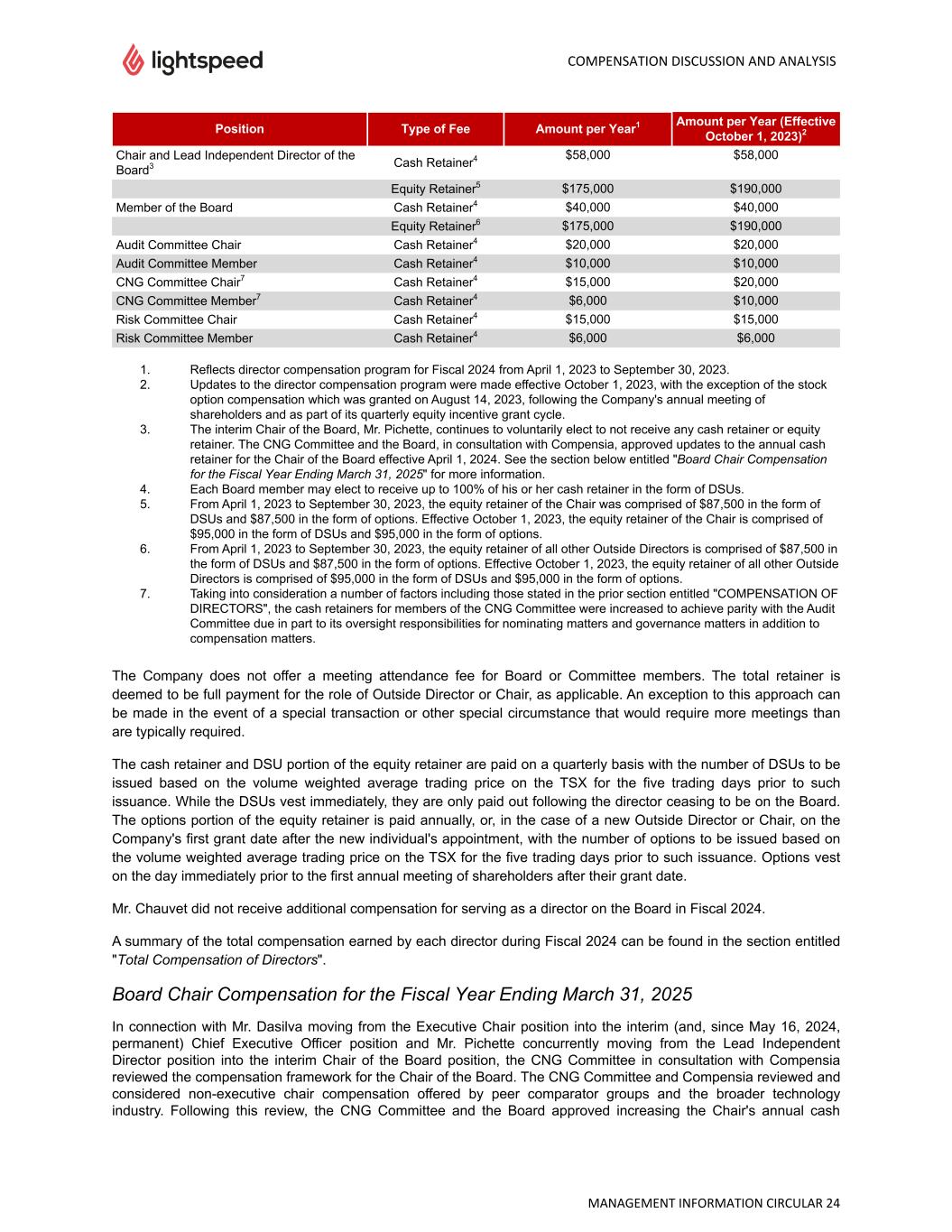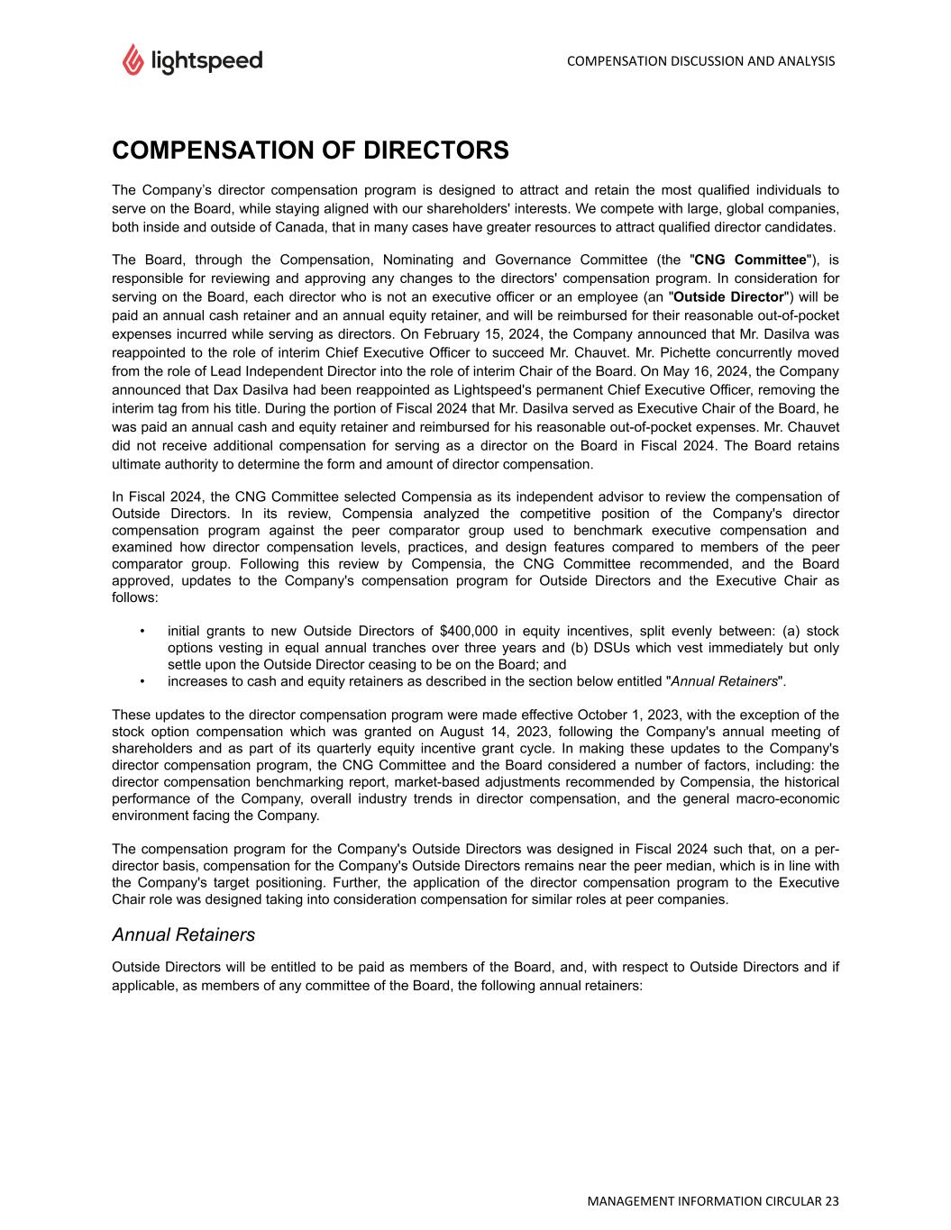 COMPENSATION OF DIRECTORS The Company’s director compensation program is designed to attract and retain the most qualified individuals to serve on the Board, while staying aligned with our shareholders' interests. We compete with large, global companies, both inside and outside of Canada, that in many cases have greater resources to attract qualified director candidates. The Board, through the Compensation, Nominating and Governance Committee (the "CNG Committee"), is responsible for reviewing and approving any changes to the directors' compensation program. In consideration for serving on the Board, each director who is not an executive officer or an employee (an "Outside Director") will be paid an annual cash retainer and an annual equity retainer, and will be reimbursed for their reasonable out-of-pocket expenses incurred while serving as directors. On February 15, 2024, the Company announced that Mr. Dasilva was reappointed to the role of interim Chief Executive Officer to succeed Mr. Chauvet. Mr. Pichette concurrently moved from the role of Lead Independent Director into the role of interim Chair of the Board. On May 16, 2024, the Company announced that Dax Dasilva had been reappointed as Lightspeed's permanent Chief Executive Officer, removing the interim tag from his title. During the portion of Fiscal 2024 that Mr. Dasilva served as Executive Chair of the Board, he was paid an annual cash and equity retainer and reimbursed for his reasonable out-of-pocket expenses. Mr. Chauvet did not receive additional compensation for serving as a director on the Board in Fiscal 2024. The Board retains ultimate authority to determine the form and amount of director compensation. In Fiscal 2024, the CNG Committee selected Compensia as its independent advisor to review the compensation of Outside Directors. In its review, Compensia analyzed the competitive position of the Company's director compensation program against the peer comparator group used to benchmark executive compensation and examined how director compensation levels, practices, and design features compared to members of the peer comparator group. Following this review by Compensia, the CNG Committee recommended, and the Board approved, updates to the Company's compensation program for Outside Directors and the Executive Chair as follows: • initial grants to new Outside Directors of $400,000 in equity incentives, split evenly between: (a) stock options vesting in equal annual tranches over three years and (b) DSUs which vest immediately but only settle upon the Outside Director ceasing to be on the Board; and • increases to cash and equity retainers as described in the section below entitled "Annual Retainers". These updates to the director compensation program were made effective October 1, 2023, with the exception of the stock option compensation which was granted on August 14, 2023, following the Company's annual meeting of shareholders and as part of its quarterly equity incentive grant cycle. In making these updates to the Company's director compensation program, the CNG Committee and the Board considered a number of factors, including: the director compensation benchmarking report, market-based adjustments recommended by Compensia, the historical performance of the Company, overall industry trends in director compensation, and the general macro-economic environment facing the Company. The compensation program for the Company's Outside Directors was designed in Fiscal 2024 such that, on a per- director basis, compensation for the Company's Outside Directors remains near the peer median, which is in line with the Company's target positioning. Further, the application of the director compensation program to the Executive Chair role was designed taking into consideration compensation for similar roles at peer companies. Annual Retainers Outside Directors will be entitled to be paid as members of the Board, and, with respect to Outside Directors and if applicable, as members of any committee of the Board, the following annual retainers: COMPENSATION DISCUSSION AND ANALYSIS MANAGEMENT INFORMATION CIRCULAR 23