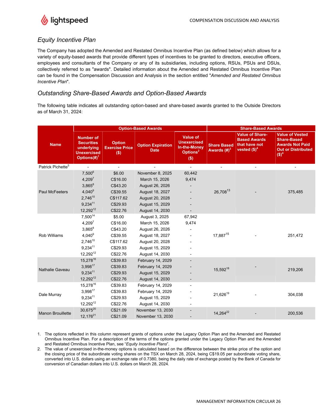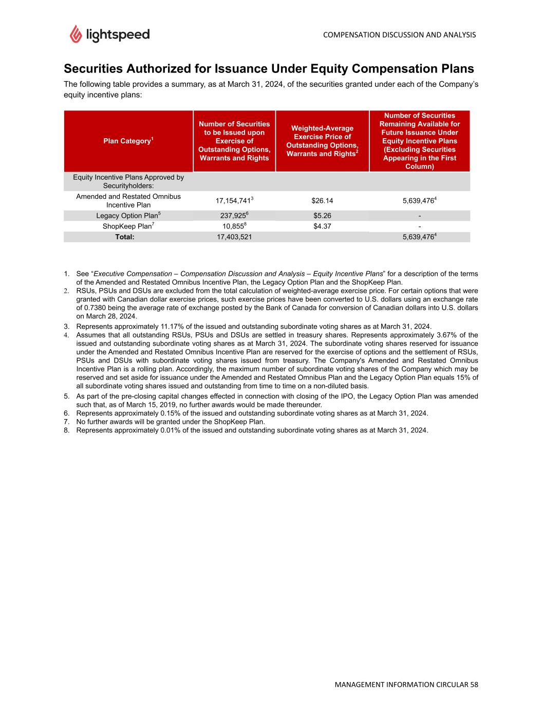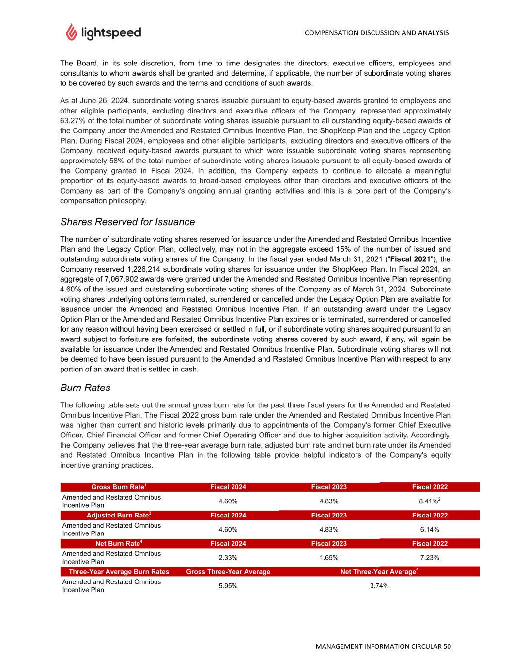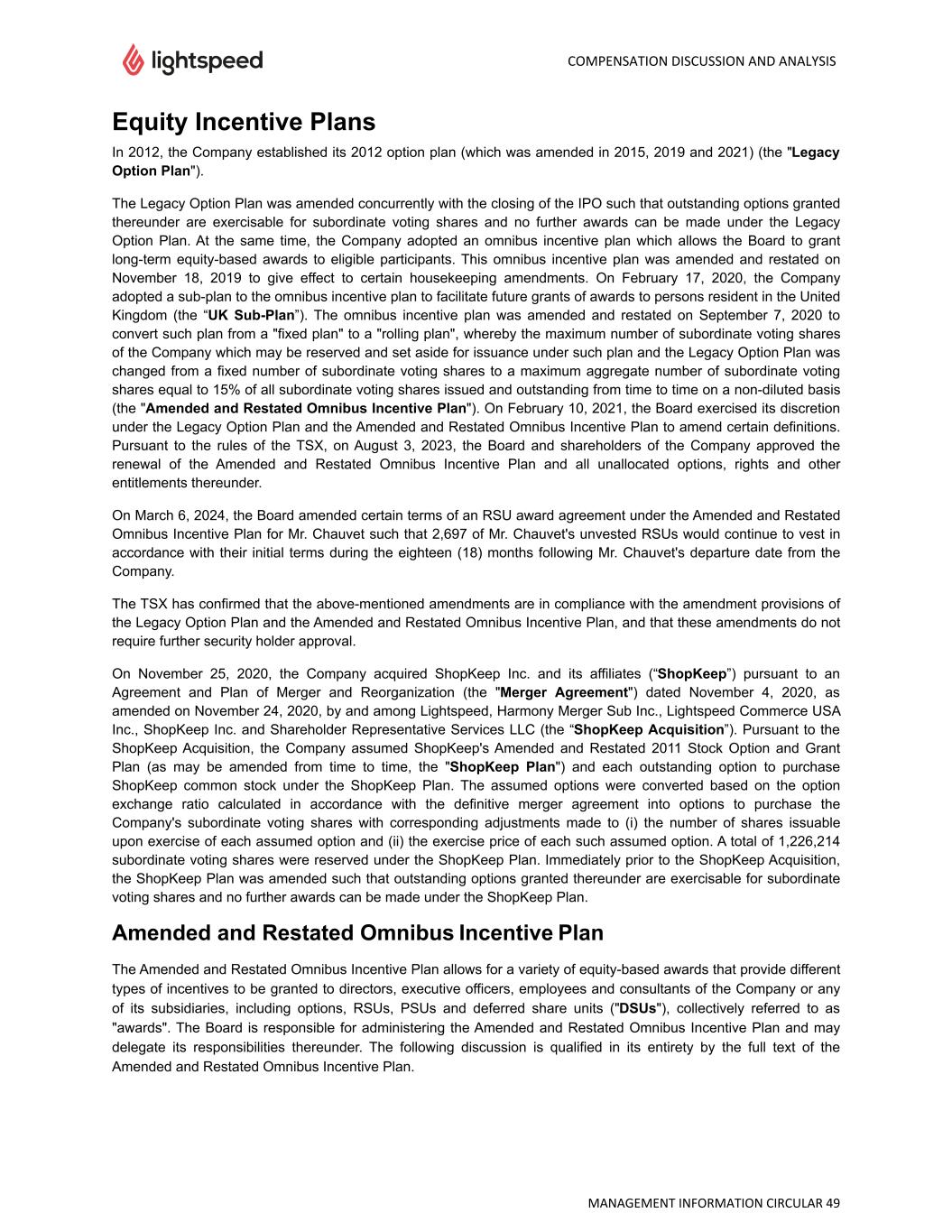 Equity Incentive Plans In 2012, the Company established its 2012 option plan (which was amended in 2015, 2019 and 2021) (the "Legacy Option Plan"). The Legacy Option Plan was amended concurrently with the closing of the IPO such that outstanding options granted thereunder are exercisable for subordinate voting shares and no further awards can be made under the Legacy Option Plan. At the same time, the Company adopted an omnibus incentive plan which allows the Board to grant long-term equity-based awards to eligible participants. This omnibus incentive plan was amended and restated on November 18, 2019 to give effect to certain housekeeping amendments. On February 17, 2020, the Company adopted a sub-plan to the omnibus incentive plan to facilitate future grants of awards to persons resident in the United Kingdom (the “UK Sub-Plan”). The omnibus incentive plan was amended and restated on September 7, 2020 to convert such plan from a "fixed plan" to a "rolling plan", whereby the maximum number of subordinate voting shares of the Company which may be reserved and set aside for issuance under such plan and the Legacy Option Plan was changed from a fixed number of subordinate voting shares to a maximum aggregate number of subordinate voting shares equal to 15% of all subordinate voting shares issued and outstanding from time to time on a non-diluted basis (the "Amended and Restated Omnibus Incentive Plan"). On February 10, 2021, the Board exercised its discretion under the Legacy Option Plan and the Amended and Restated Omnibus Incentive Plan to amend certain definitions. Pursuant to the rules of the TSX, on August 3, 2023, the Board and shareholders of the Company approved the renewal of the Amended and Restated Omnibus Incentive Plan and all unallocated options, rights and other entitlements thereunder. On March 6, 2024, the Board amended certain terms of an RSU award agreement under the Amended and Restated Omnibus Incentive Plan for Mr. Chauvet such that 2,697 of Mr. Chauvet's unvested RSUs would continue to vest in accordance with their initial terms during the eighteen (18) months following Mr. Chauvet's departure date from the Company. The TSX has confirmed that the above-mentioned amendments are in compliance with the amendment provisions of the Legacy Option Plan and the Amended and Restated Omnibus Incentive Plan, and that these amendments do not require further security holder approval. On November 25, 2020, the Company acquired ShopKeep Inc. and its affiliates (“ShopKeep”) pursuant to an Agreement and Plan of Merger and Reorganization (the "Merger Agreement") dated November 4, 2020, as amended on November 24, 2020, by and among Lightspeed, Harmony Merger Sub Inc., Lightspeed Commerce USA Inc., ShopKeep Inc. and Shareholder Representative Services LLC (the “ShopKeep Acquisition”). Pursuant to the ShopKeep Acquisition, the Company assumed ShopKeep's Amended and Restated 2011 Stock Option and Grant Plan (as may be amended from time to time, the "ShopKeep Plan") and each outstanding option to purchase ShopKeep common stock under the ShopKeep Plan. The assumed options were converted based on the option exchange ratio calculated in accordance with the definitive merger agreement into options to purchase the Company's subordinate voting shares with corresponding adjustments made to (i) the number of shares issuable upon exercise of each assumed option and (ii) the exercise price of each such assumed option. A total of 1,226,214 subordinate voting shares were reserved under the ShopKeep Plan. Immediately prior to the ShopKeep Acquisition, the ShopKeep Plan was amended such that outstanding options granted thereunder are exercisable for subordinate voting shares and no further awards can be made under the ShopKeep Plan. Amended and Restated Omnibus Incentive Plan The Amended and Restated Omnibus Incentive Plan allows for a variety of equity-based awards that provide different types of incentives to be granted to directors, executive officers, employees and consultants of the Company or any of its subsidiaries, including options, RSUs, PSUs and deferred share units ("DSUs"), collectively referred to as "awards". The Board is responsible for administering the Amended and Restated Omnibus Incentive Plan and may delegate its responsibilities thereunder. The following discussion is qualified in its entirety by the full text of the Amended and Restated Omnibus Incentive Plan. COMPENSATION DISCUSSION AND ANALYSIS MANAGEMENT INFORMATION CIRCULAR 49