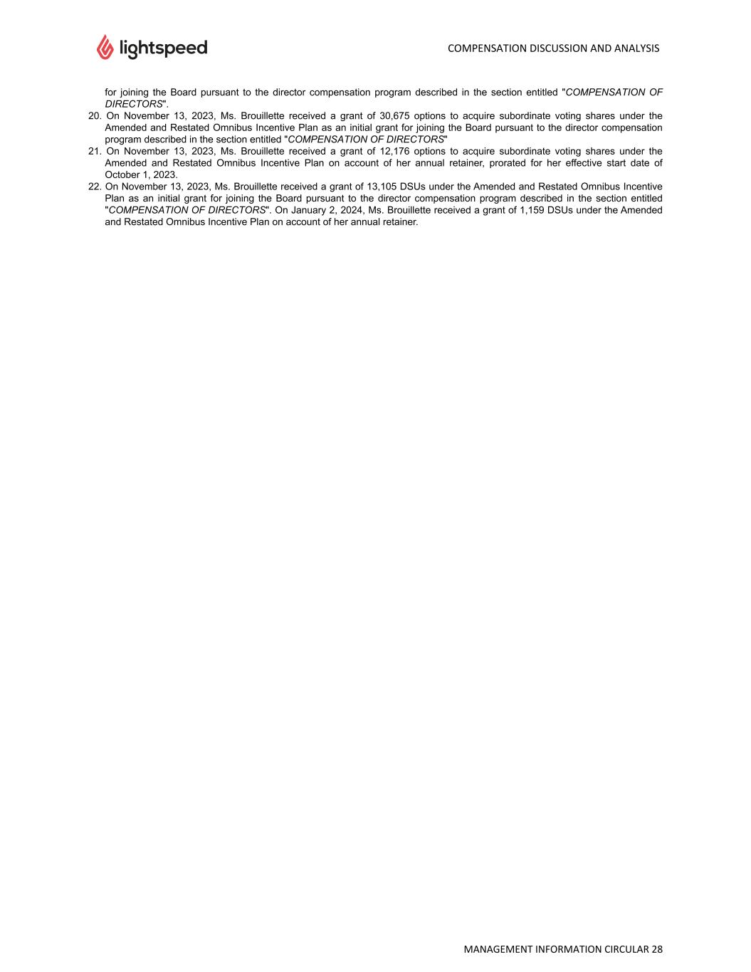 for joining the Board pursuant to the director compensation program described in the section entitled "COMPENSATION OF DIRECTORS". 20. On November 13, 2023, Ms. Brouillette received a grant of 30,675 options to acquire subordinate voting shares under the Amended and Restated Omnibus Incentive Plan as an initial grant for joining the Board pursuant to the director compensation program described in the section entitled "COMPENSATION OF DIRECTORS" 21. On November 13, 2023, Ms. Brouillette received a grant of 12,176 options to acquire subordinate voting shares under the Amended and Restated Omnibus Incentive Plan on account of her annual retainer, prorated for her effective start date of October 1, 2023. 22. On November 13, 2023, Ms. Brouillette received a grant of 13,105 DSUs under the Amended and Restated Omnibus Incentive Plan as an initial grant for joining the Board pursuant to the director compensation program described in the section entitled "COMPENSATION OF DIRECTORS". On January 2, 2024, Ms. Brouillette received a grant of 1,159 DSUs under the Amended and Restated Omnibus Incentive Plan on account of her annual retainer. COMPENSATION DISCUSSION AND ANALYSIS MANAGEMENT INFORMATION CIRCULAR 28