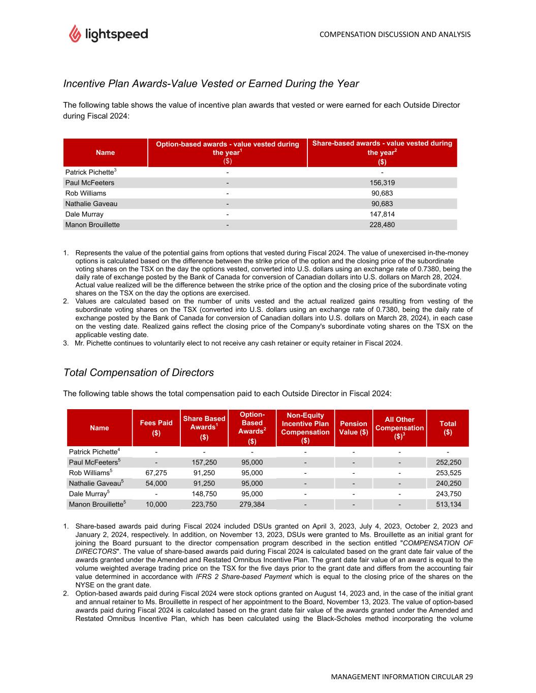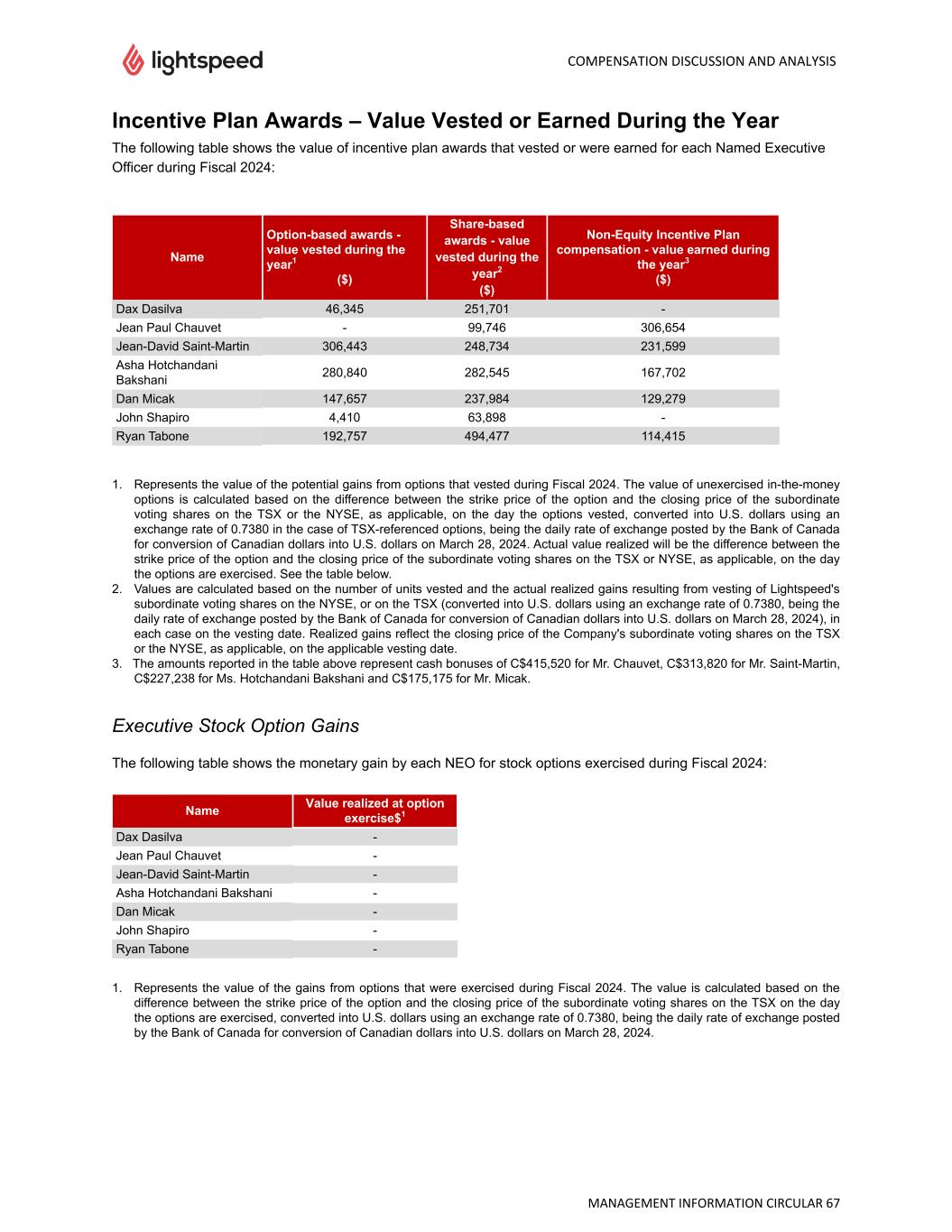 Incentive Plan Awards – Value Vested or Earned During the Year The following table shows the value of incentive plan awards that vested or were earned for each Named Executive Officer during Fiscal 2024: Name Option-based awards - value vested during the year1 ($) Share-based awards - value vested during the year2 ($) Non-Equity Incentive Plan compensation - value earned during the year3 ($) Dax Dasilva 46,345 251,701 - Jean Paul Chauvet - 99,746 306,654 Jean-David Saint-Martin 306,443 248,734 231,599 Asha Hotchandani Bakshani 280,840 282,545 167,702 Dan Micak 147,657 237,984 129,279 John Shapiro 4,410 63,898 - Ryan Tabone 192,757 494,477 114,415 1. Represents the value of the potential gains from options that vested during Fiscal 2024. The value of unexercised in-the-money options is calculated based on the difference between the strike price of the option and the closing price of the subordinate voting shares on the TSX or the NYSE, as applicable, on the day the options vested, converted into U.S. dollars using an exchange rate of 0.7380 in the case of TSX-referenced options, being the daily rate of exchange posted by the Bank of Canada for conversion of Canadian dollars into U.S. dollars on March 28, 2024. Actual value realized will be the difference between the strike price of the option and the closing price of the subordinate voting shares on the TSX or NYSE, as applicable, on the day the options are exercised. See the table below. 2. Values are calculated based on the number of units vested and the actual realized gains resulting from vesting of Lightspeed's subordinate voting shares on the NYSE, or on the TSX (converted into U.S. dollars using an exchange rate of 0.7380, being the daily rate of exchange posted by the Bank of Canada for conversion of Canadian dollars into U.S. dollars on March 28, 2024), in each case on the vesting date. Realized gains reflect the closing price of the Company's subordinate voting shares on the TSX or the NYSE, as applicable, on the applicable vesting date. 3. The amounts reported in the table above represent cash bonuses of C$415,520 for Mr. Chauvet, C$313,820 for Mr. Saint-Martin, C$227,238 for Ms. Hotchandani Bakshani and C$175,175 for Mr. Micak. Executive Stock Option Gains The following table shows the monetary gain by each NEO for stock options exercised during Fiscal 2024: Name Value realized at option exercise$1 Dax Dasilva - Jean Paul Chauvet - Jean-David Saint-Martin - Asha Hotchandani Bakshani - Dan Micak - John Shapiro - Ryan Tabone - 1. Represents the value of the gains from options that were exercised during Fiscal 2024. The value is calculated based on the difference between the strike price of the option and the closing price of the subordinate voting shares on the TSX on the day the options are exercised, converted into U.S. dollars using an exchange rate of 0.7380, being the daily rate of exchange posted by the Bank of Canada for conversion of Canadian dollars into U.S. dollars on March 28, 2024. COMPENSATION DISCUSSION AND ANALYSIS MANAGEMENT INFORMATION CIRCULAR 67
