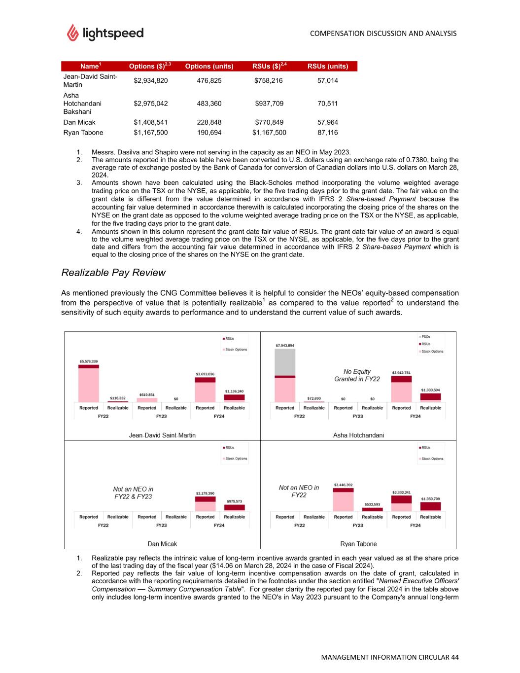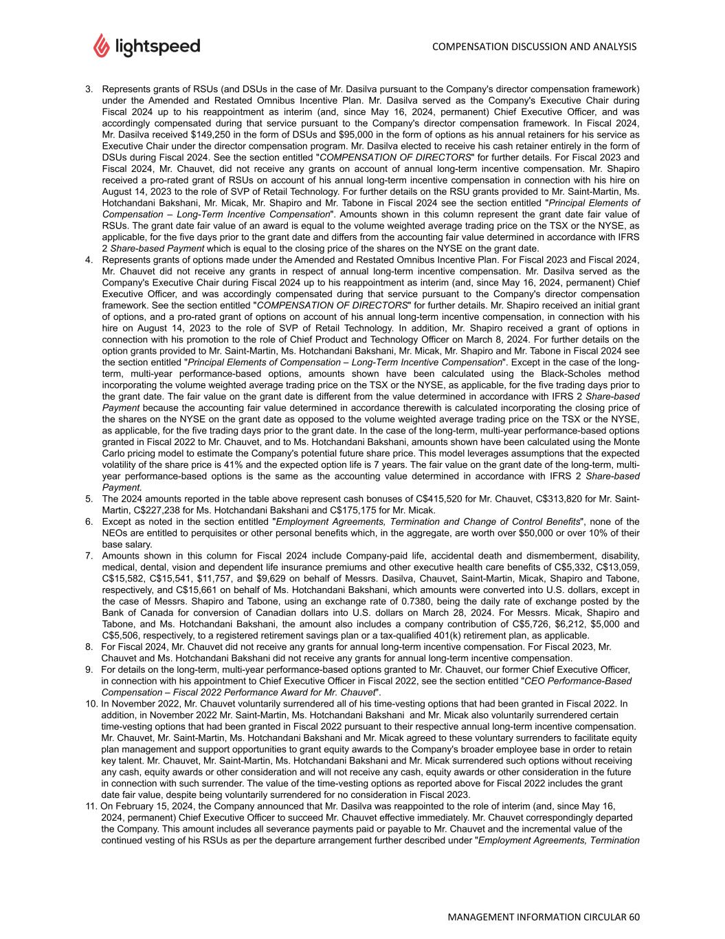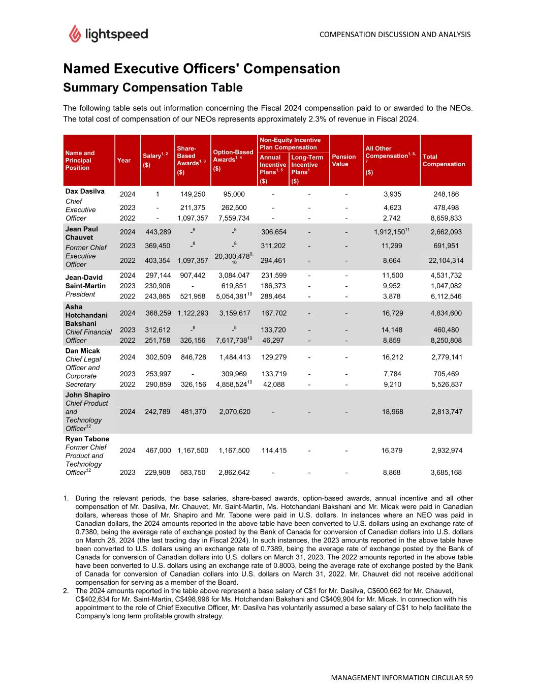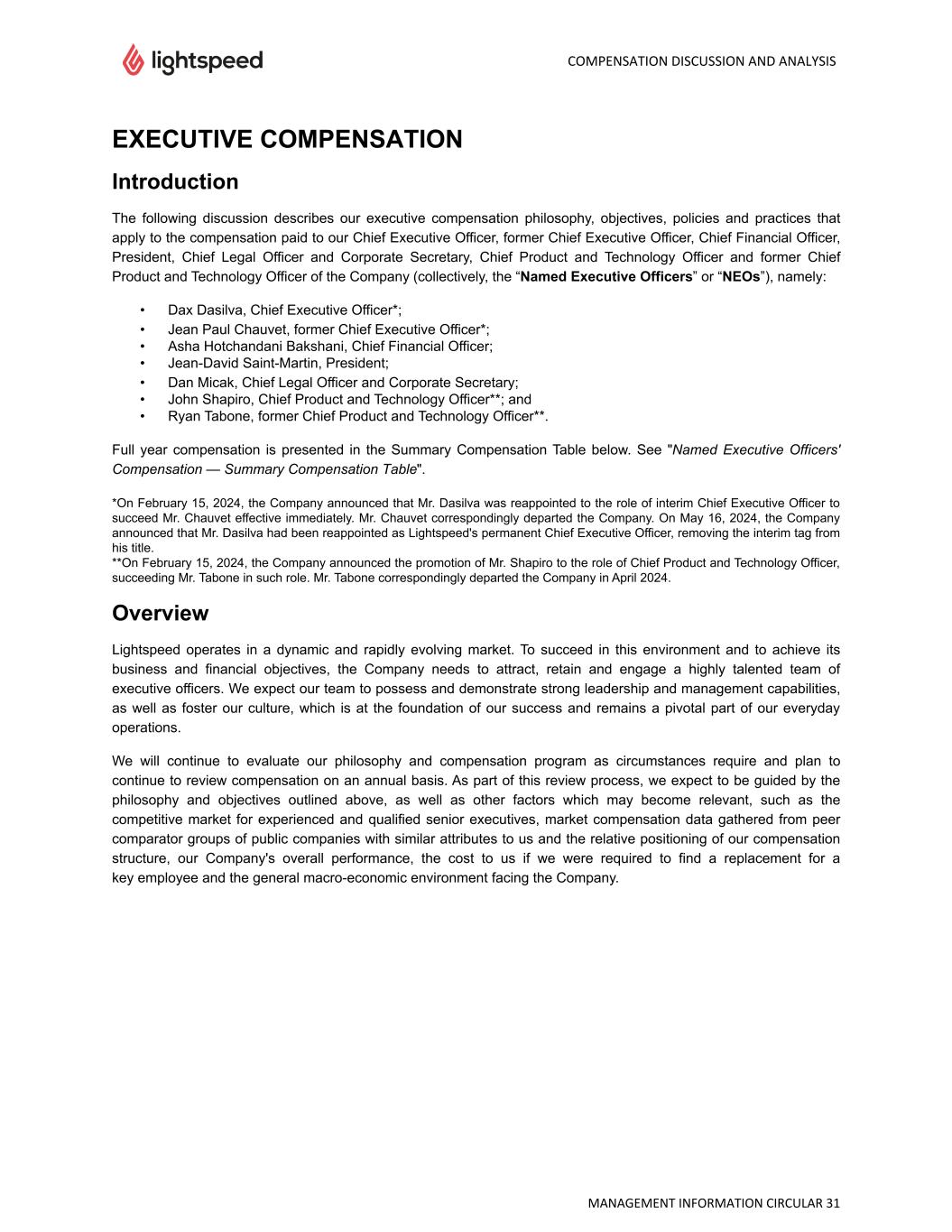 EXECUTIVE COMPENSATION Introduction The following discussion describes our executive compensation philosophy, objectives, policies and practices that apply to the compensation paid to our Chief Executive Officer, former Chief Executive Officer, Chief Financial Officer, President, Chief Legal Officer and Corporate Secretary, Chief Product and Technology Officer and former Chief Product and Technology Officer of the Company (collectively, the “Named Executive Officers” or “NEOs”), namely: • Dax Dasilva, Chief Executive Officer*; • Jean Paul Chauvet, former Chief Executive Officer*; • Asha Hotchandani Bakshani, Chief Financial Officer; • Jean-David Saint-Martin, President; • Dan Micak, Chief Legal Officer and Corporate Secretary; • John Shapiro, Chief Product and Technology Officer**; and • Ryan Tabone, former Chief Product and Technology Officer**. Full year compensation is presented in the Summary Compensation Table below. See "Named Executive Officers' Compensation — Summary Compensation Table". *On February 15, 2024, the Company announced that Mr. Dasilva was reappointed to the role of interim Chief Executive Officer to succeed Mr. Chauvet effective immediately. Mr. Chauvet correspondingly departed the Company. On May 16, 2024, the Company announced that Mr. Dasilva had been reappointed as Lightspeed's permanent Chief Executive Officer, removing the interim tag from his title. **On February 15, 2024, the Company announced the promotion of Mr. Shapiro to the role of Chief Product and Technology Officer, succeeding Mr. Tabone in such role. Mr. Tabone correspondingly departed the Company in April 2024. Overview Lightspeed operates in a dynamic and rapidly evolving market. To succeed in this environment and to achieve its business and financial objectives, the Company needs to attract, retain and engage a highly talented team of executive officers. We expect our team to possess and demonstrate strong leadership and management capabilities, as well as foster our culture, which is at the foundation of our success and remains a pivotal part of our everyday operations. We will continue to evaluate our philosophy and compensation program as circumstances require and plan to continue to review compensation on an annual basis. As part of this review process, we expect to be guided by the philosophy and objectives outlined above, as well as other factors which may become relevant, such as the competitive market for experienced and qualified senior executives, market compensation data gathered from peer comparator groups of public companies with similar attributes to us and the relative positioning of our compensation structure, our Company's overall performance, the cost to us if we were required to find a replacement for a key employee and the general macro-economic environment facing the Company. COMPENSATION DISCUSSION AND ANALYSIS MANAGEMENT INFORMATION CIRCULAR 31