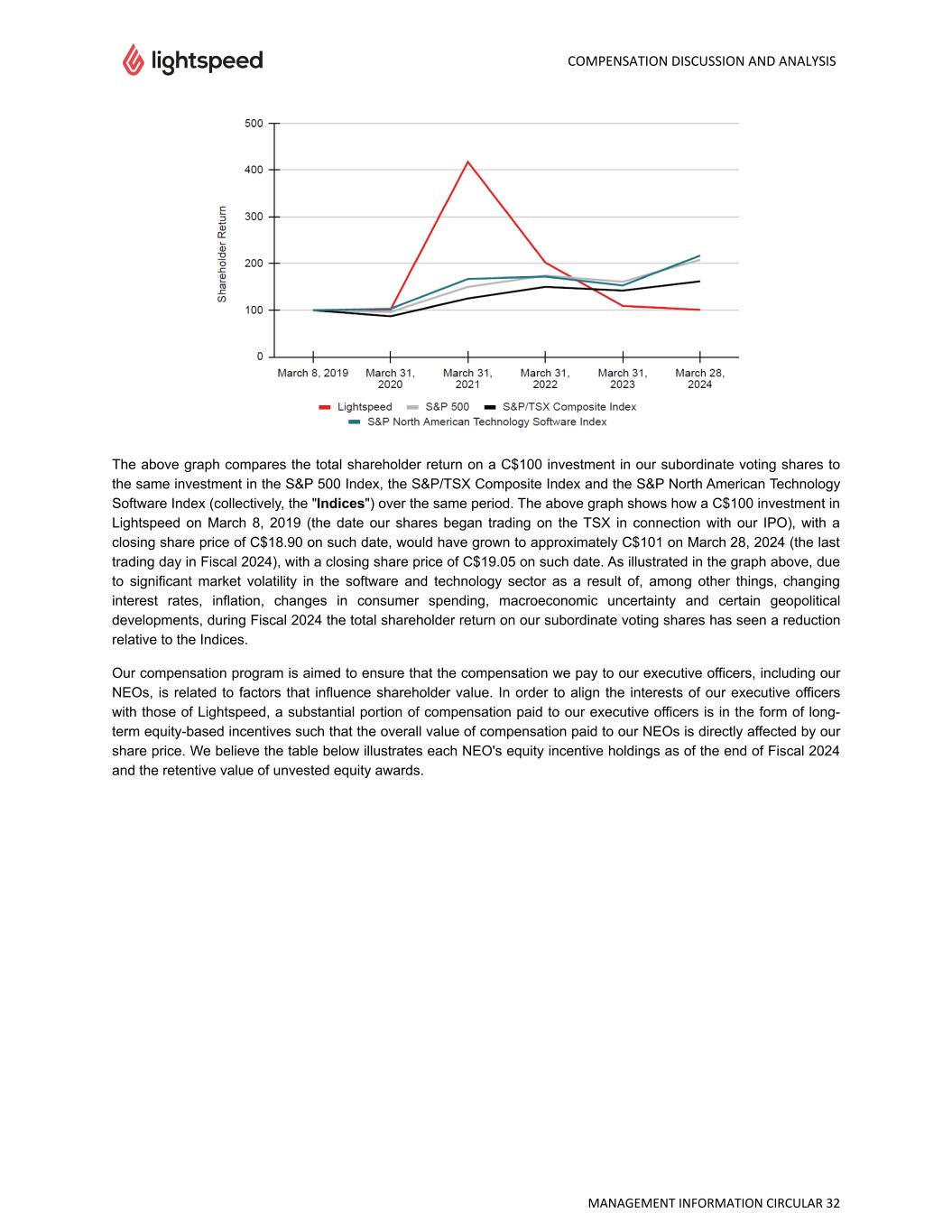 The above graph compares the total shareholder return on a C$100 investment in our subordinate voting shares to the same investment in the S&P 500 Index, the S&P/TSX Composite Index and the S&P North American Technology Software Index (collectively, the "Indices") over the same period. The above graph shows how a C$100 investment in Lightspeed on March 8, 2019 (the date our shares began trading on the TSX in connection with our IPO), with a closing share price of C$18.90 on such date, would have grown to approximately C$101 on March 28, 2024 (the last trading day in Fiscal 2024), with a closing share price of C$19.05 on such date. As illustrated in the graph above, due to significant market volatility in the software and technology sector as a result of, among other things, changing interest rates, inflation, changes in consumer spending, macroeconomic uncertainty and certain geopolitical developments, during Fiscal 2024 the total shareholder return on our subordinate voting shares has seen a reduction relative to the Indices. Our compensation program is aimed to ensure that the compensation we pay to our executive officers, including our NEOs, is related to factors that influence shareholder value. In order to align the interests of our executive officers with those of Lightspeed, a substantial portion of compensation paid to our executive officers is in the form of long- term equity-based incentives such that the overall value of compensation paid to our NEOs is directly affected by our share price. We believe the table below illustrates each NEO's equity incentive holdings as of the end of Fiscal 2024 and the retentive value of unvested equity awards. COMPENSATION DISCUSSION AND ANALYSIS MANAGEMENT INFORMATION CIRCULAR 32