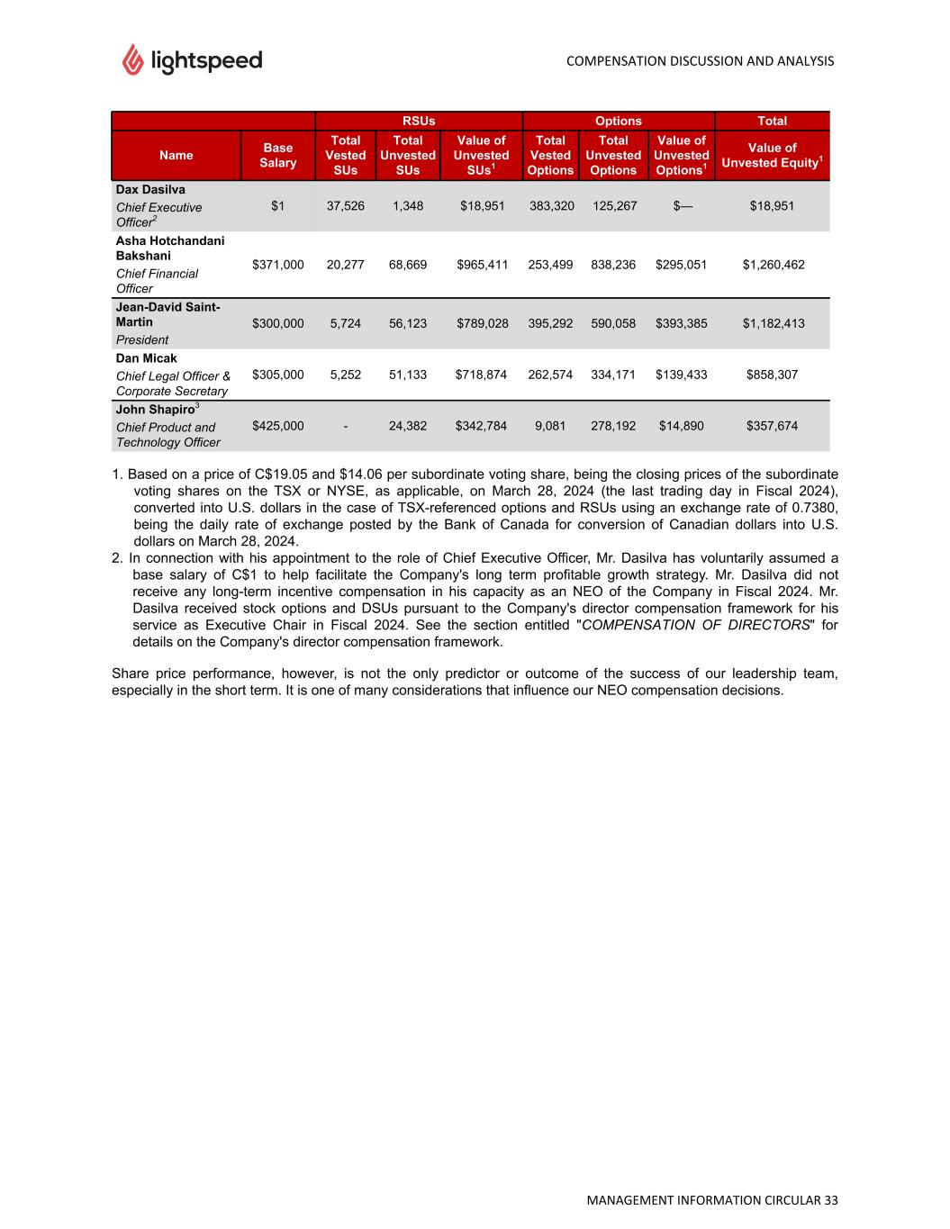 RSUs Options Total Name Base Salary Total Vested SUs Total Unvested SUs Value of Unvested SUs1 Total Vested Options Total Unvested Options Value of Unvested Options1 Value of Unvested Equity1 Dax Dasilva Chief Executive Officer2 $1 37,526 1,348 $18,951 383,320 125,267 $— $18,951 Asha Hotchandani Bakshani Chief Financial Officer $371,000 20,277 68,669 $965,411 253,499 838,236 $295,051 $1,260,462 Jean-David Saint- Martin President $300,000 5,724 56,123 $789,028 395,292 590,058 $393,385 $1,182,413 Dan Micak Chief Legal Officer & Corporate Secretary $305,000 5,252 51,133 $718,874 262,574 334,171 $139,433 $858,307 John Shapiro3 Chief Product and Technology Officer $425,000 - 24,382 $342,784 9,081 278,192 $14,890 $357,674 1. Based on a price of C$19.05 and $14.06 per subordinate voting share, being the closing prices of the subordinate voting shares on the TSX or NYSE, as applicable, on March 28, 2024 (the last trading day in Fiscal 2024), converted into U.S. dollars in the case of TSX-referenced options and RSUs using an exchange rate of 0.7380, being the daily rate of exchange posted by the Bank of Canada for conversion of Canadian dollars into U.S. dollars on March 28, 2024. 2. In connection with his appointment to the role of Chief Executive Officer, Mr. Dasilva has voluntarily assumed a base salary of C$1 to help facilitate the Company's long term profitable growth strategy. Mr. Dasilva did not receive any long-term incentive compensation in his capacity as an NEO of the Company in Fiscal 2024. Mr. Dasilva received stock options and DSUs pursuant to the Company's director compensation framework for his service as Executive Chair in Fiscal 2024. See the section entitled "COMPENSATION OF DIRECTORS" for details on the Company's director compensation framework. Share price performance, however, is not the only predictor or outcome of the success of our leadership team, especially in the short term. It is one of many considerations that influence our NEO compensation decisions. COMPENSATION DISCUSSION AND ANALYSIS MANAGEMENT INFORMATION CIRCULAR 33