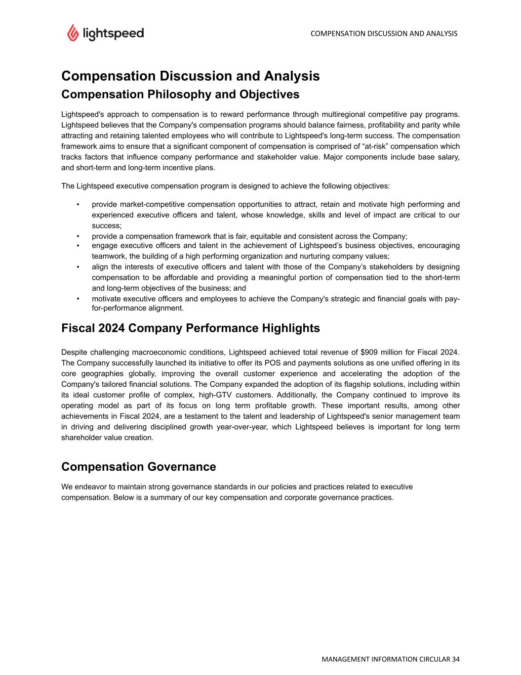 Compensation Discussion and Analysis Compensation Philosophy and Objectives Lightspeed's approach to compensation is to reward performance through multiregional competitive pay programs. Lightspeed believes that the Company's compensation programs should balance fairness, profitability and parity while attracting and retaining talented employees who will contribute to Lightspeed's long-term success. The compensation framework aims to ensure that a significant component of compensation is comprised of “at-risk” compensation which tracks factors that influence company performance and stakeholder value. Major components include base salary, and short-term and long-term incentive plans. The Lightspeed executive compensation program is designed to achieve the following objectives: • provide market-competitive compensation opportunities to attract, retain and motivate high performing and experienced executive officers and talent, whose knowledge, skills and level of impact are critical to our success; • provide a compensation framework that is fair, equitable and consistent across the Company; • engage executive officers and talent in the achievement of Lightspeed’s business objectives, encouraging teamwork, the building of a high performing organization and nurturing company values; • align the interests of executive officers and talent with those of the Company’s stakeholders by designing compensation to be affordable and providing a meaningful portion of compensation tied to the short-term and long-term objectives of the business; and • motivate executive officers and employees to achieve the Company's strategic and financial goals with pay- for-performance alignment. Fiscal 2024 Company Performance Highlights Despite challenging macroeconomic conditions, Lightspeed achieved total revenue of $909 million for Fiscal 2024. The Company successfully launched its initiative to offer its POS and payments solutions as one unified offering in its core geographies globally, improving the overall customer experience and accelerating the adoption of the Company's tailored financial solutions. The Company expanded the adoption of its flagship solutions, including within its ideal customer profile of complex, high-GTV customers. Additionally, the Company continued to improve its operating model as part of its focus on long term profitable growth. These important results, among other achievements in Fiscal 2024, are a testament to the talent and leadership of Lightspeed's senior management team in driving and delivering disciplined growth year-over-year, which Lightspeed believes is important for long term shareholder value creation. Compensation Governance We endeavor to maintain strong governance standards in our policies and practices related to executive compensation. Below is a summary of our key compensation and corporate governance practices. COMPENSATION DISCUSSION AND ANALYSIS MANAGEMENT INFORMATION CIRCULAR 34