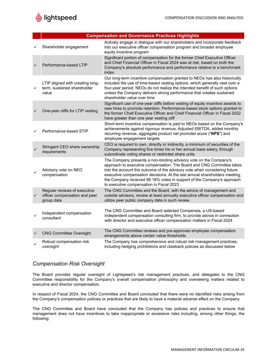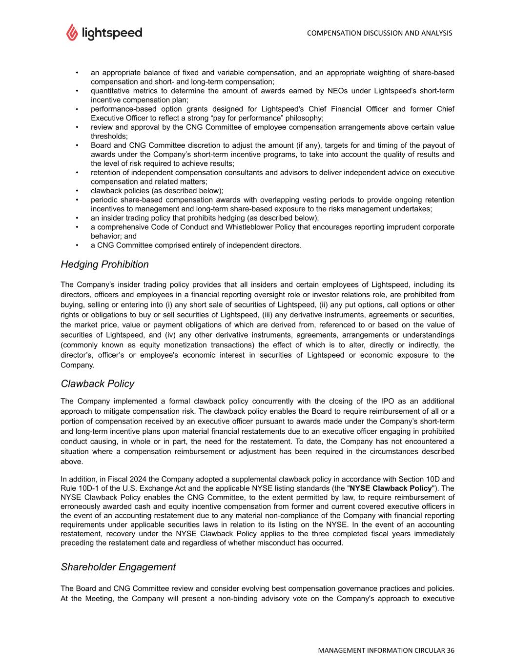 • an appropriate balance of fixed and variable compensation, and an appropriate weighting of share-based compensation and short- and long-term compensation; • quantitative metrics to determine the amount of awards earned by NEOs under Lightspeed’s short-term incentive compensation plan; • performance-based option grants designed for Lightspeed's Chief Financial Officer and former Chief Executive Officer to reflect a strong “pay for performance” philosophy; • review and approval by the CNG Committee of employee compensation arrangements above certain value thresholds; • Board and CNG Committee discretion to adjust the amount (if any), targets for and timing of the payout of awards under the Company’s short-term incentive programs, to take into account the quality of results and the level of risk required to achieve results; • retention of independent compensation consultants and advisors to deliver independent advice on executive compensation and related matters; • clawback policies (as described below); • periodic share-based compensation awards with overlapping vesting periods to provide ongoing retention incentives to management and long-term share-based exposure to the risks management undertakes; • an insider trading policy that prohibits hedging (as described below); • a comprehensive Code of Conduct and Whistleblower Policy that encourages reporting imprudent corporate behavior; and • a CNG Committee comprised entirely of independent directors. Hedging Prohibition The Company’s insider trading policy provides that all insiders and certain employees of Lightspeed, including its directors, officers and employees in a financial reporting oversight role or investor relations role, are prohibited from buying, selling or entering into (i) any short sale of securities of Lightspeed, (ii) any put options, call options or other rights or obligations to buy or sell securities of Lightspeed, (iii) any derivative instruments, agreements or securities, the market price, value or payment obligations of which are derived from, referenced to or based on the value of securities of Lightspeed, and (iv) any other derivative instruments, agreements, arrangements or understandings (commonly known as equity monetization transactions) the effect of which is to alter, directly or indirectly, the director’s, officer’s or employee's economic interest in securities of Lightspeed or economic exposure to the Company. Clawback Policy The Company implemented a formal clawback policy concurrently with the closing of the IPO as an additional approach to mitigate compensation risk. The clawback policy enables the Board to require reimbursement of all or a portion of compensation received by an executive officer pursuant to awards made under the Company’s short-term and long-term incentive plans upon material financial restatements due to an executive officer engaging in prohibited conduct causing, in whole or in part, the need for the restatement. To date, the Company has not encountered a situation where a compensation reimbursement or adjustment has been required in the circumstances described above. In addition, in Fiscal 2024 the Company adopted a supplemental clawback policy in accordance with Section 10D and Rule 10D-1 of the U.S. Exchange Act and the applicable NYSE listing standards (the "NYSE Clawback Policy"). The NYSE Clawback Policy enables the CNG Committee, to the extent permitted by law, to require reimbursement of erroneously awarded cash and equity incentive compensation from former and current covered executive officers in the event of an accounting restatement due to any material non-compliance of the Company with financial reporting requirements under applicable securities laws in relation to its listing on the NYSE. In the event of an accounting restatement, recovery under the NYSE Clawback Policy applies to the three completed fiscal years immediately preceding the restatement date and regardless of whether misconduct has occurred. Shareholder Engagement The Board and CNG Committee review and consider evolving best compensation governance practices and policies. At the Meeting, the Company will present a non-binding advisory vote on the Company's approach to executive COMPENSATION DISCUSSION AND ANALYSIS MANAGEMENT INFORMATION CIRCULAR 36