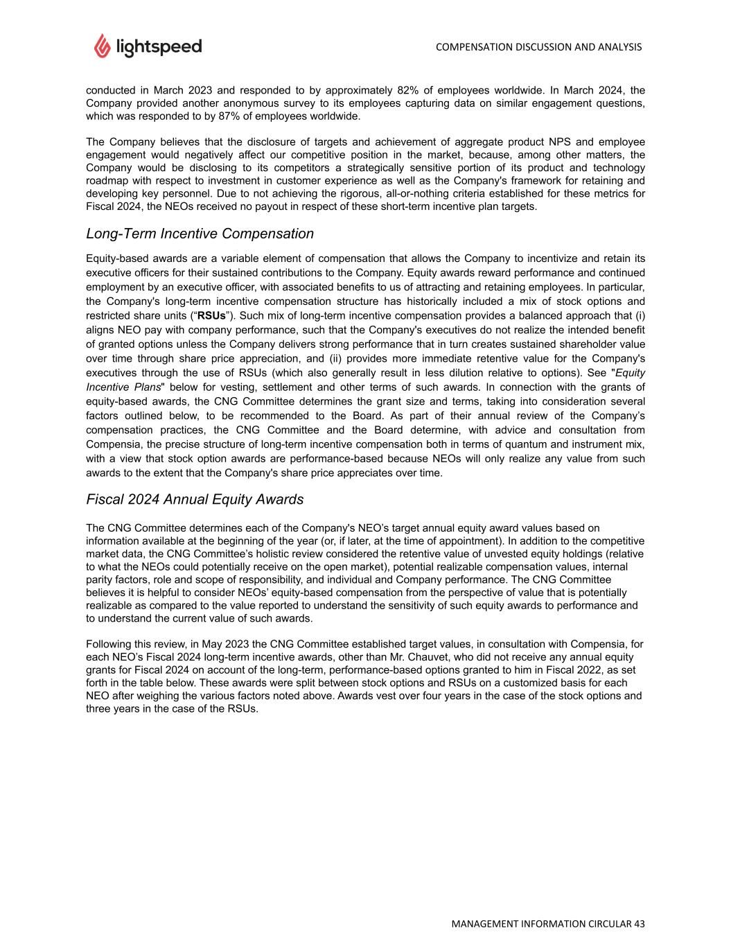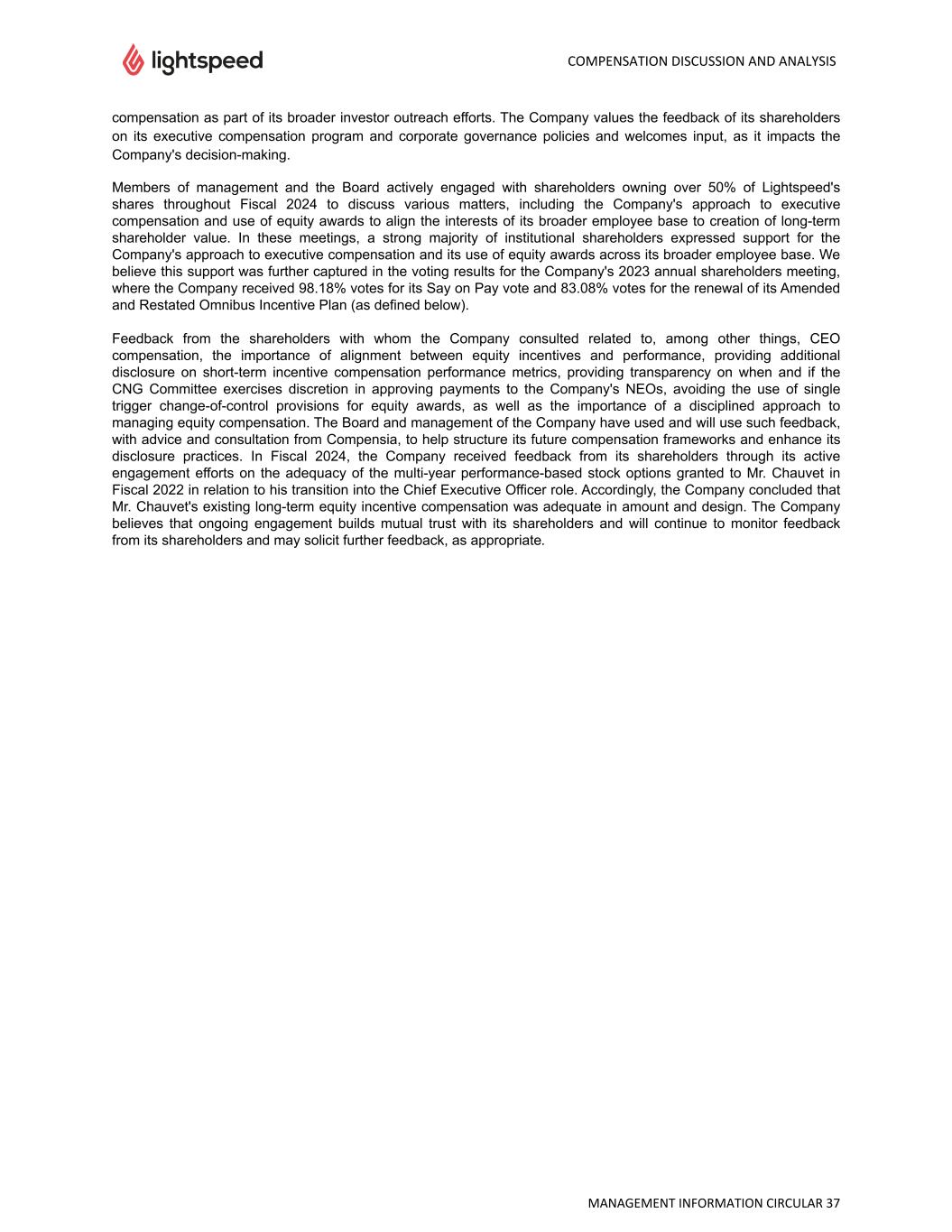 compensation as part of its broader investor outreach efforts. The Company values the feedback of its shareholders on its executive compensation program and corporate governance policies and welcomes input, as it impacts the Company's decision-making. Members of management and the Board actively engaged with shareholders owning over 50% of Lightspeed's shares throughout Fiscal 2024 to discuss various matters, including the Company's approach to executive compensation and use of equity awards to align the interests of its broader employee base to creation of long-term shareholder value. In these meetings, a strong majority of institutional shareholders expressed support for the Company's approach to executive compensation and its use of equity awards across its broader employee base. We believe this support was further captured in the voting results for the Company's 2023 annual shareholders meeting, where the Company received 98.18% votes for its Say on Pay vote and 83.08% votes for the renewal of its Amended and Restated Omnibus Incentive Plan (as defined below). Feedback from the shareholders with whom the Company consulted related to, among other things, CEO compensation, the importance of alignment between equity incentives and performance, providing additional disclosure on short-term incentive compensation performance metrics, providing transparency on when and if the CNG Committee exercises discretion in approving payments to the Company's NEOs, avoiding the use of single trigger change-of-control provisions for equity awards, as well as the importance of a disciplined approach to managing equity compensation. The Board and management of the Company have used and will use such feedback, with advice and consultation from Compensia, to help structure its future compensation frameworks and enhance its disclosure practices. In Fiscal 2024, the Company received feedback from its shareholders through its active engagement efforts on the adequacy of the multi-year performance-based stock options granted to Mr. Chauvet in Fiscal 2022 in relation to his transition into the Chief Executive Officer role. Accordingly, the Company concluded that Mr. Chauvet's existing long-term equity incentive compensation was adequate in amount and design. The Company believes that ongoing engagement builds mutual trust with its shareholders and will continue to monitor feedback from its shareholders and may solicit further feedback, as appropriate. COMPENSATION DISCUSSION AND ANALYSIS MANAGEMENT INFORMATION CIRCULAR 37