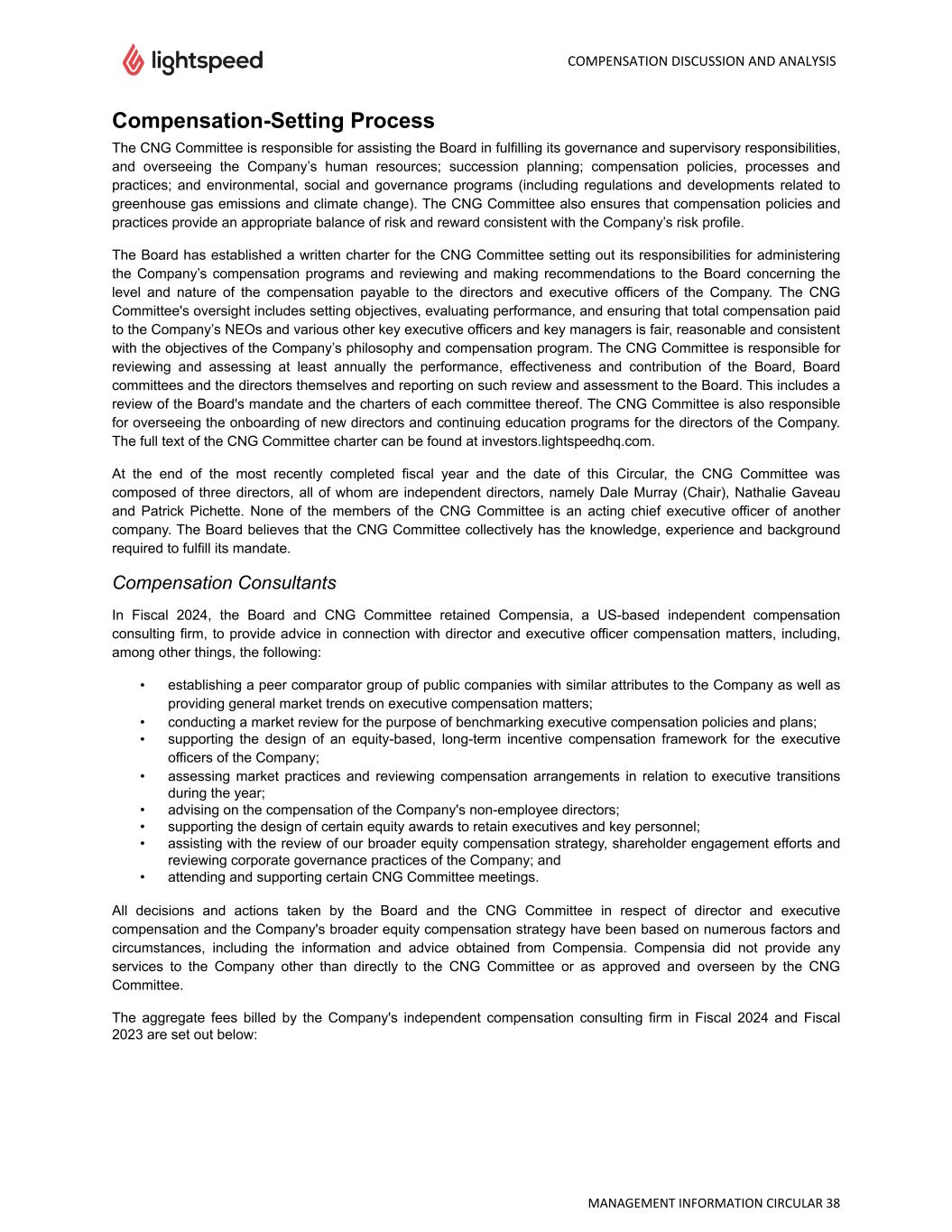 Compensation-Setting Process The CNG Committee is responsible for assisting the Board in fulfilling its governance and supervisory responsibilities, and overseeing the Company’s human resources; succession planning; compensation policies, processes and practices; and environmental, social and governance programs (including regulations and developments related to greenhouse gas emissions and climate change). The CNG Committee also ensures that compensation policies and practices provide an appropriate balance of risk and reward consistent with the Company’s risk profile. The Board has established a written charter for the CNG Committee setting out its responsibilities for administering the Company’s compensation programs and reviewing and making recommendations to the Board concerning the level and nature of the compensation payable to the directors and executive officers of the Company. The CNG Committee's oversight includes setting objectives, evaluating performance, and ensuring that total compensation paid to the Company’s NEOs and various other key executive officers and key managers is fair, reasonable and consistent with the objectives of the Company’s philosophy and compensation program. The CNG Committee is responsible for reviewing and assessing at least annually the performance, effectiveness and contribution of the Board, Board committees and the directors themselves and reporting on such review and assessment to the Board. This includes a review of the Board's mandate and the charters of each committee thereof. The CNG Committee is also responsible for overseeing the onboarding of new directors and continuing education programs for the directors of the Company. The full text of the CNG Committee charter can be found at investors.lightspeedhq.com. At the end of the most recently completed fiscal year and the date of this Circular, the CNG Committee was composed of three directors, all of whom are independent directors, namely Dale Murray (Chair), Nathalie Gaveau and Patrick Pichette. None of the members of the CNG Committee is an acting chief executive officer of another company. The Board believes that the CNG Committee collectively has the knowledge, experience and background required to fulfill its mandate. Compensation Consultants In Fiscal 2024, the Board and CNG Committee retained Compensia, a US-based independent compensation consulting firm, to provide advice in connection with director and executive officer compensation matters, including, among other things, the following: • establishing a peer comparator group of public companies with similar attributes to the Company as well as providing general market trends on executive compensation matters; • conducting a market review for the purpose of benchmarking executive compensation policies and plans; • supporting the design of an equity-based, long-term incentive compensation framework for the executive officers of the Company; • assessing market practices and reviewing compensation arrangements in relation to executive transitions during the year; • advising on the compensation of the Company's non-employee directors; • supporting the design of certain equity awards to retain executives and key personnel; • assisting with the review of our broader equity compensation strategy, shareholder engagement efforts and reviewing corporate governance practices of the Company; and • attending and supporting certain CNG Committee meetings. All decisions and actions taken by the Board and the CNG Committee in respect of director and executive compensation and the Company's broader equity compensation strategy have been based on numerous factors and circumstances, including the information and advice obtained from Compensia. Compensia did not provide any services to the Company other than directly to the CNG Committee or as approved and overseen by the CNG Committee. The aggregate fees billed by the Company's independent compensation consulting firm in Fiscal 2024 and Fiscal 2023 are set out below: COMPENSATION DISCUSSION AND ANALYSIS MANAGEMENT INFORMATION CIRCULAR 38