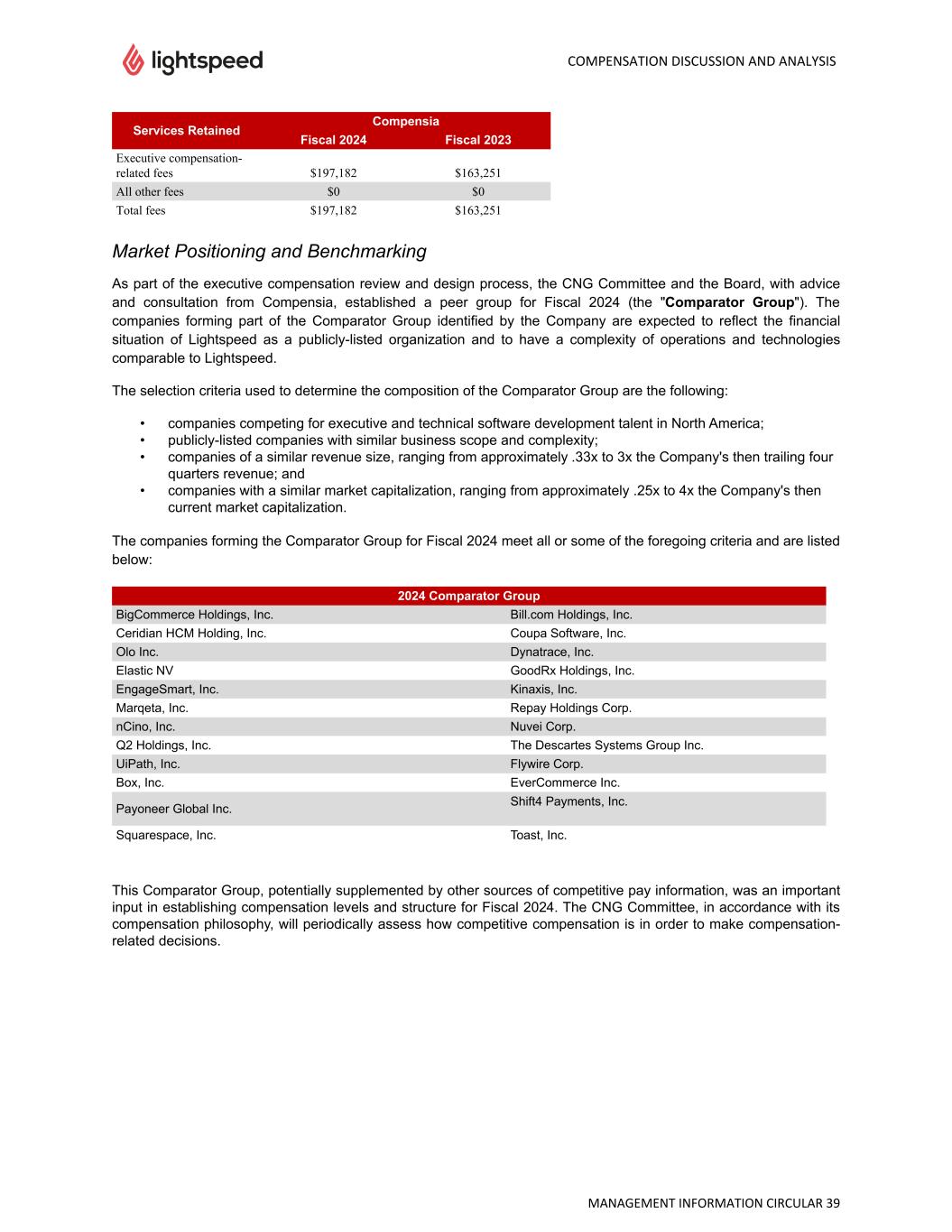 Services Retained Compensia Fiscal 2024 Fiscal 2023 Executive compensation- related fees $197,182 $163,251 All other fees $0 $0 Total fees $197,182 $163,251 Market Positioning and Benchmarking As part of the executive compensation review and design process, the CNG Committee and the Board, with advice and consultation from Compensia, established a peer group for Fiscal 2024 (the "Comparator Group"). The companies forming part of the Comparator Group identified by the Company are expected to reflect the financial situation of Lightspeed as a publicly-listed organization and to have a complexity of operations and technologies comparable to Lightspeed. The selection criteria used to determine the composition of the Comparator Group are the following: • companies competing for executive and technical software development talent in North America; • publicly-listed companies with similar business scope and complexity; • companies of a similar revenue size, ranging from approximately .33x to 3x the Company's then trailing four quarters revenue; and • companies with a similar market capitalization, ranging from approximately .25x to 4x the Company's then current market capitalization. The companies forming the Comparator Group for Fiscal 2024 meet all or some of the foregoing criteria and are listed below: 2024 Comparator Group BigCommerce Holdings, Inc. Bill.com Holdings, Inc. Ceridian HCM Holding, Inc. Coupa Software, Inc. Olo Inc. Dynatrace, Inc. Elastic NV GoodRx Holdings, Inc. EngageSmart, Inc. Kinaxis, Inc. Marqeta, Inc. Repay Holdings Corp. nCino, Inc. Nuvei Corp. Q2 Holdings, Inc. The Descartes Systems Group Inc. UiPath, Inc. Flywire Corp. Box, Inc. EverCommerce Inc. Payoneer Global Inc. Shift4 Payments, Inc. Squarespace, Inc. Toast, Inc. This Comparator Group, potentially supplemented by other sources of competitive pay information, was an important input in establishing compensation levels and structure for Fiscal 2024. The CNG Committee, in accordance with its compensation philosophy, will periodically assess how competitive compensation is in order to make compensation- related decisions. COMPENSATION DISCUSSION AND ANALYSIS MANAGEMENT INFORMATION CIRCULAR 39
