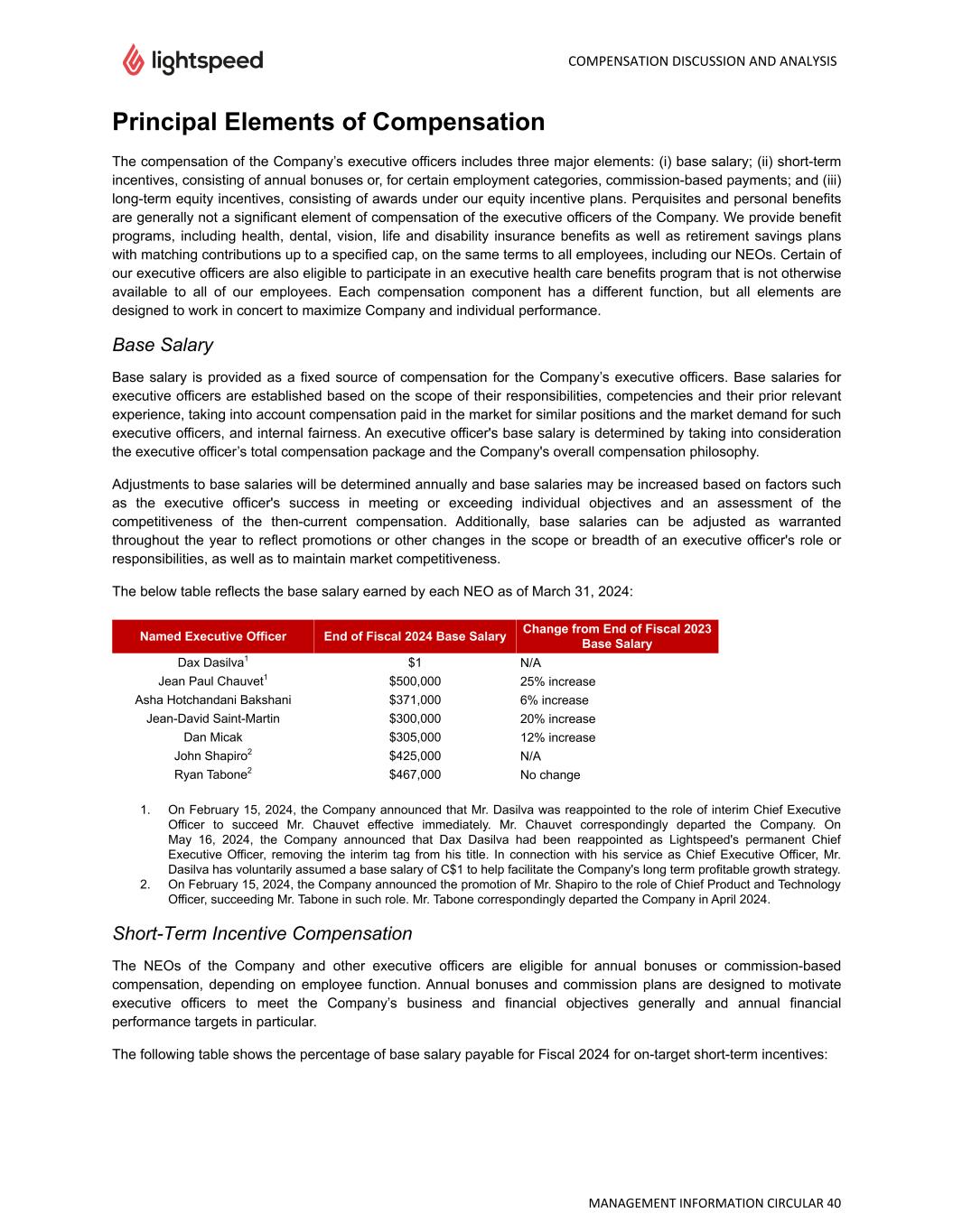 Principal Elements of Compensation The compensation of the Company’s executive officers includes three major elements: (i) base salary; (ii) short-term incentives, consisting of annual bonuses or, for certain employment categories, commission-based payments; and (iii) long-term equity incentives, consisting of awards under our equity incentive plans. Perquisites and personal benefits are generally not a significant element of compensation of the executive officers of the Company. We provide benefit programs, including health, dental, vision, life and disability insurance benefits as well as retirement savings plans with matching contributions up to a specified cap, on the same terms to all employees, including our NEOs. Certain of our executive officers are also eligible to participate in an executive health care benefits program that is not otherwise available to all of our employees. Each compensation component has a different function, but all elements are designed to work in concert to maximize Company and individual performance. Base Salary Base salary is provided as a fixed source of compensation for the Company’s executive officers. Base salaries for executive officers are established based on the scope of their responsibilities, competencies and their prior relevant experience, taking into account compensation paid in the market for similar positions and the market demand for such executive officers, and internal fairness. An executive officer's base salary is determined by taking into consideration the executive officer’s total compensation package and the Company's overall compensation philosophy. Adjustments to base salaries will be determined annually and base salaries may be increased based on factors such as the executive officer's success in meeting or exceeding individual objectives and an assessment of the competitiveness of the then-current compensation. Additionally, base salaries can be adjusted as warranted throughout the year to reflect promotions or other changes in the scope or breadth of an executive officer's role or responsibilities, as well as to maintain market competitiveness. The below table reflects the base salary earned by each NEO as of March 31, 2024: Named Executive Officer End of Fiscal 2024 Base Salary Change from End of Fiscal 2023 Base Salary Dax Dasilva1 $1 N/A Jean Paul Chauvet1 $500,000 25% increase Asha Hotchandani Bakshani $371,000 6% increase Jean-David Saint-Martin $300,000 20% increase Dan Micak $305,000 12% increase John Shapiro2 $425,000 N/A Ryan Tabone2 $467,000 No change 1. On February 15, 2024, the Company announced that Mr. Dasilva was reappointed to the role of interim Chief Executive Officer to succeed Mr. Chauvet effective immediately. Mr. Chauvet correspondingly departed the Company. On May 16, 2024, the Company announced that Dax Dasilva had been reappointed as Lightspeed's permanent Chief Executive Officer, removing the interim tag from his title. In connection with his service as Chief Executive Officer, Mr. Dasilva has voluntarily assumed a base salary of C$1 to help facilitate the Company's long term profitable growth strategy. 2. On February 15, 2024, the Company announced the promotion of Mr. Shapiro to the role of Chief Product and Technology Officer, succeeding Mr. Tabone in such role. Mr. Tabone correspondingly departed the Company in April 2024. Short-Term Incentive Compensation The NEOs of the Company and other executive officers are eligible for annual bonuses or commission-based compensation, depending on employee function. Annual bonuses and commission plans are designed to motivate executive officers to meet the Company’s business and financial objectives generally and annual financial performance targets in particular. The following table shows the percentage of base salary payable for Fiscal 2024 for on-target short-term incentives: COMPENSATION DISCUSSION AND ANALYSIS MANAGEMENT INFORMATION CIRCULAR 40