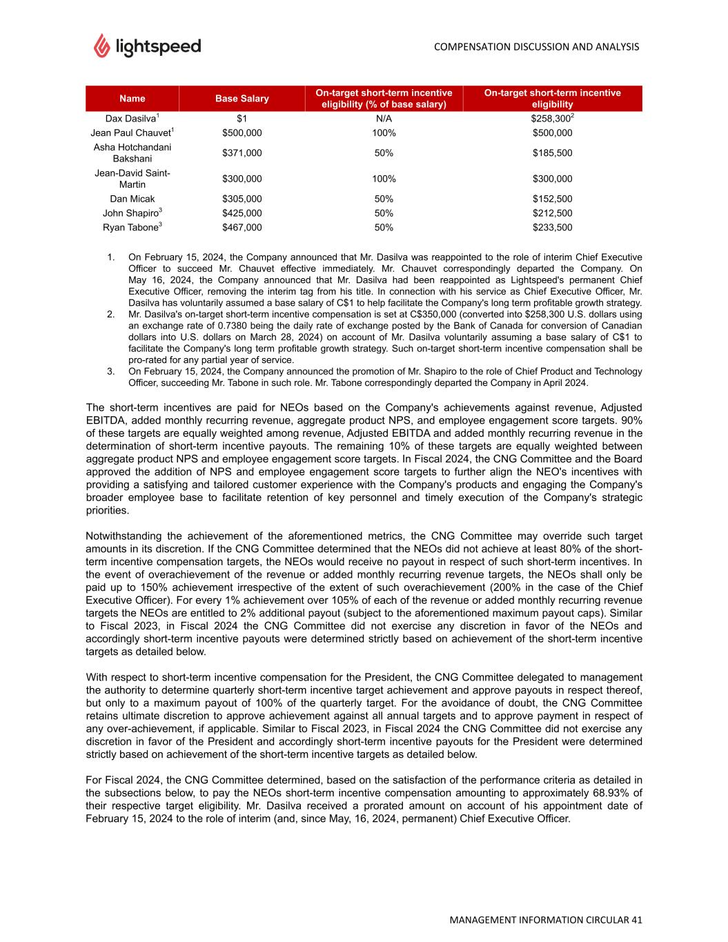 Name Base Salary On-target short-term incentive eligibility (% of base salary) On-target short-term incentive eligibility Dax Dasilva1 $1 N/A $258,3002 Jean Paul Chauvet1 $500,000 100% $500,000 Asha Hotchandani Bakshani $371,000 50% $185,500 Jean-David Saint- Martin $300,000 100% $300,000 Dan Micak $305,000 50% $152,500 John Shapiro3 $425,000 50% $212,500 Ryan Tabone3 $467,000 50% $233,500 1. On February 15, 2024, the Company announced that Mr. Dasilva was reappointed to the role of interim Chief Executive Officer to succeed Mr. Chauvet effective immediately. Mr. Chauvet correspondingly departed the Company. On May 16, 2024, the Company announced that Mr. Dasilva had been reappointed as Lightspeed's permanent Chief Executive Officer, removing the interim tag from his title. In connection with his service as Chief Executive Officer, Mr. Dasilva has voluntarily assumed a base salary of C$1 to help facilitate the Company's long term profitable growth strategy. 2. Mr. Dasilva's on-target short-term incentive compensation is set at C$350,000 (converted into $258,300 U.S. dollars using an exchange rate of 0.7380 being the daily rate of exchange posted by the Bank of Canada for conversion of Canadian dollars into U.S. dollars on March 28, 2024) on account of Mr. Dasilva voluntarily assuming a base salary of C$1 to facilitate the Company's long term profitable growth strategy. Such on-target short-term incentive compensation shall be pro-rated for any partial year of service. 3. On February 15, 2024, the Company announced the promotion of Mr. Shapiro to the role of Chief Product and Technology Officer, succeeding Mr. Tabone in such role. Mr. Tabone correspondingly departed the Company in April 2024. The short-term incentives are paid for NEOs based on the Company's achievements against revenue, Adjusted EBITDA, added monthly recurring revenue, aggregate product NPS, and employee engagement score targets. 90% of these targets are equally weighted among revenue, Adjusted EBITDA and added monthly recurring revenue in the determination of short-term incentive payouts. The remaining 10% of these targets are equally weighted between aggregate product NPS and employee engagement score targets. In Fiscal 2024, the CNG Committee and the Board approved the addition of NPS and employee engagement score targets to further align the NEO's incentives with providing a satisfying and tailored customer experience with the Company's products and engaging the Company's broader employee base to facilitate retention of key personnel and timely execution of the Company's strategic priorities. Notwithstanding the achievement of the aforementioned metrics, the CNG Committee may override such target amounts in its discretion. If the CNG Committee determined that the NEOs did not achieve at least 80% of the short- term incentive compensation targets, the NEOs would receive no payout in respect of such short-term incentives. In the event of overachievement of the revenue or added monthly recurring revenue targets, the NEOs shall only be paid up to 150% achievement irrespective of the extent of such overachievement (200% in the case of the Chief Executive Officer). For every 1% achievement over 105% of each of the revenue or added monthly recurring revenue targets the NEOs are entitled to 2% additional payout (subject to the aforementioned maximum payout caps). Similar to Fiscal 2023, in Fiscal 2024 the CNG Committee did not exercise any discretion in favor of the NEOs and accordingly short-term incentive payouts were determined strictly based on achievement of the short-term incentive targets as detailed below. With respect to short-term incentive compensation for the President, the CNG Committee delegated to management the authority to determine quarterly short-term incentive target achievement and approve payouts in respect thereof, but only to a maximum payout of 100% of the quarterly target. For the avoidance of doubt, the CNG Committee retains ultimate discretion to approve achievement against all annual targets and to approve payment in respect of any over-achievement, if applicable. Similar to Fiscal 2023, in Fiscal 2024 the CNG Committee did not exercise any discretion in favor of the President and accordingly short-term incentive payouts for the President were determined strictly based on achievement of the short-term incentive targets as detailed below. For Fiscal 2024, the CNG Committee determined, based on the satisfaction of the performance criteria as detailed in the subsections below, to pay the NEOs short-term incentive compensation amounting to approximately 68.93% of their respective target eligibility. Mr. Dasilva received a prorated amount on account of his appointment date of February 15, 2024 to the role of interim (and, since May, 16, 2024, permanent) Chief Executive Officer. COMPENSATION DISCUSSION AND ANALYSIS MANAGEMENT INFORMATION CIRCULAR 41