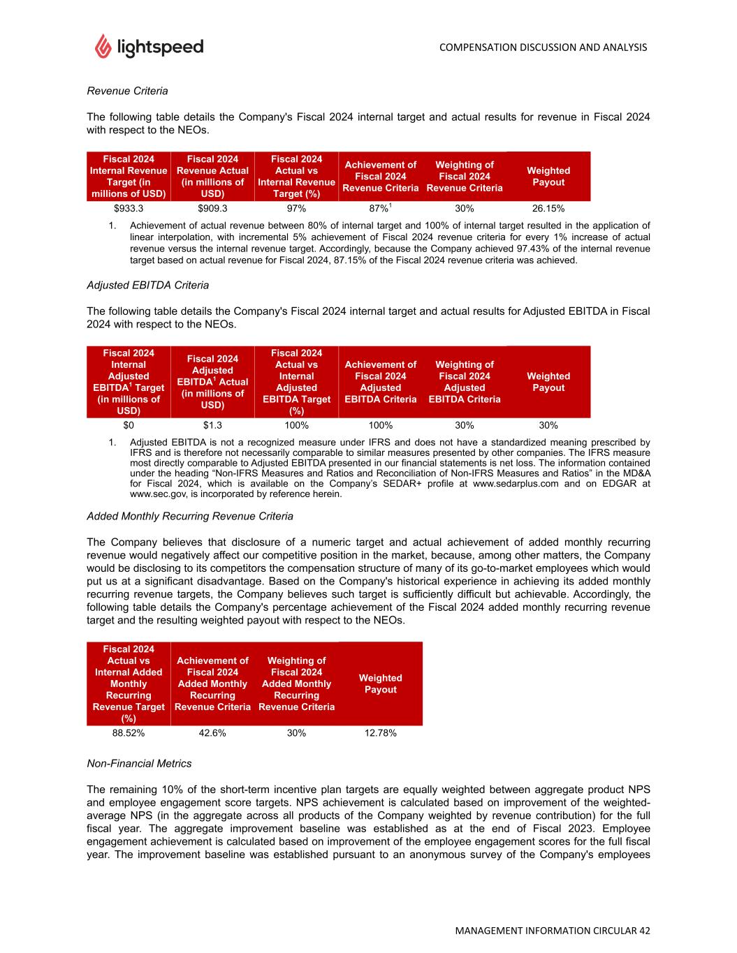 Revenue Criteria The following table details the Company's Fiscal 2024 internal target and actual results for revenue in Fiscal 2024 with respect to the NEOs. Fiscal 2024 Internal Revenue Target (in millions of USD) Fiscal 2024 Revenue Actual (in millions of USD) Fiscal 2024 Actual vs Internal Revenue Target (%) Achievement of Fiscal 2024 Revenue Criteria Weighting of Fiscal 2024 Revenue Criteria Weighted Payout $933.3 $909.3 97% 87%1 30% 26.15% 1. Achievement of actual revenue between 80% of internal target and 100% of internal target resulted in the application of linear interpolation, with incremental 5% achievement of Fiscal 2024 revenue criteria for every 1% increase of actual revenue versus the internal revenue target. Accordingly, because the Company achieved 97.43% of the internal revenue target based on actual revenue for Fiscal 2024, 87.15% of the Fiscal 2024 revenue criteria was achieved. Adjusted EBITDA Criteria The following table details the Company's Fiscal 2024 internal target and actual results for Adjusted EBITDA in Fiscal 2024 with respect to the NEOs. Fiscal 2024 Internal Adjusted EBITDA1 Target (in millions of USD) Fiscal 2024 Adjusted EBITDA1 Actual (in millions of USD) Fiscal 2024 Actual vs Internal Adjusted EBITDA Target (%) Achievement of Fiscal 2024 Adjusted EBITDA Criteria Weighting of Fiscal 2024 Adjusted EBITDA Criteria Weighted Payout $0 $1.3 100% 100% 30% 30% 1. Adjusted EBITDA is not a recognized measure under IFRS and does not have a standardized meaning prescribed by IFRS and is therefore not necessarily comparable to similar measures presented by other companies. The IFRS measure most directly comparable to Adjusted EBITDA presented in our financial statements is net loss. The information contained under the heading “Non-IFRS Measures and Ratios and Reconciliation of Non-IFRS Measures and Ratios” in the MD&A for Fiscal 2024, which is available on the Company’s SEDAR+ profile at www.sedarplus.com and on EDGAR at www.sec.gov, is incorporated by reference herein. Added Monthly Recurring Revenue Criteria The Company believes that disclosure of a numeric target and actual achievement of added monthly recurring revenue would negatively affect our competitive position in the market, because, among other matters, the Company would be disclosing to its competitors the compensation structure of many of its go-to-market employees which would put us at a significant disadvantage. Based on the Company's historical experience in achieving its added monthly recurring revenue targets, the Company believes such target is sufficiently difficult but achievable. Accordingly, the following table details the Company's percentage achievement of the Fiscal 2024 added monthly recurring revenue target and the resulting weighted payout with respect to the NEOs. Fiscal 2024 Actual vs Internal Added Monthly Recurring Revenue Target (%) Achievement of Fiscal 2024 Added Monthly Recurring Revenue Criteria Weighting of Fiscal 2024 Added Monthly Recurring Revenue Criteria Weighted Payout 88.52% 42.6% 30% 12.78% Non-Financial Metrics The remaining 10% of the short-term incentive plan targets are equally weighted between aggregate product NPS and employee engagement score targets. NPS achievement is calculated based on improvement of the weighted- average NPS (in the aggregate across all products of the Company weighted by revenue contribution) for the full fiscal year. The aggregate improvement baseline was established as at the end of Fiscal 2023. Employee engagement achievement is calculated based on improvement of the employee engagement scores for the full fiscal year. The improvement baseline was established pursuant to an anonymous survey of the Company's employees COMPENSATION DISCUSSION AND ANALYSIS MANAGEMENT INFORMATION CIRCULAR 42