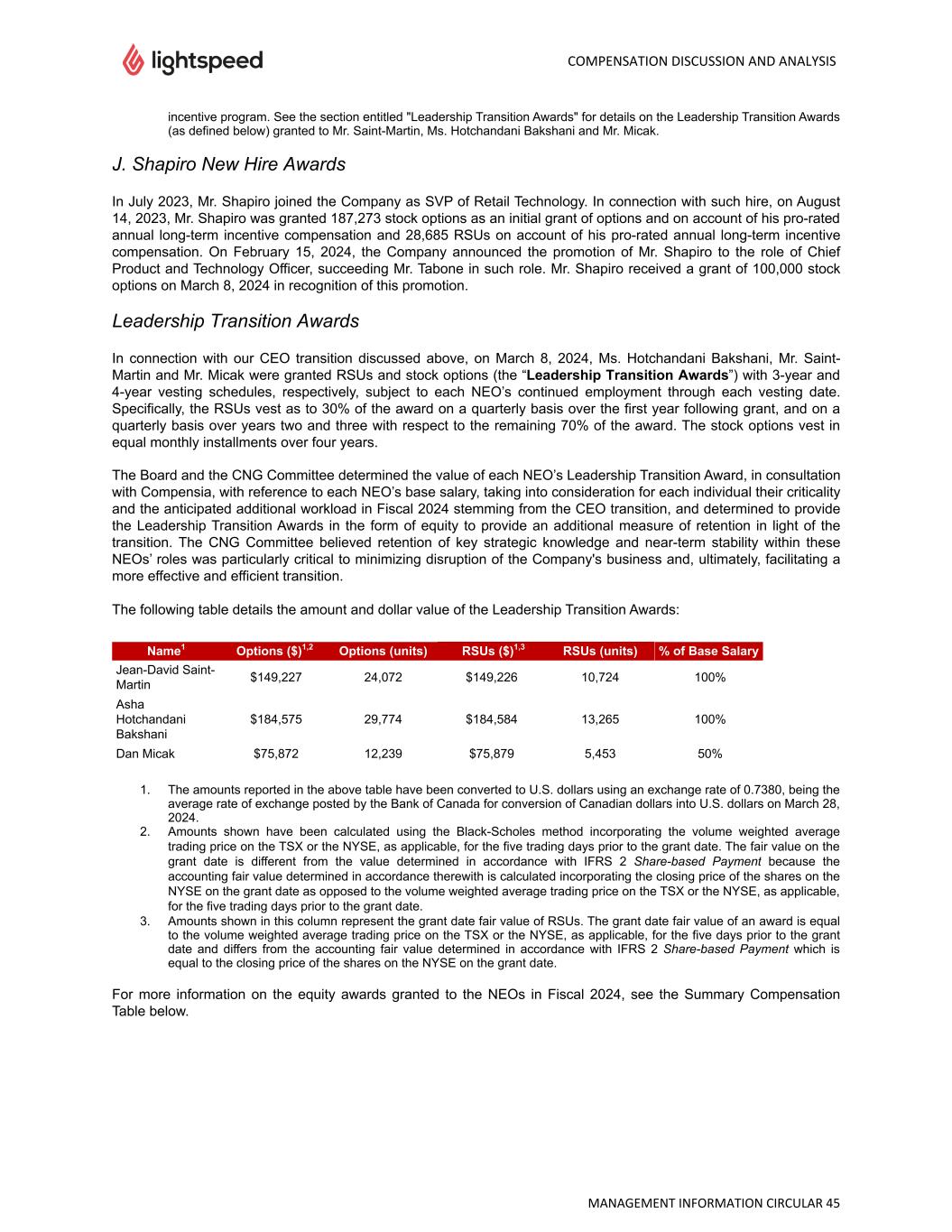 incentive program. See the section entitled "Leadership Transition Awards" for details on the Leadership Transition Awards (as defined below) granted to Mr. Saint-Martin, Ms. Hotchandani Bakshani and Mr. Micak. J. Shapiro New Hire Awards In July 2023, Mr. Shapiro joined the Company as SVP of Retail Technology. In connection with such hire, on August 14, 2023, Mr. Shapiro was granted 187,273 stock options as an initial grant of options and on account of his pro-rated annual long-term incentive compensation and 28,685 RSUs on account of his pro-rated annual long-term incentive compensation. On February 15, 2024, the Company announced the promotion of Mr. Shapiro to the role of Chief Product and Technology Officer, succeeding Mr. Tabone in such role. Mr. Shapiro received a grant of 100,000 stock options on March 8, 2024 in recognition of this promotion. Leadership Transition Awards In connection with our CEO transition discussed above, on March 8, 2024, Ms. Hotchandani Bakshani, Mr. Saint- Martin and Mr. Micak were granted RSUs and stock options (the “Leadership Transition Awards”) with 3-year and 4-year vesting schedules, respectively, subject to each NEO’s continued employment through each vesting date. Specifically, the RSUs vest as to 30% of the award on a quarterly basis over the first year following grant, and on a quarterly basis over years two and three with respect to the remaining 70% of the award. The stock options vest in equal monthly installments over four years. The Board and the CNG Committee determined the value of each NEO’s Leadership Transition Award, in consultation with Compensia, with reference to each NEO’s base salary, taking into consideration for each individual their criticality and the anticipated additional workload in Fiscal 2024 stemming from the CEO transition, and determined to provide the Leadership Transition Awards in the form of equity to provide an additional measure of retention in light of the transition. The CNG Committee believed retention of key strategic knowledge and near-term stability within these NEOs’ roles was particularly critical to minimizing disruption of the Company's business and, ultimately, facilitating a more effective and efficient transition. The following table details the amount and dollar value of the Leadership Transition Awards: Name1 Options ($)1,2 Options (units) RSUs ($)1,3 RSUs (units) % of Base Salary Jean-David Saint- Martin $149,227 24,072 $149,226 10,724 100% Asha Hotchandani Bakshani $184,575 29,774 $184,584 13,265 100% Dan Micak $75,872 12,239 $75,879 5,453 50% 1. The amounts reported in the above table have been converted to U.S. dollars using an exchange rate of 0.7380, being the average rate of exchange posted by the Bank of Canada for conversion of Canadian dollars into U.S. dollars on March 28, 2024. 2. Amounts shown have been calculated using the Black-Scholes method incorporating the volume weighted average trading price on the TSX or the NYSE, as applicable, for the five trading days prior to the grant date. The fair value on the grant date is different from the value determined in accordance with IFRS 2 Share-based Payment because the accounting fair value determined in accordance therewith is calculated incorporating the closing price of the shares on the NYSE on the grant date as opposed to the volume weighted average trading price on the TSX or the NYSE, as applicable, for the five trading days prior to the grant date. 3. Amounts shown in this column represent the grant date fair value of RSUs. The grant date fair value of an award is equal to the volume weighted average trading price on the TSX or the NYSE, as applicable, for the five days prior to the grant date and differs from the accounting fair value determined in accordance with IFRS 2 Share-based Payment which is equal to the closing price of the shares on the NYSE on the grant date. For more information on the equity awards granted to the NEOs in Fiscal 2024, see the Summary Compensation Table below. COMPENSATION DISCUSSION AND ANALYSIS MANAGEMENT INFORMATION CIRCULAR 45