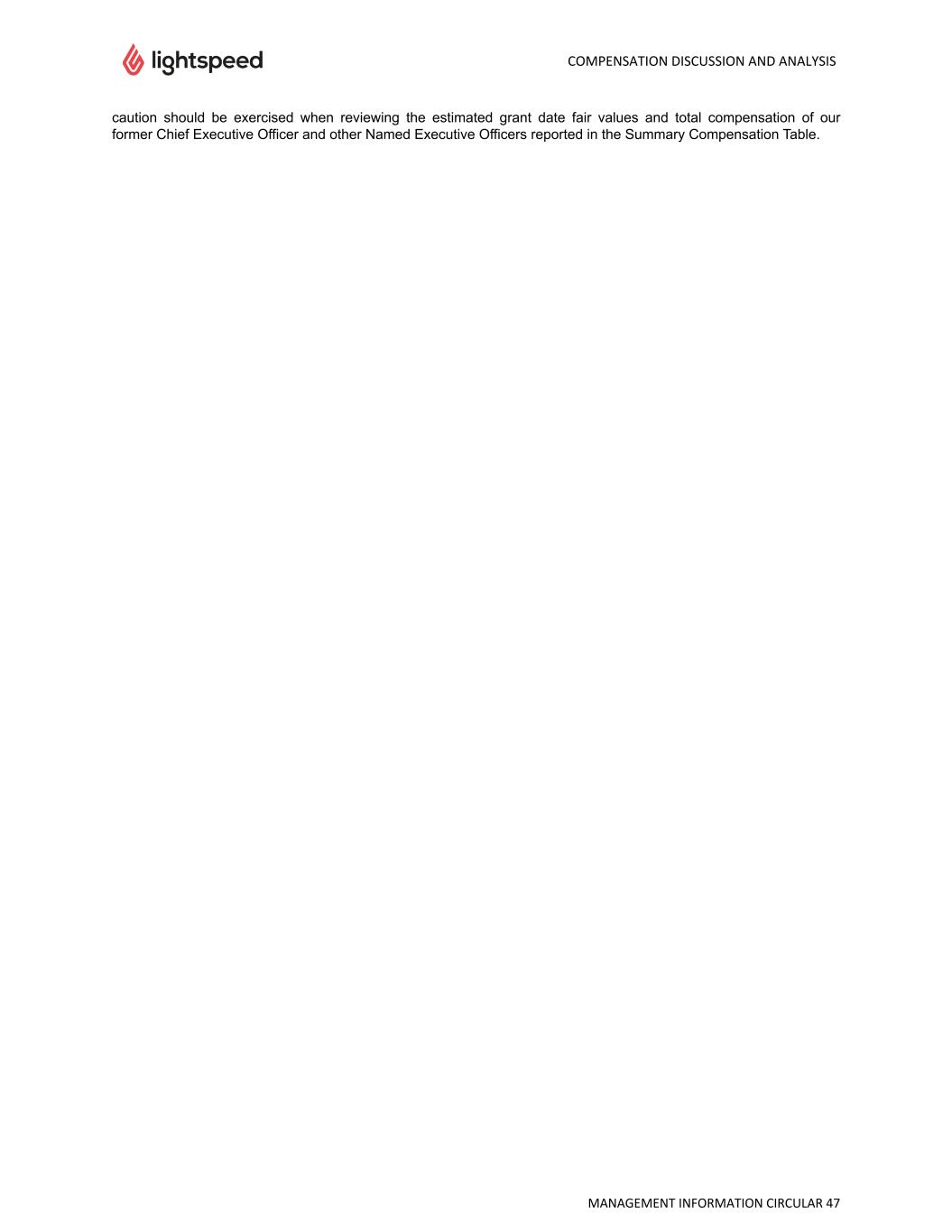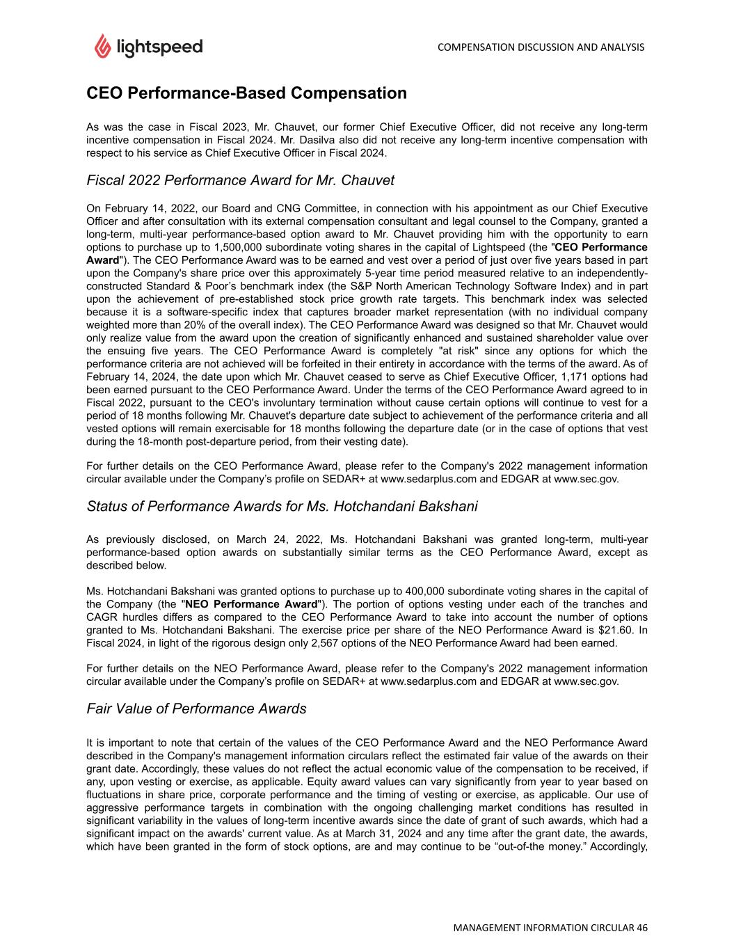 CEO Performance-Based Compensation As was the case in Fiscal 2023, Mr. Chauvet, our former Chief Executive Officer, did not receive any long-term incentive compensation in Fiscal 2024. Mr. Dasilva also did not receive any long-term incentive compensation with respect to his service as Chief Executive Officer in Fiscal 2024. Fiscal 2022 Performance Award for Mr. Chauvet On February 14, 2022, our Board and CNG Committee, in connection with his appointment as our Chief Executive Officer and after consultation with its external compensation consultant and legal counsel to the Company, granted a long-term, multi-year performance-based option award to Mr. Chauvet providing him with the opportunity to earn options to purchase up to 1,500,000 subordinate voting shares in the capital of Lightspeed (the "CEO Performance Award"). The CEO Performance Award was to be earned and vest over a period of just over five years based in part upon the Company's share price over this approximately 5-year time period measured relative to an independently- constructed Standard & Poor’s benchmark index (the S&P North American Technology Software Index) and in part upon the achievement of pre-established stock price growth rate targets. This benchmark index was selected because it is a software-specific index that captures broader market representation (with no individual company weighted more than 20% of the overall index). The CEO Performance Award was designed so that Mr. Chauvet would only realize value from the award upon the creation of significantly enhanced and sustained shareholder value over the ensuing five years. The CEO Performance Award is completely "at risk" since any options for which the performance criteria are not achieved will be forfeited in their entirety in accordance with the terms of the award. As of February 14, 2024, the date upon which Mr. Chauvet ceased to serve as Chief Executive Officer, 1,171 options had been earned pursuant to the CEO Performance Award. Under the terms of the CEO Performance Award agreed to in Fiscal 2022, pursuant to the CEO's involuntary termination without cause certain options will continue to vest for a period of 18 months following Mr. Chauvet's departure date subject to achievement of the performance criteria and all vested options will remain exercisable for 18 months following the departure date (or in the case of options that vest during the 18-month post-departure period, from their vesting date). For further details on the CEO Performance Award, please refer to the Company's 2022 management information circular available under the Company’s profile on SEDAR+ at www.sedarplus.com and EDGAR at www.sec.gov. Status of Performance Awards for Ms. Hotchandani Bakshani As previously disclosed, on March 24, 2022, Ms. Hotchandani Bakshani was granted long-term, multi-year performance-based option awards on substantially similar terms as the CEO Performance Award, except as described below. Ms. Hotchandani Bakshani was granted options to purchase up to 400,000 subordinate voting shares in the capital of the Company (the "NEO Performance Award"). The portion of options vesting under each of the tranches and CAGR hurdles differs as compared to the CEO Performance Award to take into account the number of options granted to Ms. Hotchandani Bakshani. The exercise price per share of the NEO Performance Award is $21.60. In Fiscal 2024, in light of the rigorous design only 2,567 options of the NEO Performance Award had been earned. For further details on the NEO Performance Award, please refer to the Company's 2022 management information circular available under the Company’s profile on SEDAR+ at www.sedarplus.com and EDGAR at www.sec.gov. Fair Value of Performance Awards It is important to note that certain of the values of the CEO Performance Award and the NEO Performance Award described in the Company's management information circulars reflect the estimated fair value of the awards on their grant date. Accordingly, these values do not reflect the actual economic value of the compensation to be received, if any, upon vesting or exercise, as applicable. Equity award values can vary significantly from year to year based on fluctuations in share price, corporate performance and the timing of vesting or exercise, as applicable. Our use of aggressive performance targets in combination with the ongoing challenging market conditions has resulted in significant variability in the values of long-term incentive awards since the date of grant of such awards, which had a significant impact on the awards' current value. As at March 31, 2024 and any time after the grant date, the awards, which have been granted in the form of stock options, are and may continue to be “out-of-the money.” Accordingly, COMPENSATION DISCUSSION AND ANALYSIS MANAGEMENT INFORMATION CIRCULAR 46
