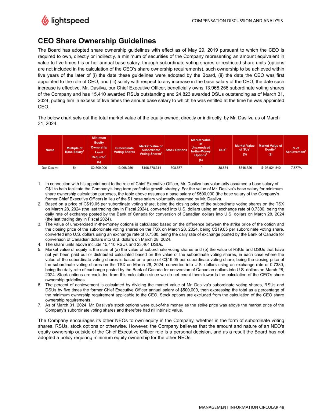 CEO Share Ownership Guidelines The Board has adopted share ownership guidelines with effect as of May 29, 2019 pursuant to which the CEO is required to own, directly or indirectly, a minimum of securities of the Company representing an amount equivalent in value to five times his or her annual base salary, through subordinate voting shares or restricted share units (options are not included in the calculation of the CEO’s share ownership requirements), such ownership to be achieved within five years of the later of (i) the date these guidelines were adopted by the Board, (ii) the date the CEO was first appointed to the role of CEO, and (iii) solely with respect to any increase in the base salary of the CEO, the date such increase is effective. Mr. Dasilva, our Chief Executive Officer, beneficially owns 13,968,256 subordinate voting shares of the Company and has 15,410 awarded RSUs outstanding and 24,823 awarded DSUs outstanding as of March 31, 2024, putting him in excess of five times the annual base salary to which he was entitled at the time he was appointed CEO. The below chart sets out the total market value of the equity owned, directly or indirectly, by Mr. Dasilva as of March 31, 2024. Name Multiple of Base Salary1 Minimum Equity Ownership Level Required1 ($) Subordinate Voting Shares Market Value of Subordinate Voting Shares2 Stock Options Market Value of Unexercised In-the-Money Options3 ($) SUs4 Market Value of SUs2 ($) Market Value of Equity5 ($) % of Achievement6 Dax Dasilva 5x $2,500,000 13,968,256 $196,378,314 508,587 -7 38,874 $546,526 $196,924,840 7,877% 1. In connection with his appointment to the role of Chief Executive Officer, Mr. Dasilva has voluntarily assumed a base salary of C$1 to help facilitate the Company's long term profitable growth strategy. For the value of Mr. Dasilva's base salary for minimum share ownership calculation purposes, the table above assumes a base salary of $500,000 (the base salary of the Company's former Chief Executive Officer) in lieu of the $1 base salary voluntarily assumed by Mr. Dasilva. 2. Based on a price of C$19.05 per subordinate voting share, being the closing price of the subordinate voting shares on the TSX on March 28, 2024 (the last trading day in Fiscal 2024), converted into U.S. dollars using an exchange rate of 0.7380, being the daily rate of exchange posted by the Bank of Canada for conversion of Canadian dollars into U.S. dollars on March 28, 2024 (the last trading day in Fiscal 2024). 3. The value of unexercised in-the-money options is calculated based on the difference between the strike price of the option and the closing price of the subordinate voting shares on the TSX on March 28, 2024, being C$19.05 per subordinate voting share, converted into U.S. dollars using an exchange rate of 0.7380, being the daily rate of exchange posted by the Bank of Canada for conversion of Canadian dollars into U.S. dollars on March 28, 2024. 4. The share units above include 15,410 RSUs and 23,464 DSUs. 5. Market value of equity is the sum of (a) the value of subordinate voting shares and (b) the value of RSUs and DSUs that have not yet been paid out or distributed calculated based on the value of the subordinate voting shares, in each case where the value of the subordinate voting shares is based on a price of C$19.05 per subordinate voting share, being the closing price of the subordinate voting shares on the TSX on March 28, 2024, converted into U.S. dollars using an exchange rate of 0.7380, being the daily rate of exchange posted by the Bank of Canada for conversion of Canadian dollars into U.S. dollars on March 28, 2024. Stock options are excluded from this calculation since we do not count them towards the calculation of the CEO’s share ownership guidelines. 6. The percent of achievement is calculated by dividing the market value of Mr. Dasilva's subordinate voting shares, RSUs and DSUs by five times the former Chief Executive Officer annual salary of $500,000, then expressing the total as a percentage of the minimum ownership requirement applicable to the CEO. Stock options are excluded from the calculation of the CEO share ownership requirements. 7. As of March 31, 2024, Mr. Dasilva's stock options were out-of-the money as the strike price was above the market price of the Company's subordinate voting shares and therefore had nil intrinsic value. The Company encourages its other NEOs to own equity in the Company, whether in the form of subordinate voting shares, RSUs, stock options or otherwise. However, the Company believes that the amount and nature of an NEO's equity ownership outside of the Chief Executive Officer role is a personal decision, and as a result the Board has not adopted a policy requiring minimum equity ownership for the other NEOs. COMPENSATION DISCUSSION AND ANALYSIS MANAGEMENT INFORMATION CIRCULAR 48