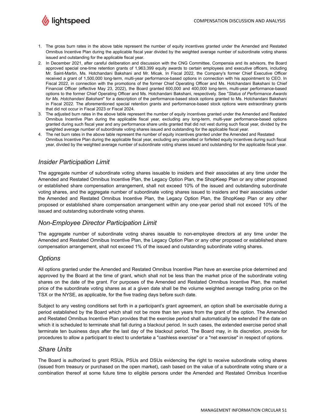 1. The gross burn rates in the above table represent the number of equity incentives granted under the Amended and Restated Omnibus Incentive Plan during the applicable fiscal year divided by the weighted average number of subordinate voting shares issued and outstanding for the applicable fiscal year. 2. In December 2021, after careful deliberation and discussion with the CNG Committee, Compensia and its advisors, the Board approved special one-time retention grants of 1,963,399 equity awards to certain employees and executive officers, including Mr. Saint-Martin, Ms. Hotchandani Bakshani and Mr. Micak. In Fiscal 2022, the Company's former Chief Executive Officer received a grant of 1,500,000 long-term, multi-year performance-based options in connection with his appointment to CEO. In Fiscal 2022, in connection with the promotions of the former Chief Operating Officer and Ms. Hotchandani Bakshani to Chief Financial Officer (effective May 23, 2022), the Board granted 600,000 and 400,000 long-term, multi-year performance-based options to the former Chief Operating Officer and Ms. Hotchandani Bakshani, respectively. See "Status of Performance Awards for Ms. Hotchandani Bakshani" for a description of the performance-based stock options granted to Ms. Hotchandani Bakshani in Fiscal 2022. The aforementioned special retention grants and performance-based stock options were extraordinary grants that did not occur in Fiscal 2023 or Fiscal 2024. 3. The adjusted burn rates in the above table represent the number of equity incentives granted under the Amended and Restated Omnibus Incentive Plan during the applicable fiscal year, excluding any long-term, multi-year performance-based options granted during such fiscal year and any performance share units granted that did not vest during such fiscal year, divided by the weighted average number of subordinate voting shares issued and outstanding for the applicable fiscal year. 4. The net burn rates in the above table represent the number of equity incentives granted under the Amended and Restated Omnibus Incentive Plan during the applicable fiscal year, excluding any cancelled or forfeited equity incentives during such fiscal year, divided by the weighted average number of subordinate voting shares issued and outstanding for the applicable fiscal year. Insider Participation Limit The aggregate number of subordinate voting shares issuable to insiders and their associates at any time under the Amended and Restated Omnibus Incentive Plan, the Legacy Option Plan, the ShopKeep Plan or any other proposed or established share compensation arrangement, shall not exceed 10% of the issued and outstanding subordinate voting shares, and the aggregate number of subordinate voting shares issued to insiders and their associates under the Amended and Restated Omnibus Incentive Plan, the Legacy Option Plan, the ShopKeep Plan or any other proposed or established share compensation arrangement within any one-year period shall not exceed 10% of the issued and outstanding subordinate voting shares. Non-Employee Director Participation Limit The aggregate number of subordinate voting shares issuable to non-employee directors at any time under the Amended and Restated Omnibus Incentive Plan, the Legacy Option Plan or any other proposed or established share compensation arrangement, shall not exceed 1% of the issued and outstanding subordinate voting shares. Options All options granted under the Amended and Restated Omnibus Incentive Plan have an exercise price determined and approved by the Board at the time of grant, which shall not be less than the market price of the subordinate voting shares on the date of the grant. For purposes of the Amended and Restated Omnibus Incentive Plan, the market price of the subordinate voting shares as at a given date shall be the volume weighted average trading price on the TSX or the NYSE, as applicable, for the five trading days before such date. Subject to any vesting conditions set forth in a participant’s grant agreement, an option shall be exercisable during a period established by the Board which shall not be more than ten years from the grant of the option. The Amended and Restated Omnibus Incentive Plan provides that the exercise period shall automatically be extended if the date on which it is scheduled to terminate shall fall during a blackout period. In such cases, the extended exercise period shall terminate ten business days after the last day of the blackout period. The Board may, in its discretion, provide for procedures to allow a participant to elect to undertake a "cashless exercise" or a "net exercise" in respect of options. Share Units The Board is authorized to grant RSUs, PSUs and DSUs evidencing the right to receive subordinate voting shares (issued from treasury or purchased on the open market), cash based on the value of a subordinate voting share or a combination thereof at some future time to eligible persons under the Amended and Restated Omnibus Incentive COMPENSATION DISCUSSION AND ANALYSIS MANAGEMENT INFORMATION CIRCULAR 51