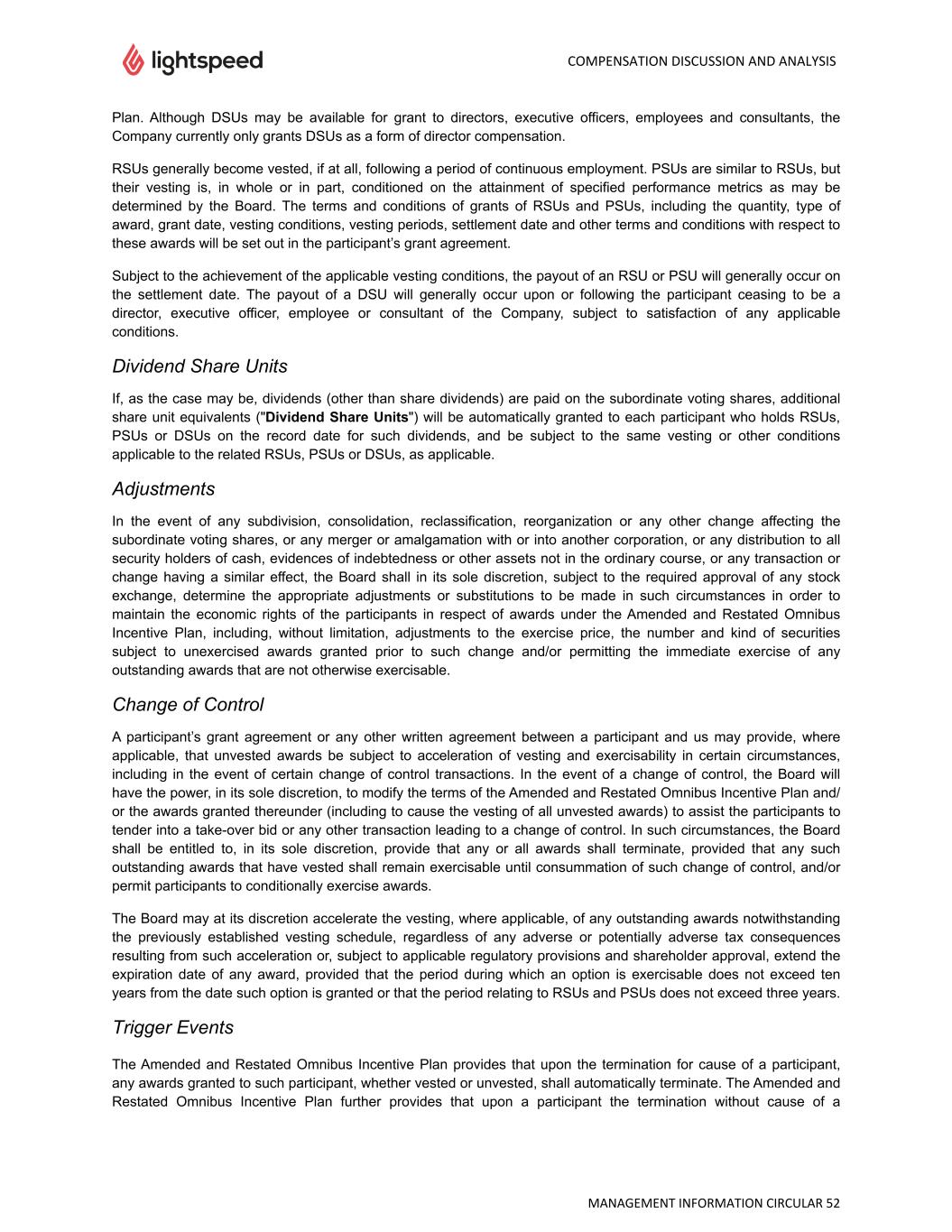 Plan. Although DSUs may be available for grant to directors, executive officers, employees and consultants, the Company currently only grants DSUs as a form of director compensation. RSUs generally become vested, if at all, following a period of continuous employment. PSUs are similar to RSUs, but their vesting is, in whole or in part, conditioned on the attainment of specified performance metrics as may be determined by the Board. The terms and conditions of grants of RSUs and PSUs, including the quantity, type of award, grant date, vesting conditions, vesting periods, settlement date and other terms and conditions with respect to these awards will be set out in the participant’s grant agreement. Subject to the achievement of the applicable vesting conditions, the payout of an RSU or PSU will generally occur on the settlement date. The payout of a DSU will generally occur upon or following the participant ceasing to be a director, executive officer, employee or consultant of the Company, subject to satisfaction of any applicable conditions. Dividend Share Units If, as the case may be, dividends (other than share dividends) are paid on the subordinate voting shares, additional share unit equivalents ("Dividend Share Units") will be automatically granted to each participant who holds RSUs, PSUs or DSUs on the record date for such dividends, and be subject to the same vesting or other conditions applicable to the related RSUs, PSUs or DSUs, as applicable. Adjustments In the event of any subdivision, consolidation, reclassification, reorganization or any other change affecting the subordinate voting shares, or any merger or amalgamation with or into another corporation, or any distribution to all security holders of cash, evidences of indebtedness or other assets not in the ordinary course, or any transaction or change having a similar effect, the Board shall in its sole discretion, subject to the required approval of any stock exchange, determine the appropriate adjustments or substitutions to be made in such circumstances in order to maintain the economic rights of the participants in respect of awards under the Amended and Restated Omnibus Incentive Plan, including, without limitation, adjustments to the exercise price, the number and kind of securities subject to unexercised awards granted prior to such change and/or permitting the immediate exercise of any outstanding awards that are not otherwise exercisable. Change of Control A participant’s grant agreement or any other written agreement between a participant and us may provide, where applicable, that unvested awards be subject to acceleration of vesting and exercisability in certain circumstances, including in the event of certain change of control transactions. In the event of a change of control, the Board will have the power, in its sole discretion, to modify the terms of the Amended and Restated Omnibus Incentive Plan and/ or the awards granted thereunder (including to cause the vesting of all unvested awards) to assist the participants to tender into a take-over bid or any other transaction leading to a change of control. In such circumstances, the Board shall be entitled to, in its sole discretion, provide that any or all awards shall terminate, provided that any such outstanding awards that have vested shall remain exercisable until consummation of such change of control, and/or permit participants to conditionally exercise awards. The Board may at its discretion accelerate the vesting, where applicable, of any outstanding awards notwithstanding the previously established vesting schedule, regardless of any adverse or potentially adverse tax consequences resulting from such acceleration or, subject to applicable regulatory provisions and shareholder approval, extend the expiration date of any award, provided that the period during which an option is exercisable does not exceed ten years from the date such option is granted or that the period relating to RSUs and PSUs does not exceed three years. Trigger Events The Amended and Restated Omnibus Incentive Plan provides that upon the termination for cause of a participant, any awards granted to such participant, whether vested or unvested, shall automatically terminate. The Amended and Restated Omnibus Incentive Plan further provides that upon a participant the termination without cause of a COMPENSATION DISCUSSION AND ANALYSIS MANAGEMENT INFORMATION CIRCULAR 52