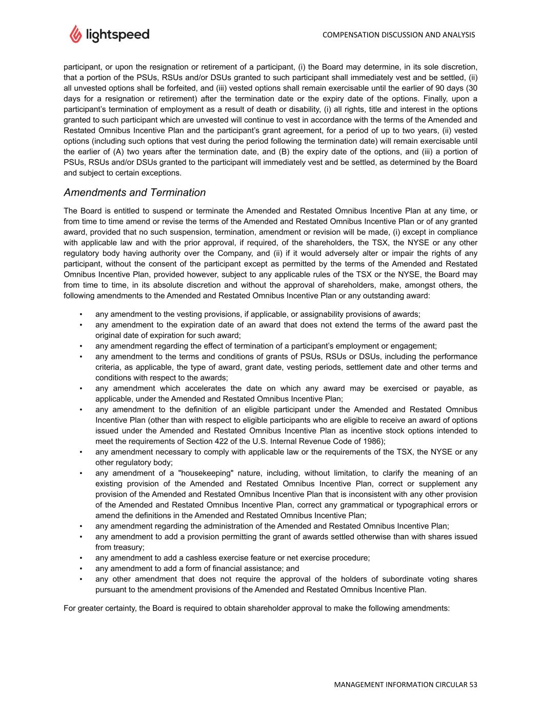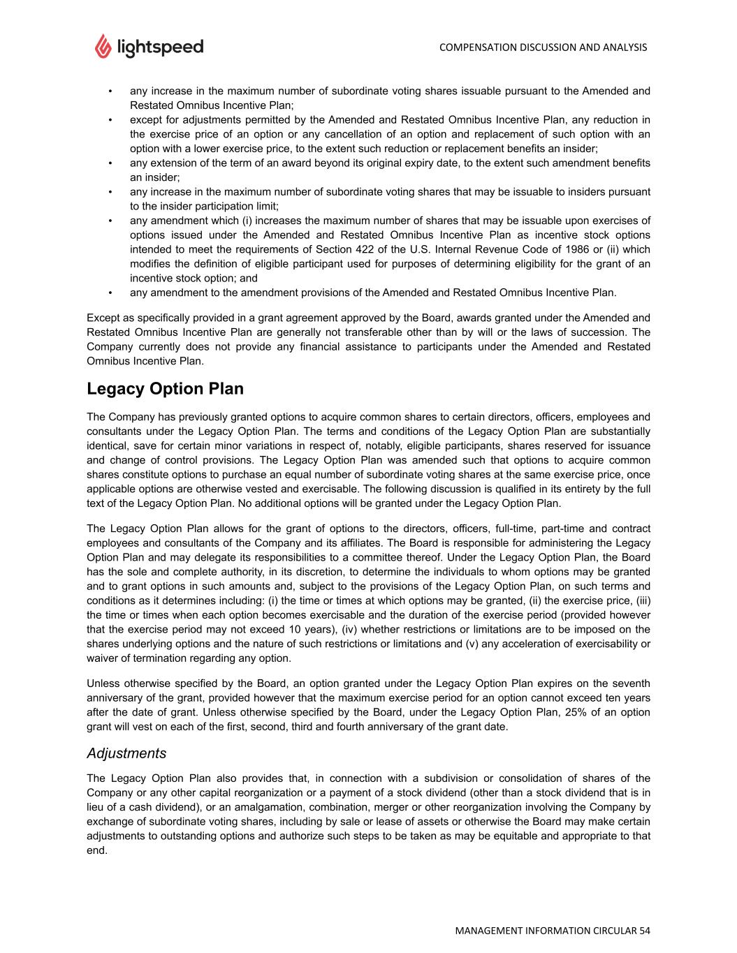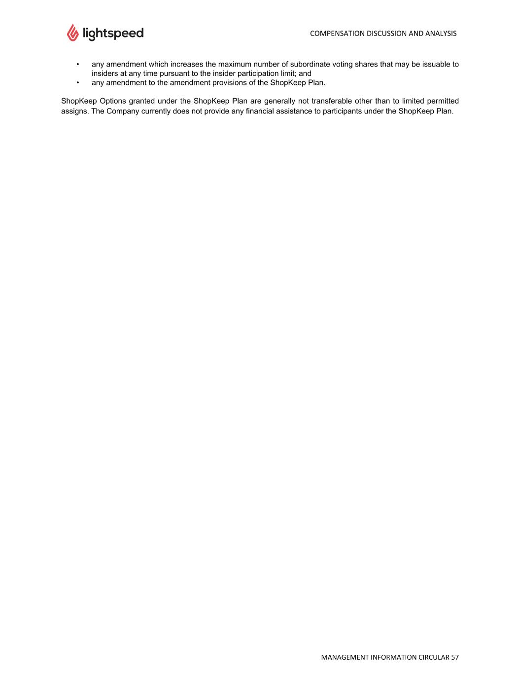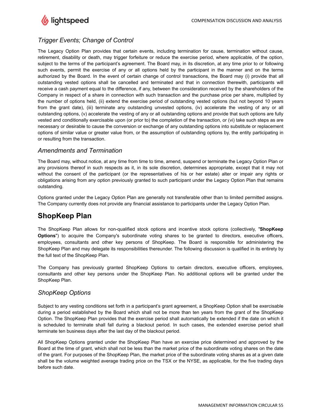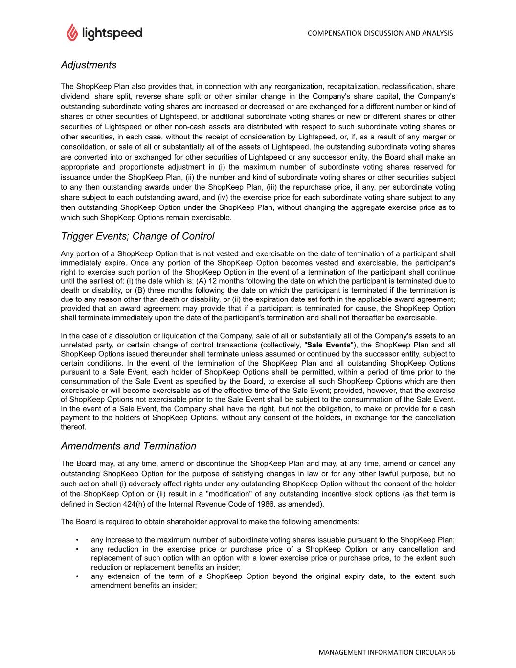 Adjustments The ShopKeep Plan also provides that, in connection with any reorganization, recapitalization, reclassification, share dividend, share split, reverse share split or other similar change in the Company's share capital, the Company's outstanding subordinate voting shares are increased or decreased or are exchanged for a different number or kind of shares or other securities of Lightspeed, or additional subordinate voting shares or new or different shares or other securities of Lightspeed or other non-cash assets are distributed with respect to such subordinate voting shares or other securities, in each case, without the receipt of consideration by Lightspeed, or, if, as a result of any merger or consolidation, or sale of all or substantially all of the assets of Lightspeed, the outstanding subordinate voting shares are converted into or exchanged for other securities of Lightspeed or any successor entity, the Board shall make an appropriate and proportionate adjustment in (i) the maximum number of subordinate voting shares reserved for issuance under the ShopKeep Plan, (ii) the number and kind of subordinate voting shares or other securities subject to any then outstanding awards under the ShopKeep Plan, (iii) the repurchase price, if any, per subordinate voting share subject to each outstanding award, and (iv) the exercise price for each subordinate voting share subject to any then outstanding ShopKeep Option under the ShopKeep Plan, without changing the aggregate exercise price as to which such ShopKeep Options remain exercisable. Trigger Events; Change of Control Any portion of a ShopKeep Option that is not vested and exercisable on the date of termination of a participant shall immediately expire. Once any portion of the ShopKeep Option becomes vested and exercisable, the participant's right to exercise such portion of the ShopKeep Option in the event of a termination of the participant shall continue until the earliest of: (i) the date which is: (A) 12 months following the date on which the participant is terminated due to death or disability, or (B) three months following the date on which the participant is terminated if the termination is due to any reason other than death or disability, or (ii) the expiration date set forth in the applicable award agreement; provided that an award agreement may provide that if a participant is terminated for cause, the ShopKeep Option shall terminate immediately upon the date of the participant's termination and shall not thereafter be exercisable. In the case of a dissolution or liquidation of the Company, sale of all or substantially all of the Company's assets to an unrelated party, or certain change of control transactions (collectively, "Sale Events"), the ShopKeep Plan and all ShopKeep Options issued thereunder shall terminate unless assumed or continued by the successor entity, subject to certain conditions. In the event of the termination of the ShopKeep Plan and all outstanding ShopKeep Options pursuant to a Sale Event, each holder of ShopKeep Options shall be permitted, within a period of time prior to the consummation of the Sale Event as specified by the Board, to exercise all such ShopKeep Options which are then exercisable or will become exercisable as of the effective time of the Sale Event; provided, however, that the exercise of ShopKeep Options not exercisable prior to the Sale Event shall be subject to the consummation of the Sale Event. In the event of a Sale Event, the Company shall have the right, but not the obligation, to make or provide for a cash payment to the holders of ShopKeep Options, without any consent of the holders, in exchange for the cancellation thereof. Amendments and Termination The Board may, at any time, amend or discontinue the ShopKeep Plan and may, at any time, amend or cancel any outstanding ShopKeep Option for the purpose of satisfying changes in law or for any other lawful purpose, but no such action shall (i) adversely affect rights under any outstanding ShopKeep Option without the consent of the holder of the ShopKeep Option or (ii) result in a "modification" of any outstanding incentive stock options (as that term is defined in Section 424(h) of the Internal Revenue Code of 1986, as amended). The Board is required to obtain shareholder approval to make the following amendments: • any increase to the maximum number of subordinate voting shares issuable pursuant to the ShopKeep Plan; • any reduction in the exercise price or purchase price of a ShopKeep Option or any cancellation and replacement of such option with an option with a lower exercise price or purchase price, to the extent such reduction or replacement benefits an insider; • any extension of the term of a ShopKeep Option beyond the original expiry date, to the extent such amendment benefits an insider; COMPENSATION DISCUSSION AND ANALYSIS MANAGEMENT INFORMATION CIRCULAR 56